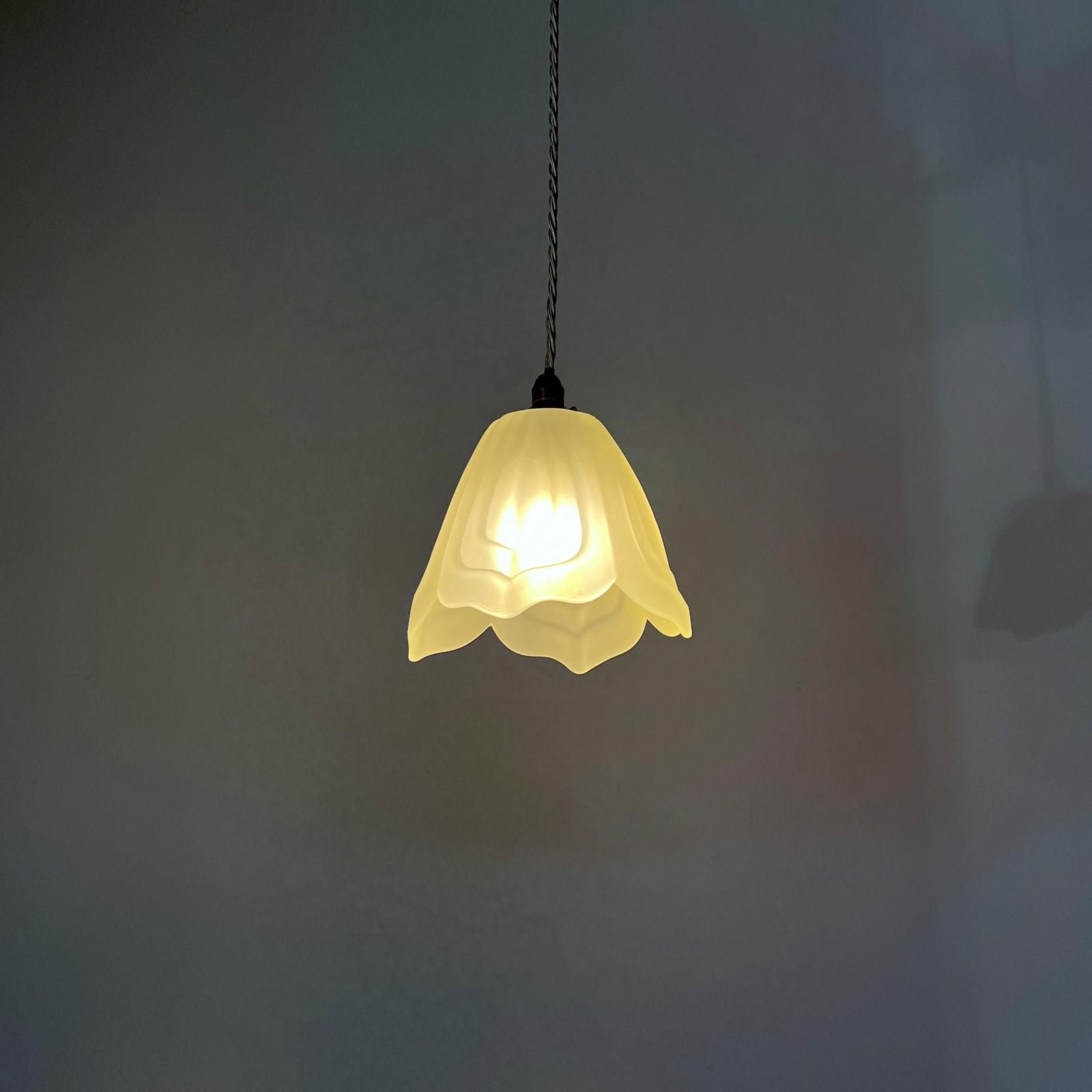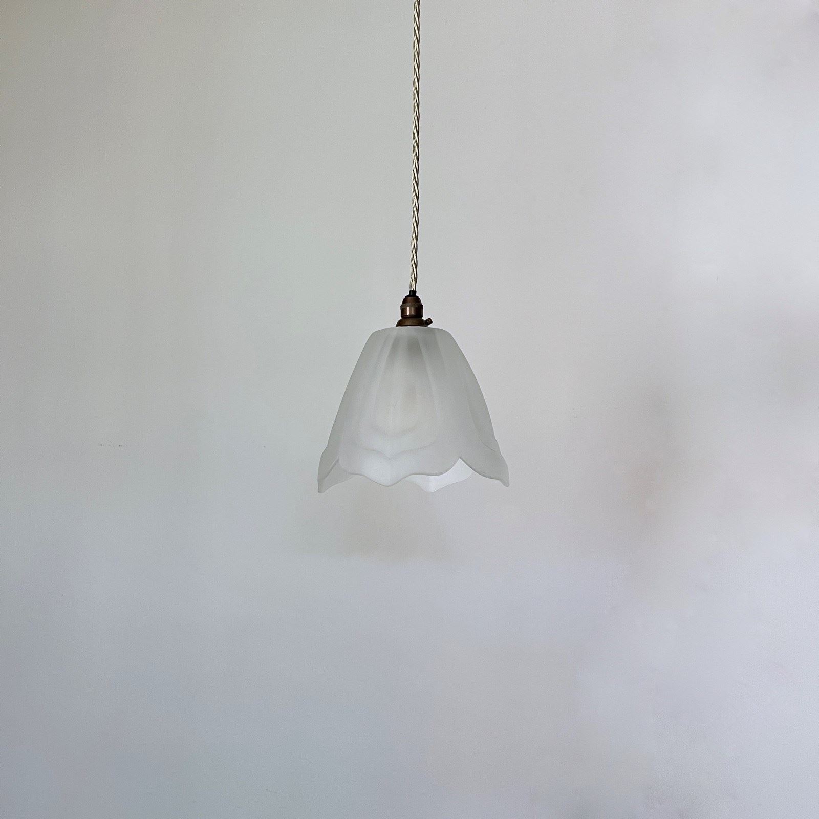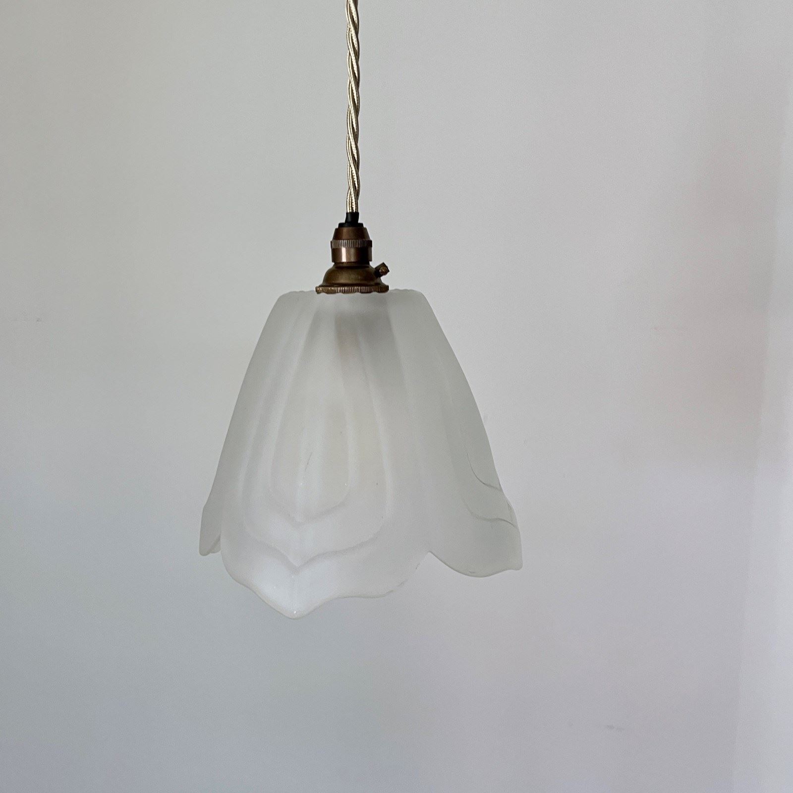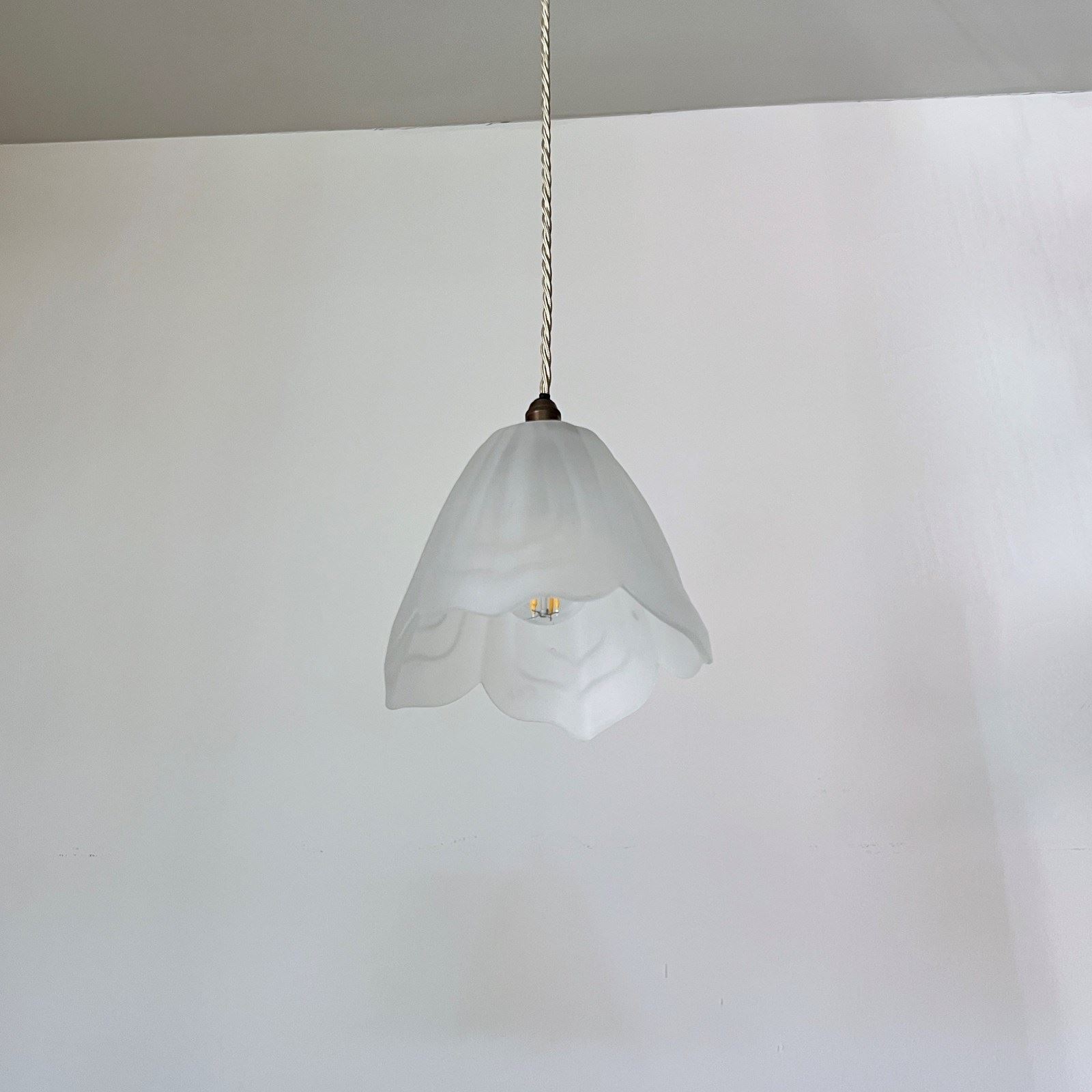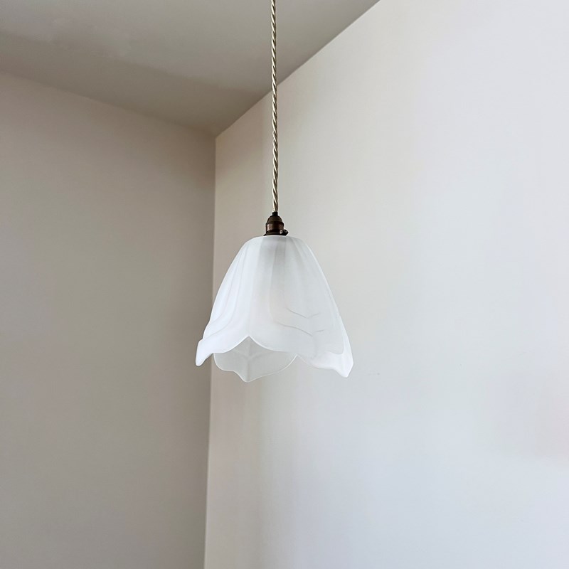 Frosted floral shade. Rewired with an antique brass finish fitting and beige braided flex. This shade requires one B22 lamp this is not included but can be supplied. The coloured flex can be changed to your preference and a matching ceiling fitting is supplied.