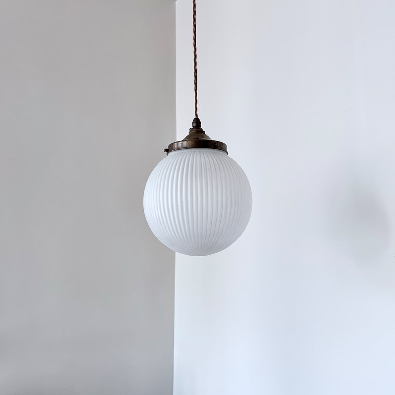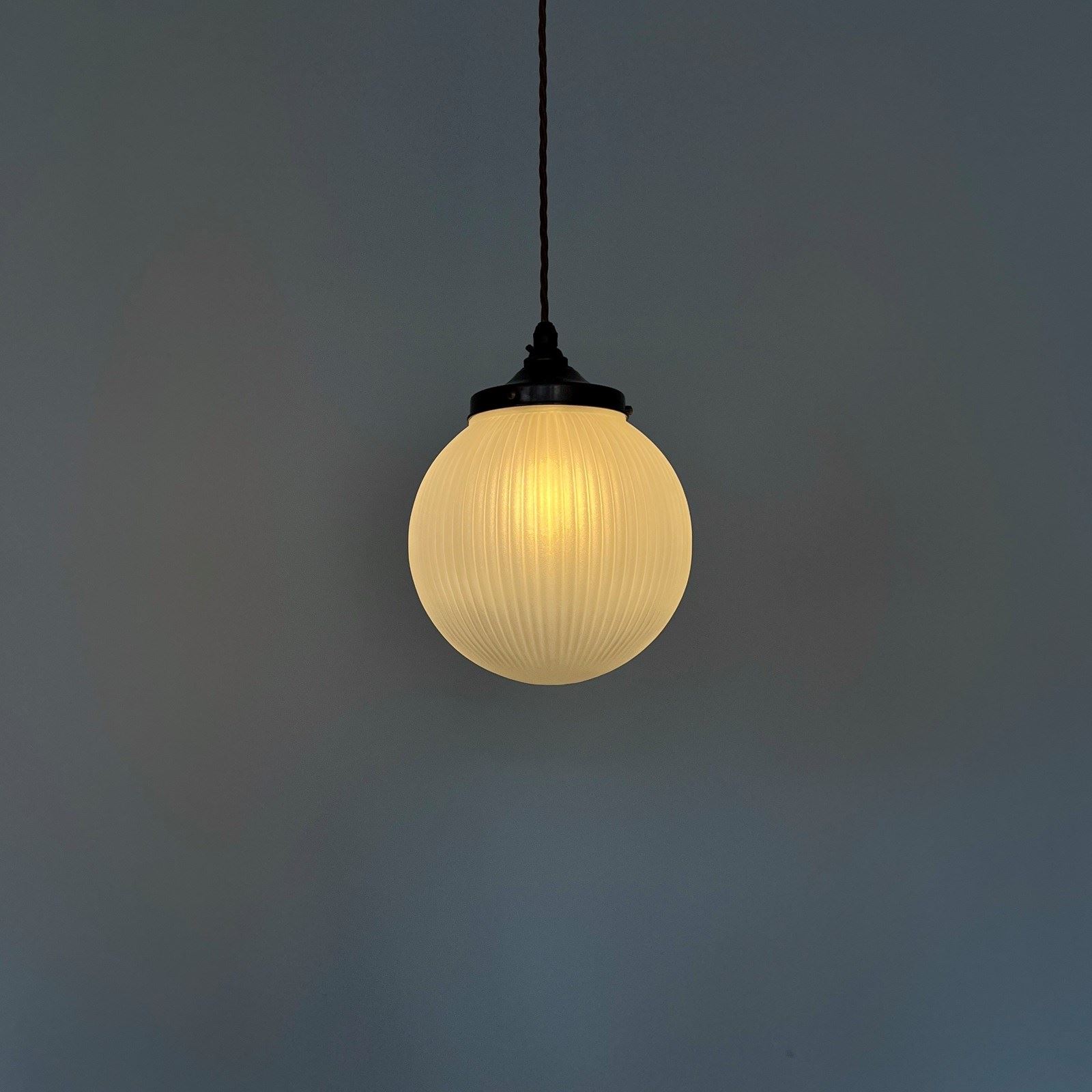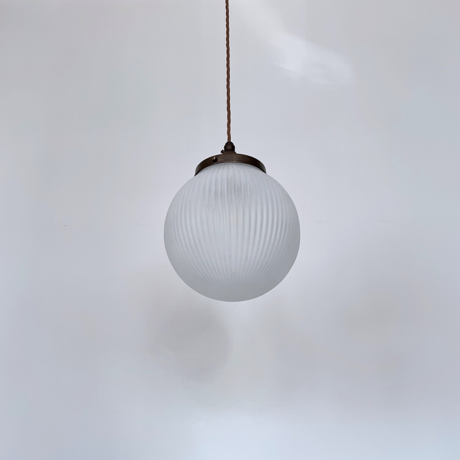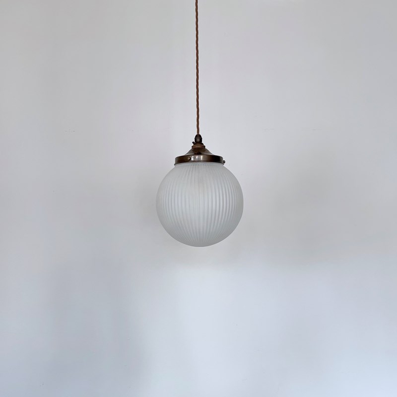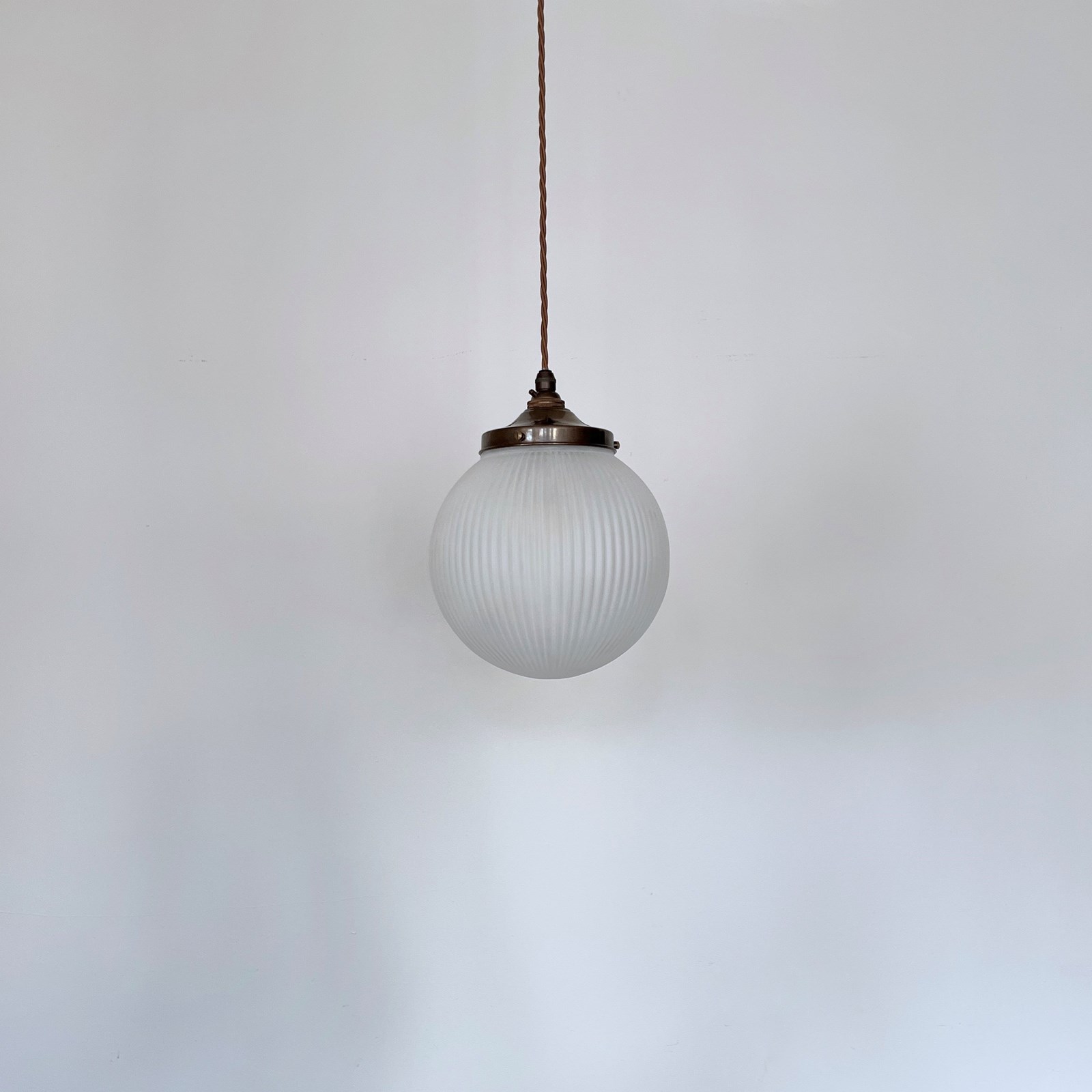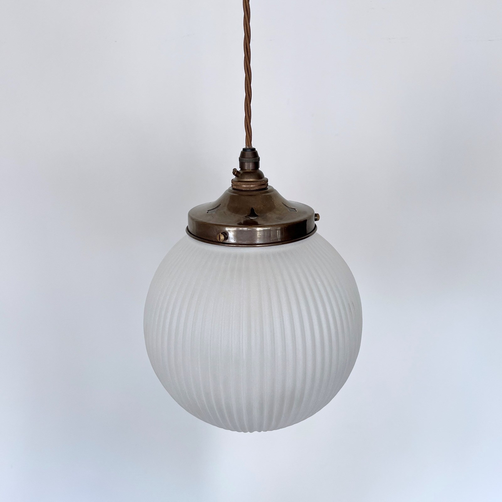 Newly made frosted glass ribbed globe shades. Each newly wired with an antique brass finish fitting and brown braided flex. Each shade requires one B22 lamp and a matching ceiling fitting is supplied. Multiples available. The braided flex can be changed to your preference.