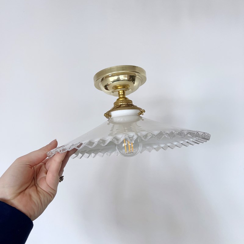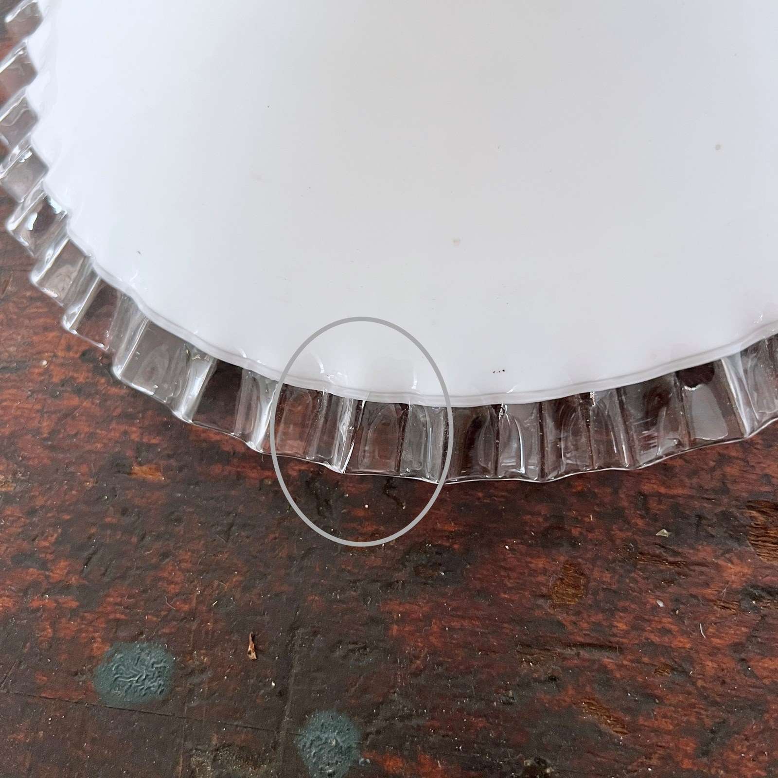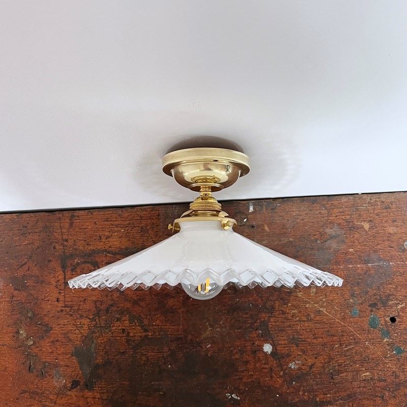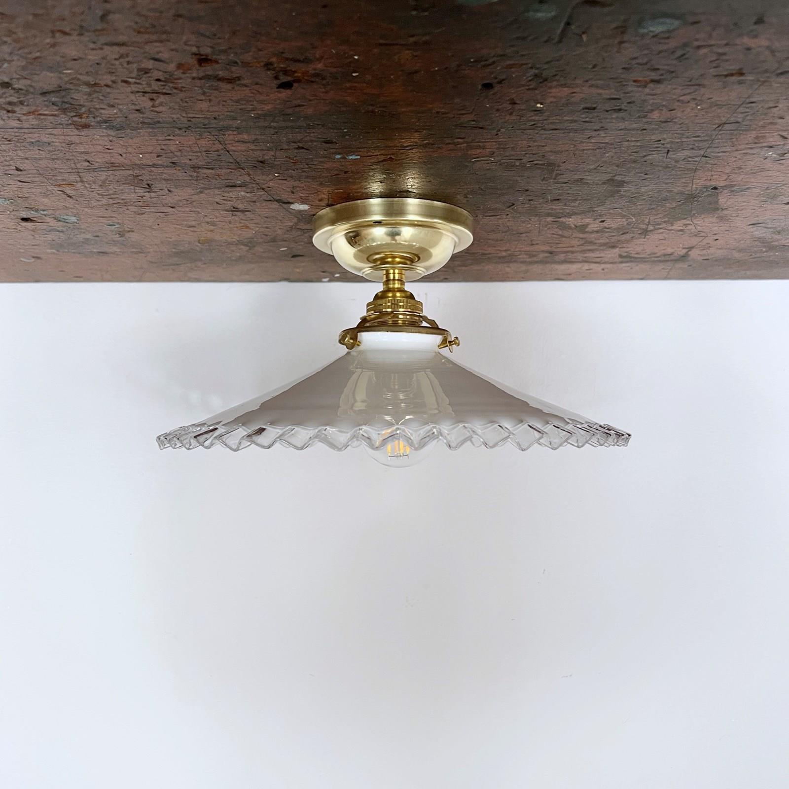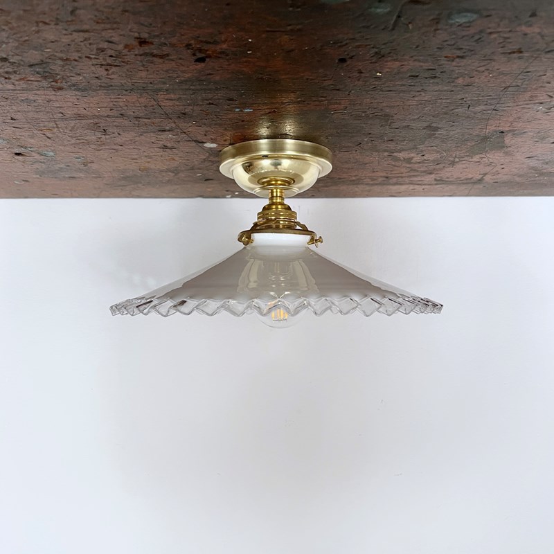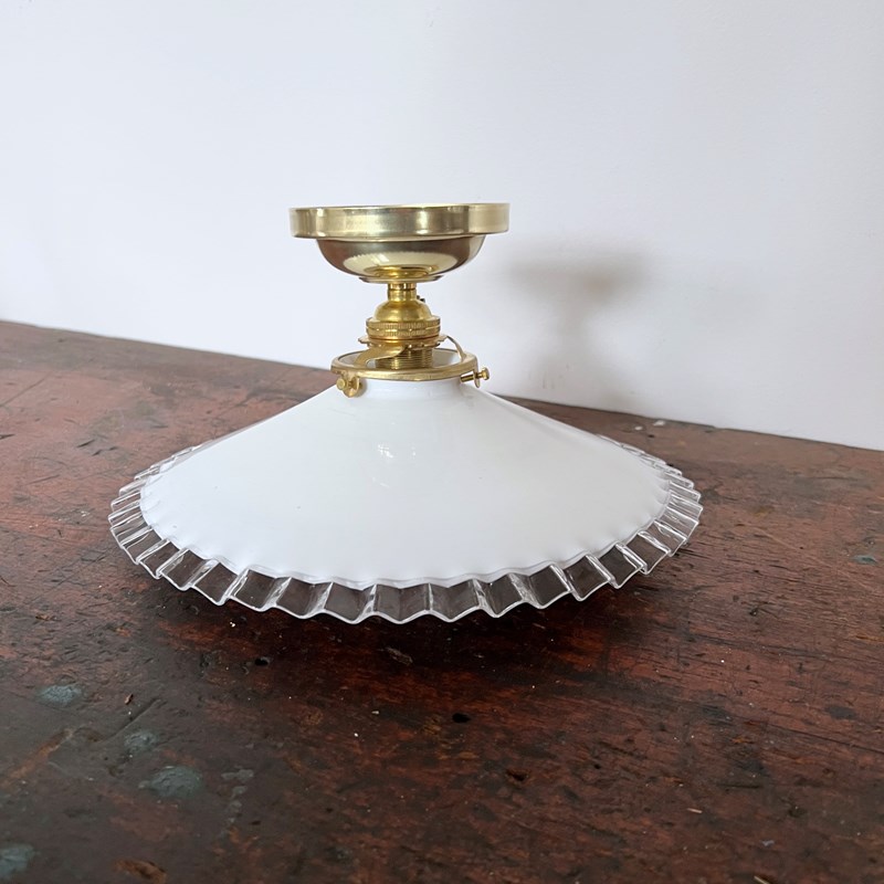 Frilled white glass shade with clear edge. The piece has a very small hairline split in the clear edge. Please see images. Rewired with a polished brass skeleton fitting. The shade has been wired to fit directly to the ceiling. The shade requires one b22 bulb. This is not included but can be supplied.