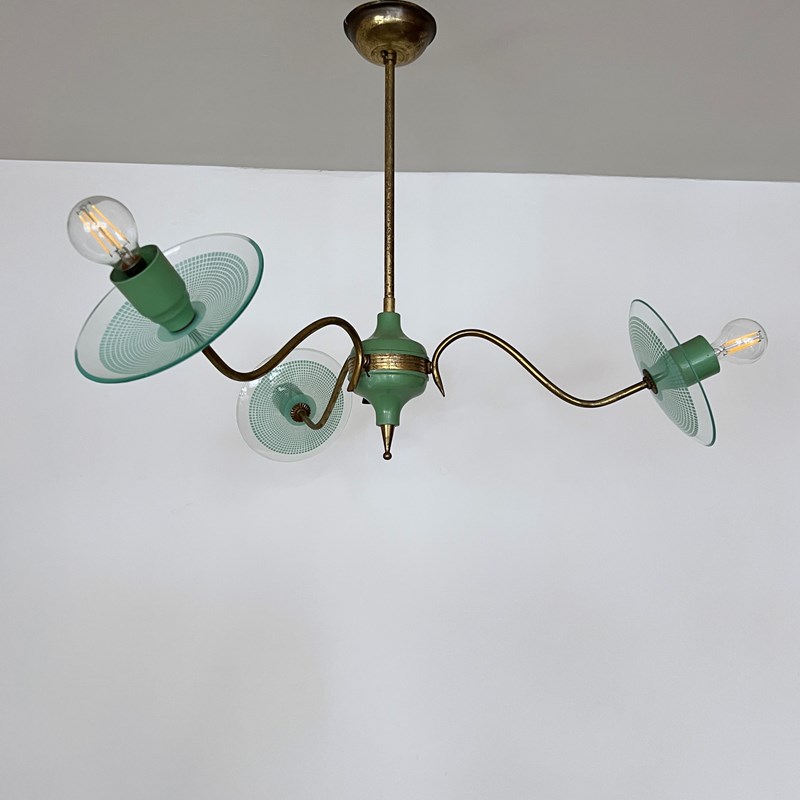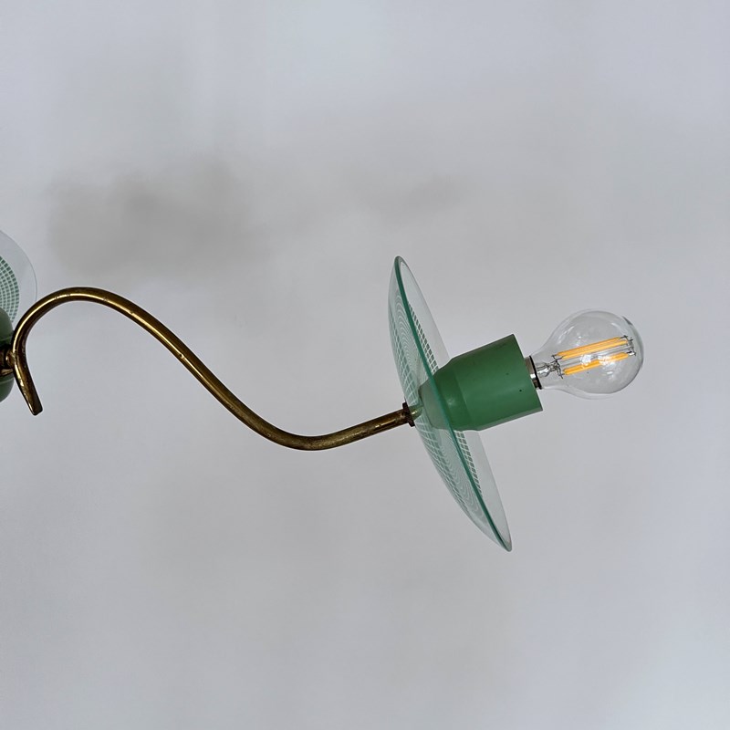 Vintage Italian mid-century modern chandelier from the 1950s, constructed with a brass structure and green painted metal accents. It features curved brass arms extending from a central core. Each light source is complemented by a clear glass disc with a textured pattern. The design is characteristic of Italian lighting manufacturers from that era, such as Stilnovo.