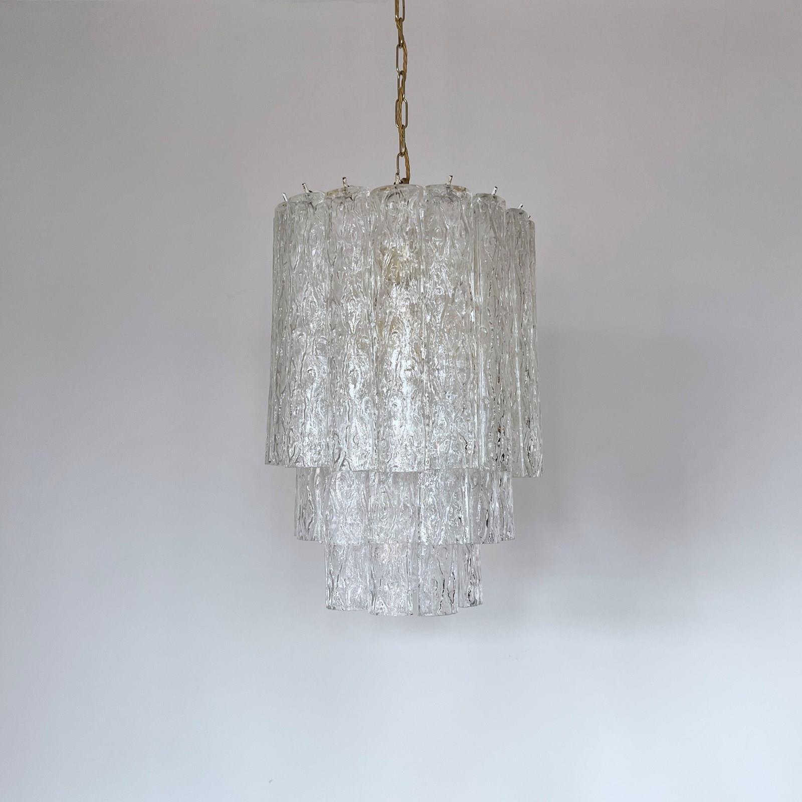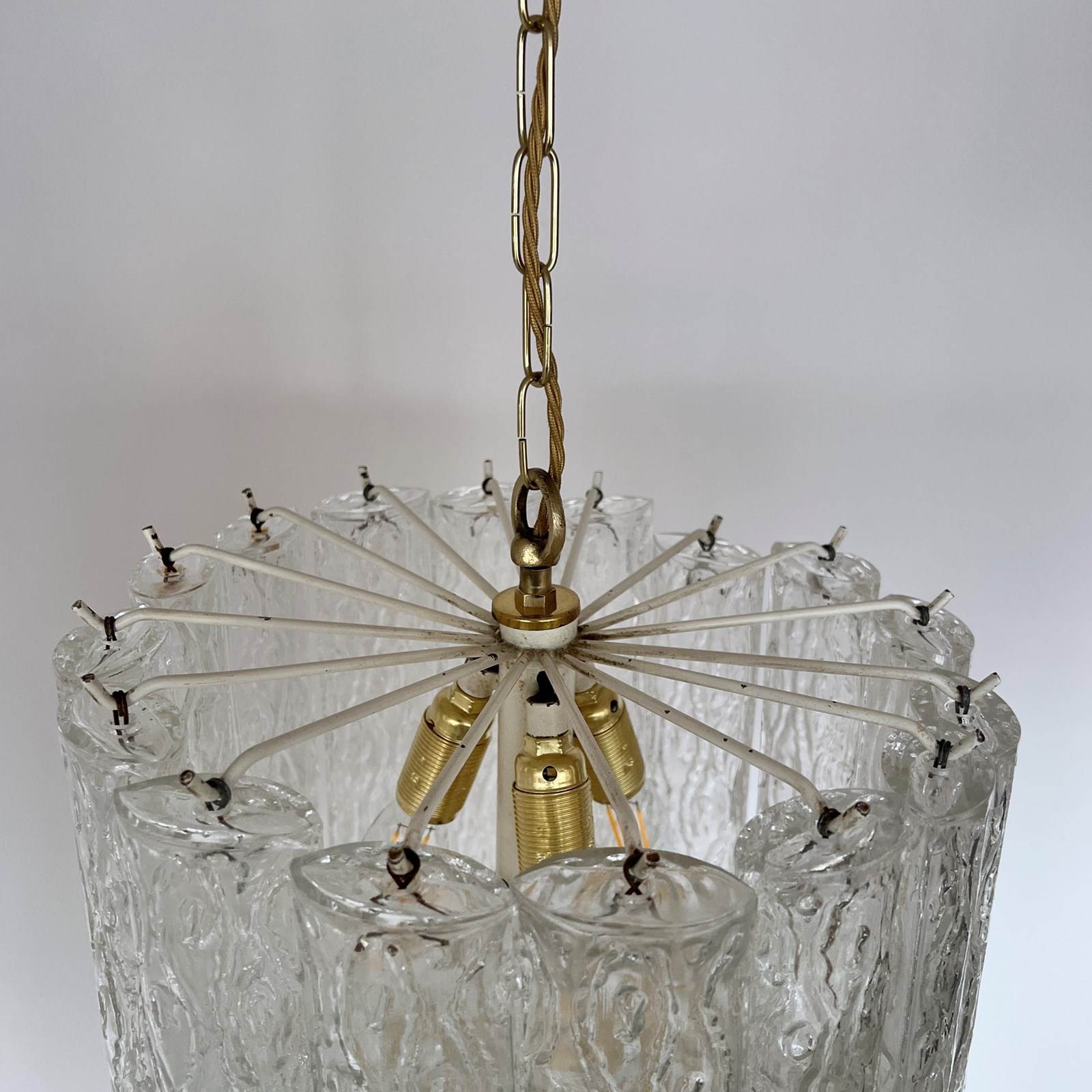 Murano clear glass chandelier made in Italy during the 1960s by the renowned designer Toni Zuccheri for Venini & Co. In very good vintage condition, the glass perfect with the frame showing some minor signs of wear that add character to its history. The piece comprises 36 individual glass tubular shades and requires six SES lamps. These are not included, but can be supplied.