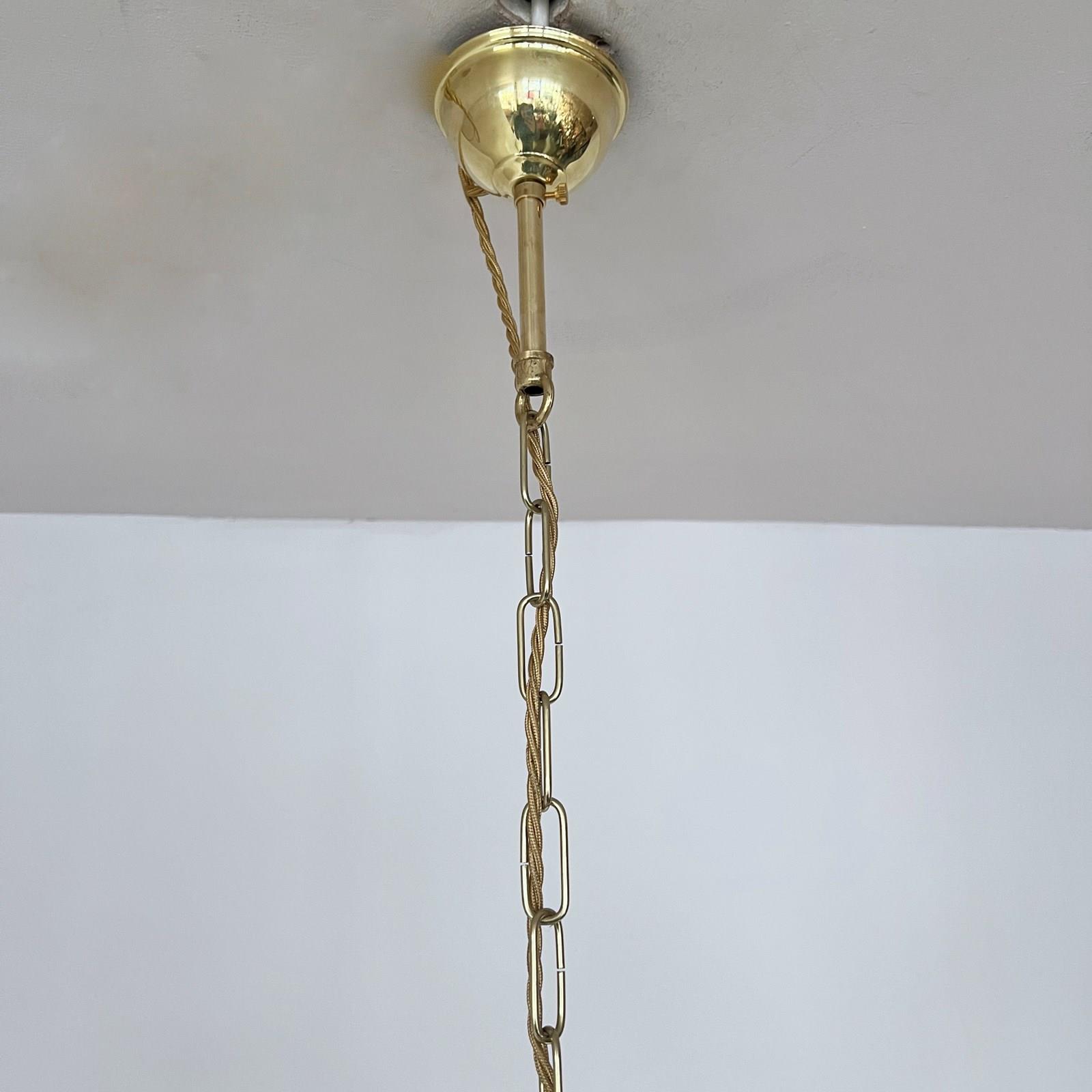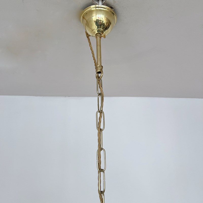 This chandelier has been fully restored and rewired here, in Stockport, near Manchester by our small team of experts and is now ready to be installed. We recommend that this chandelier is installed by an electrician and into a joist or a supporting noggin. To clean the chandelier dust the metal components regularly with a soft cloth. The glass shades can then be wiped with a glass wipe or a cloth that has been sprayed with glass cleaner. A final wipe with a paper towel will give a polished finish.