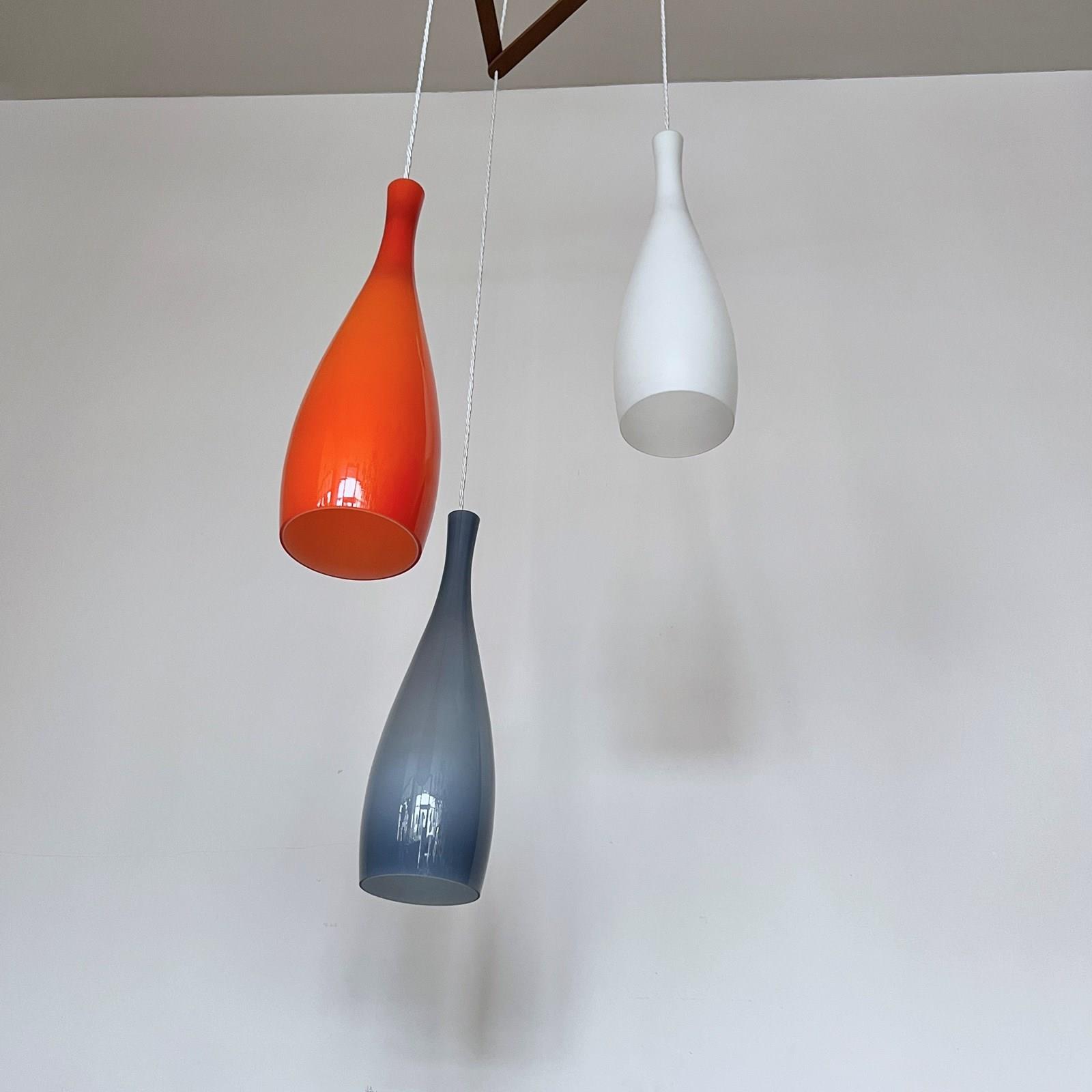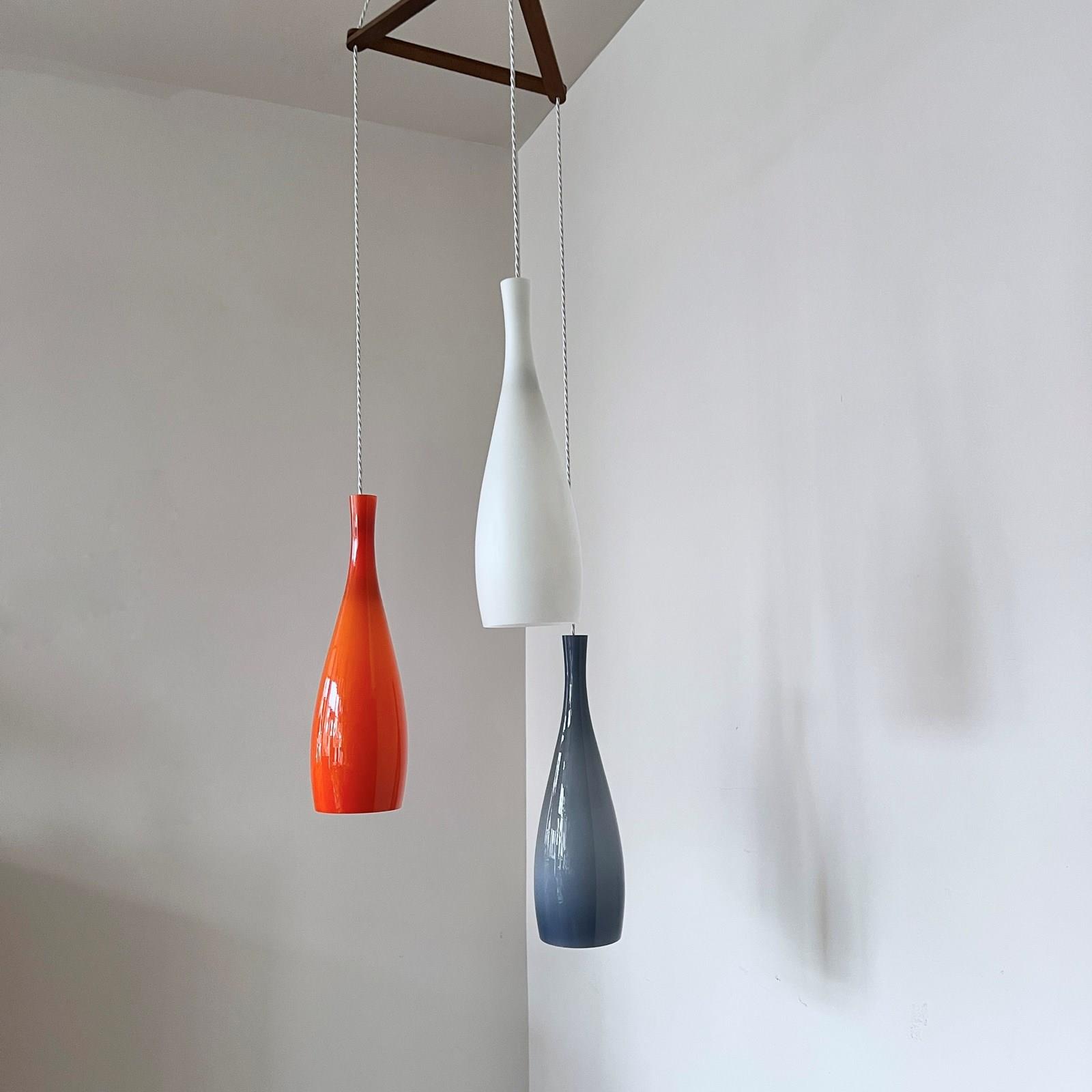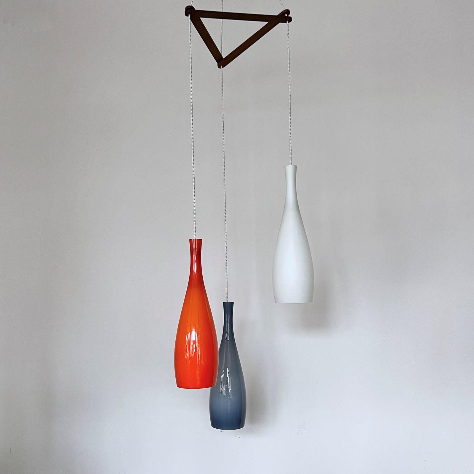 Jacob E. Bang chandelier featuring three hand-blown glass pendant lights in orange, blue, and white, designed for Fog & Mørup and manufactured by Holmegaard, Denmark in the 1960s. Original opaline glass shades with a teak wood triangular mounting frame and ceiling fitting. Newly rewired with white braided cable. The piece requires three B22 lamps. These are not included but can be supplied.