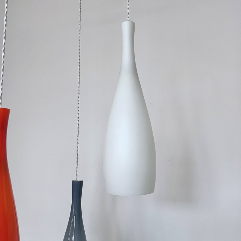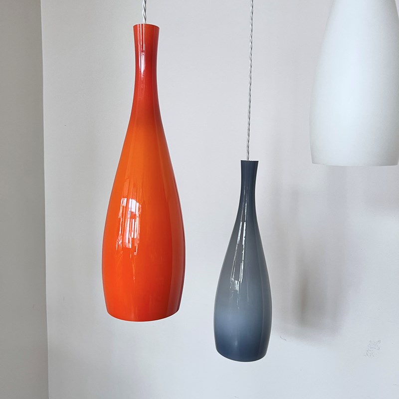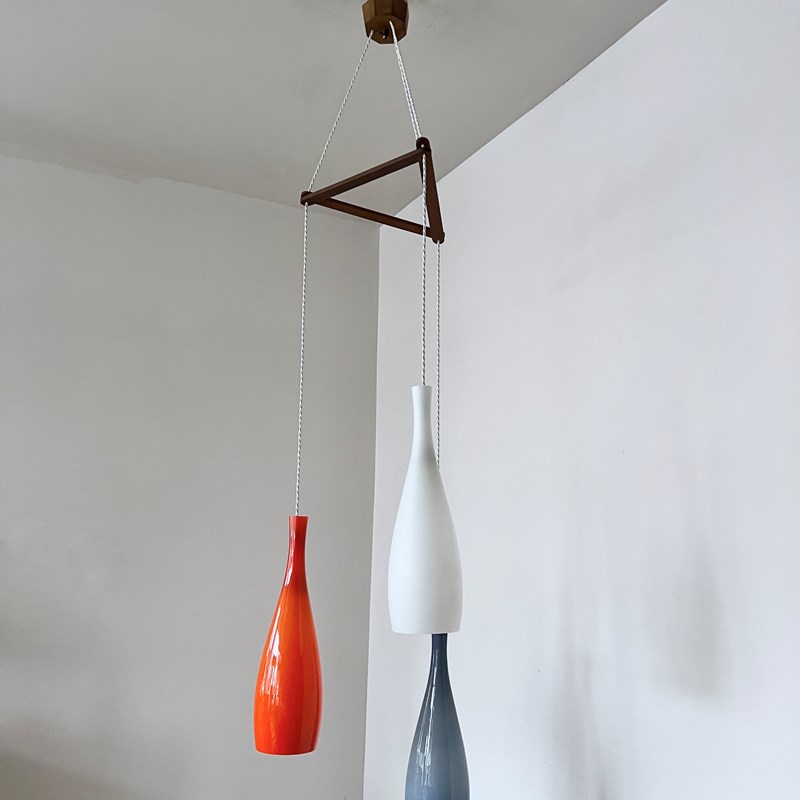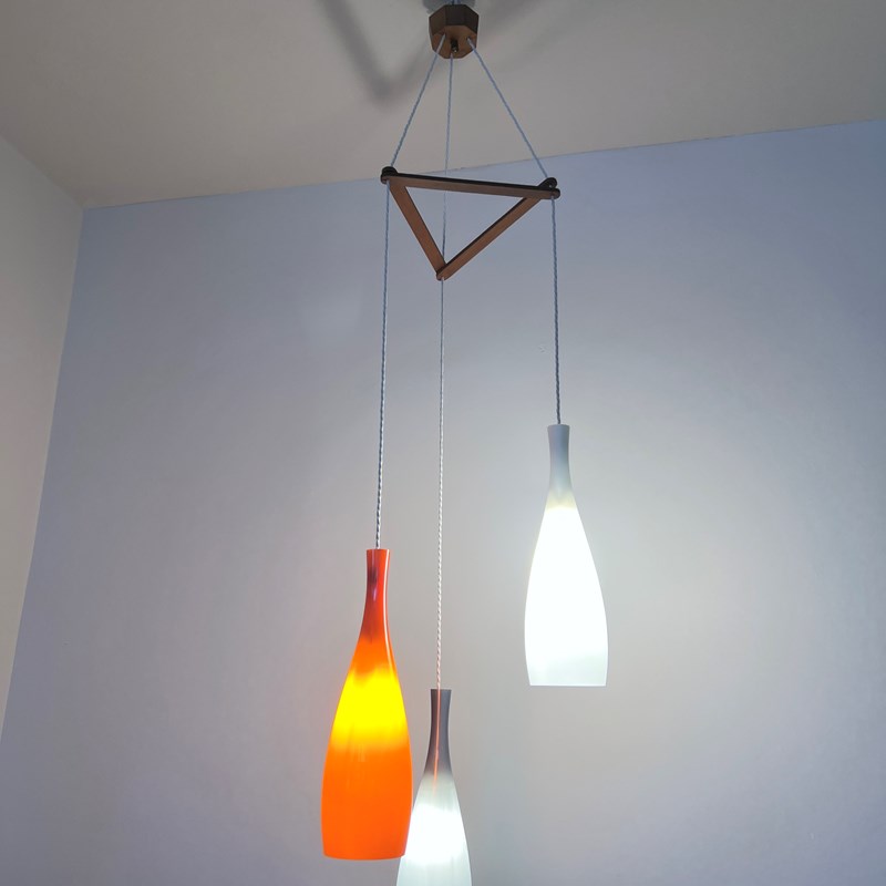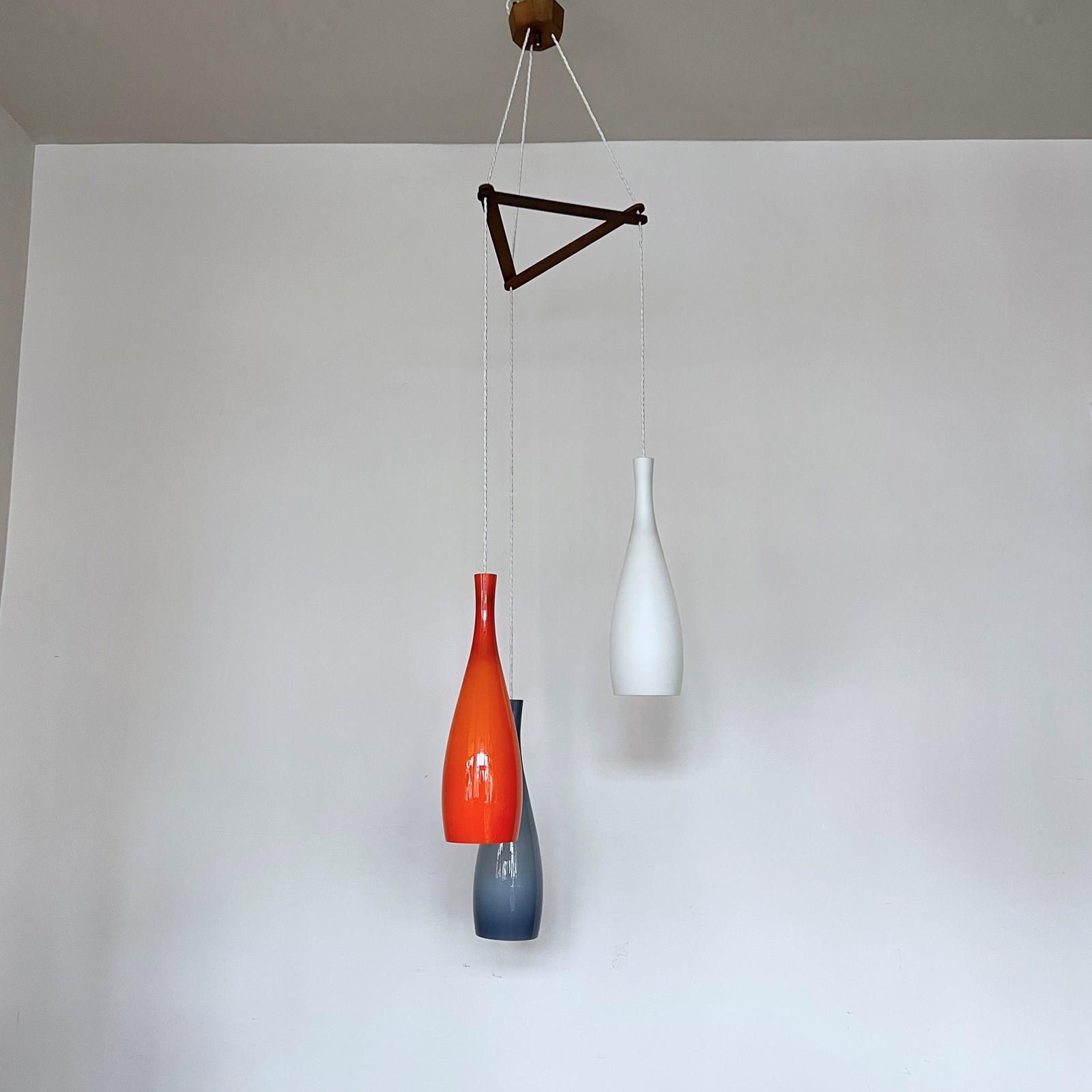 Jacob E. Bang chandelier featuring three hand-blown glass pendant lights in orange, blue, and white, designed for Fog & Mørup and manufactured by Holmegaard, Denmark in the 1960s. Original opaline glass shades with a teak wood triangular mounting frame and ceiling fitting. Newly rewired with white braided cable. The piece requires three B22 lamps. These are not included but can be supplied.