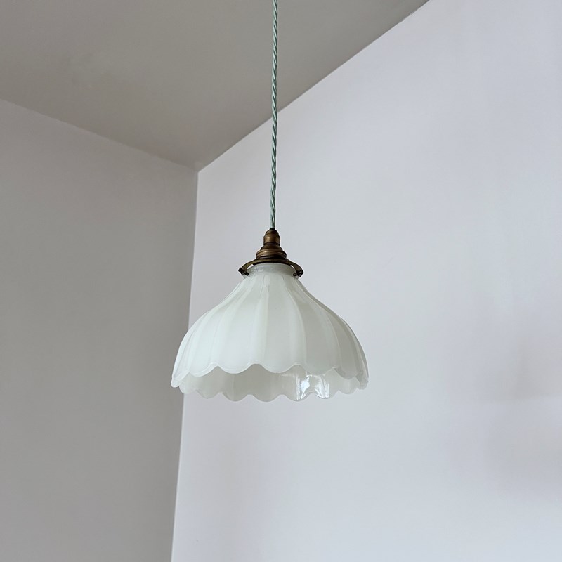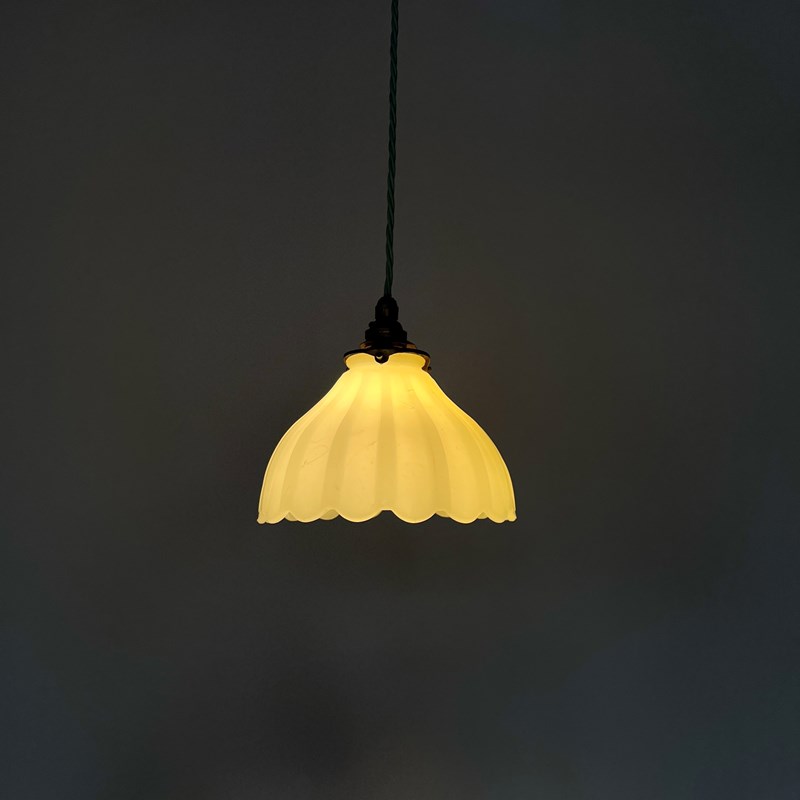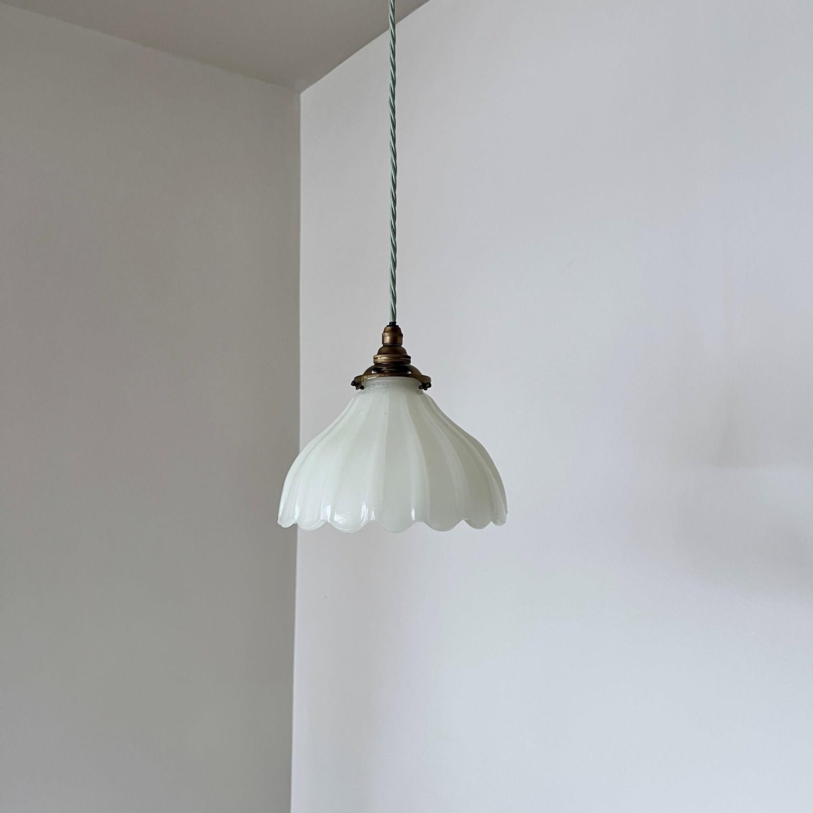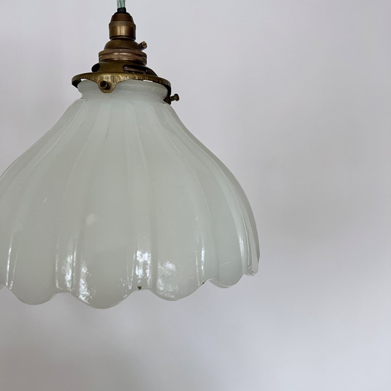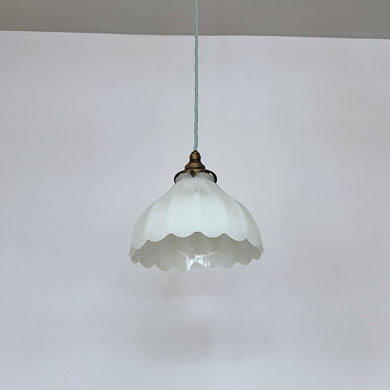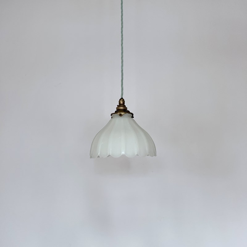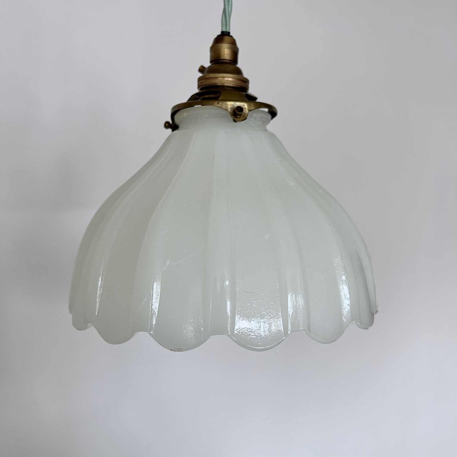 Jefferson moonstone glass shade. Rewired with an antique brass fitting with mint braided flex. The shade requires one B22 lamp. This is not included but can be supplied. The coloured flex can be changed to your preference and a matching ceiling fitting is supplied.