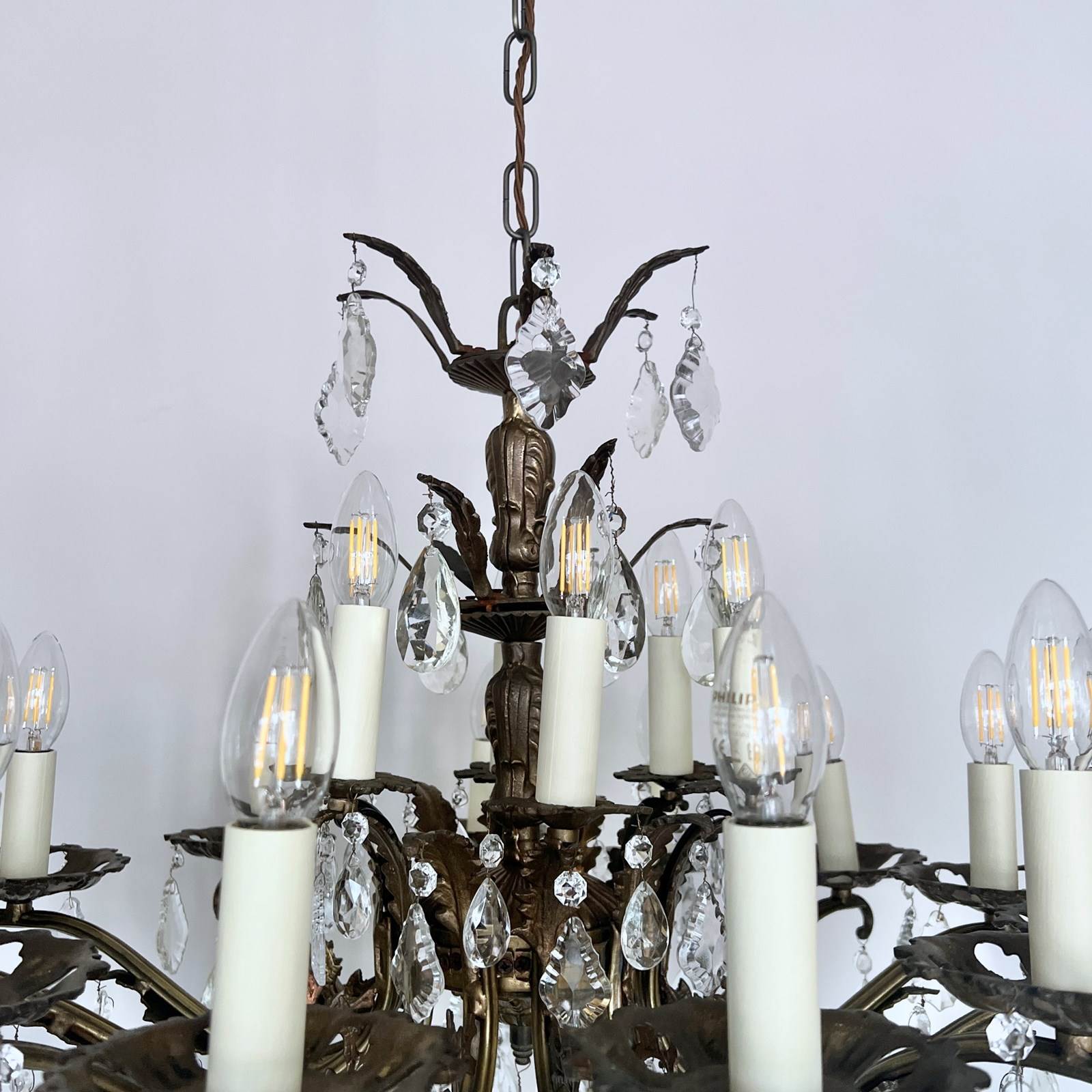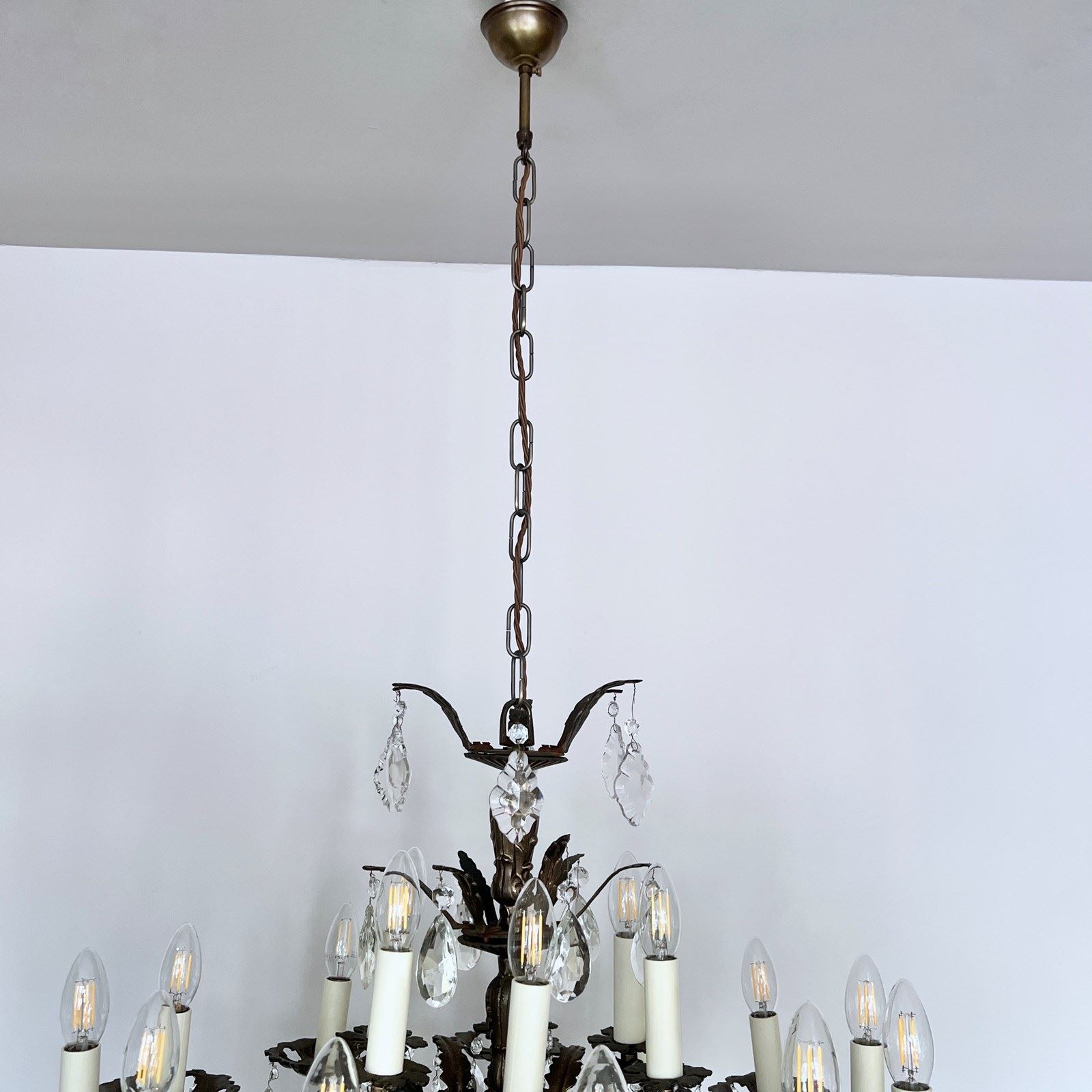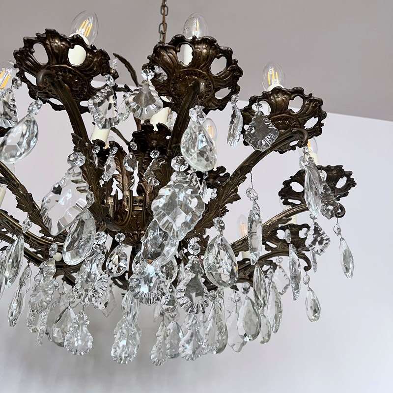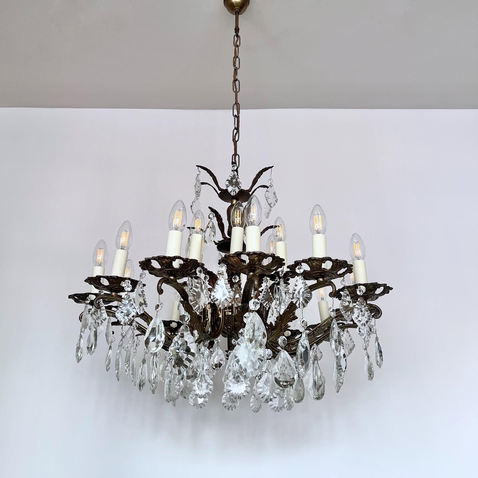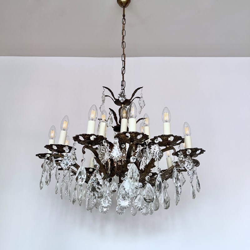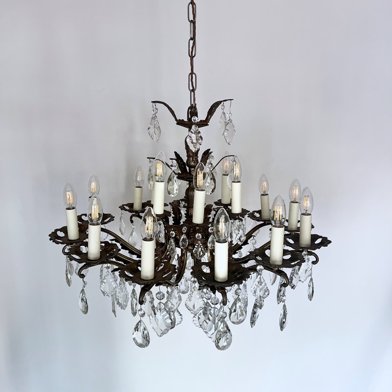 This heavy cast chandelier originates from the early 1900s. Dressed in cut glass pear and French glass flat leaf drops it is stunning centre piece. The chandelier frame is oxidised and holds eighteen lamps in total over upper and lower arms. There are also added cast brass leaf details on the lower arms from which the glass drops hang. The chandelier comes supplied with braided flex, chain, a ceiling rose and a chandelier hook plate. Chandelier requires SES lamps, these are not included, but can be supplied.