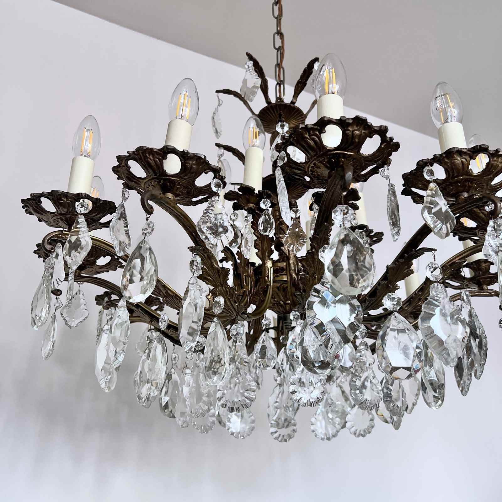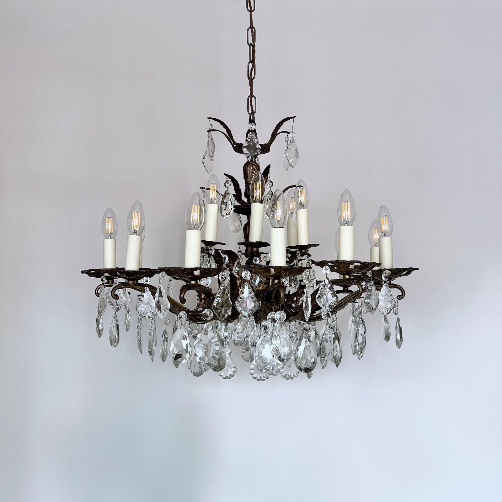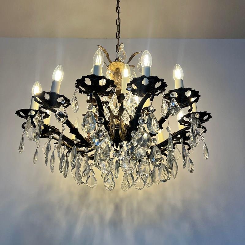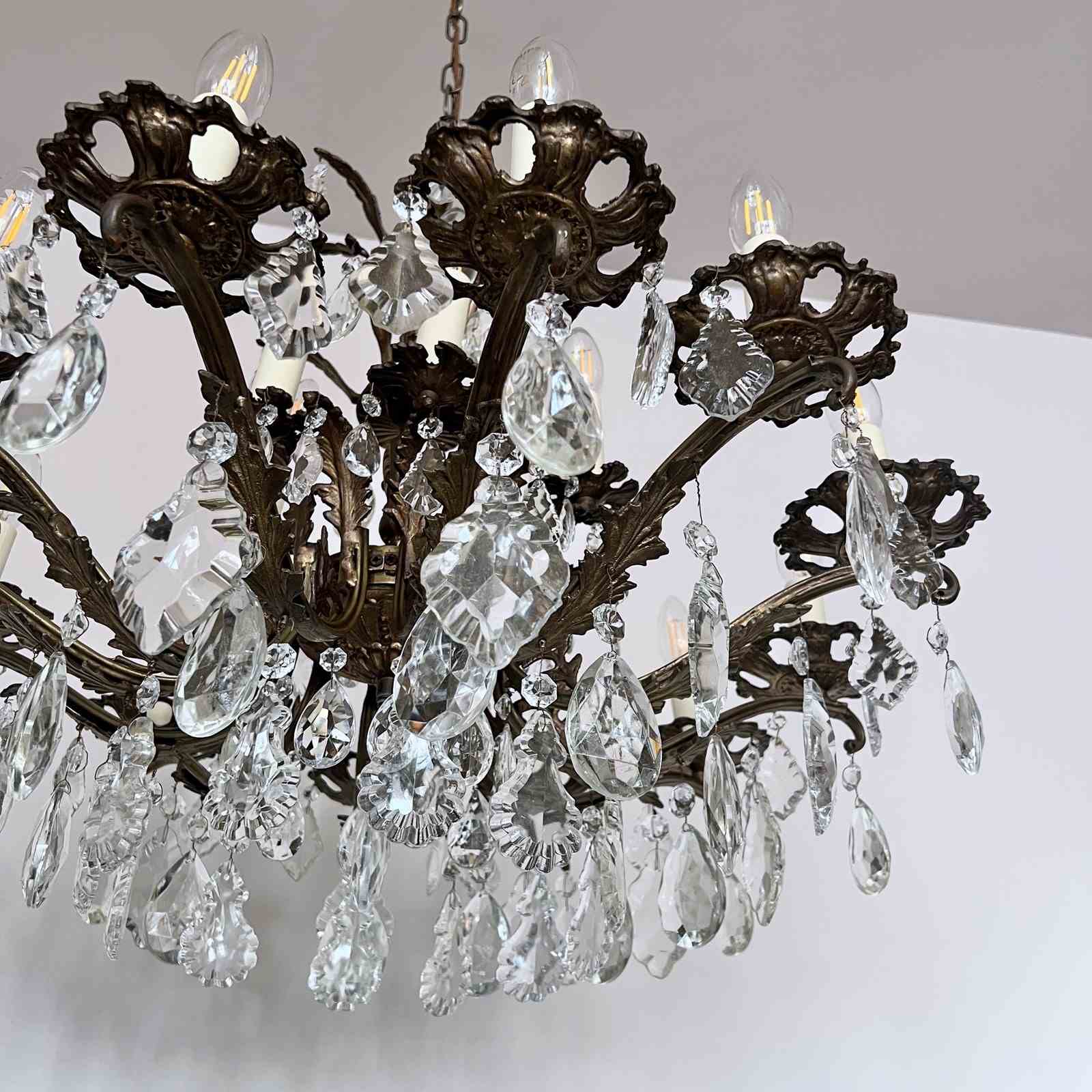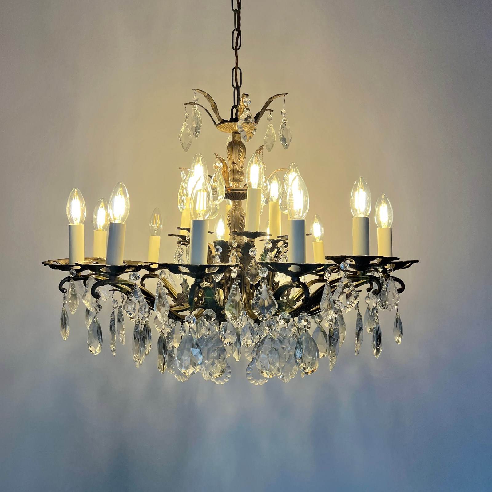 This heavy cast chandelier originates from the early 1900s. Dressed in cut glass pear and French glass flat leaf drops it is stunning centre piece. The chandelier frame is oxidised and holds eighteen lamps in total over upper and lower arms. There are also added cast brass leaf details on the lower arms from which the glass drops hang. The chandelier comes supplied with braided flex, chain, a ceiling rose and a chandelier hook plate. Chandelier requires SES lamps, these are not included, but can be supplied.