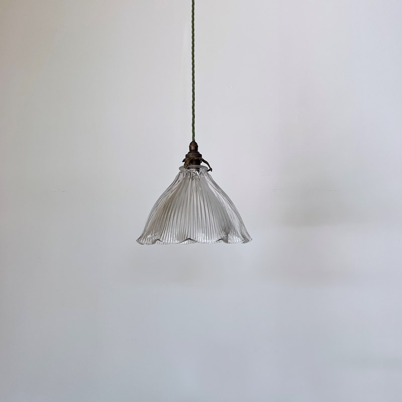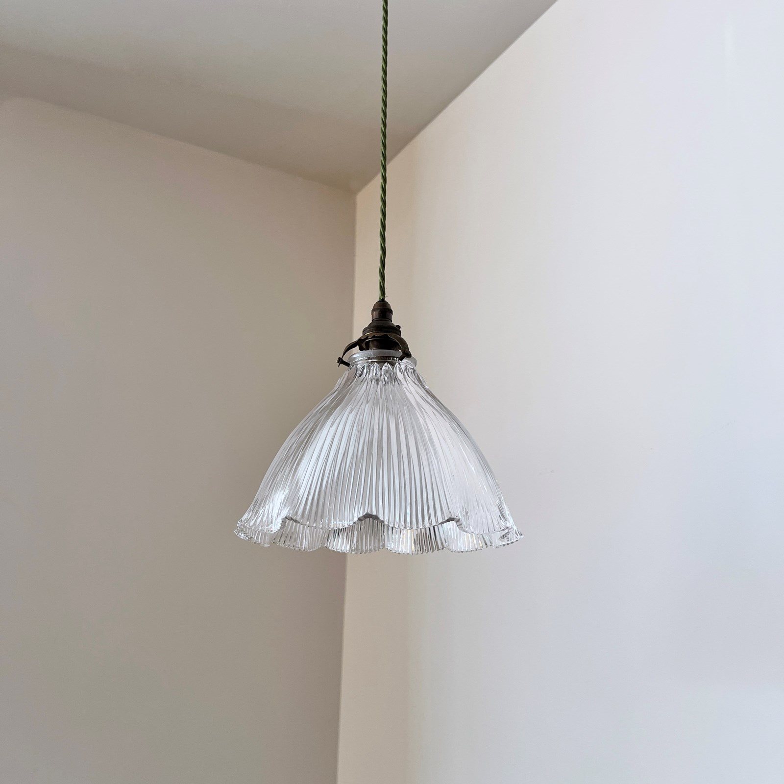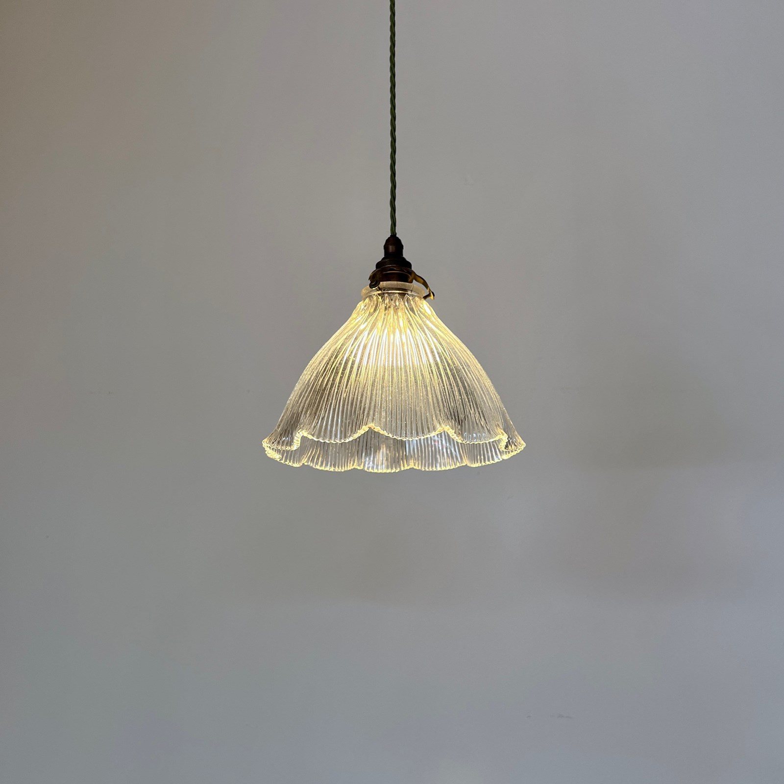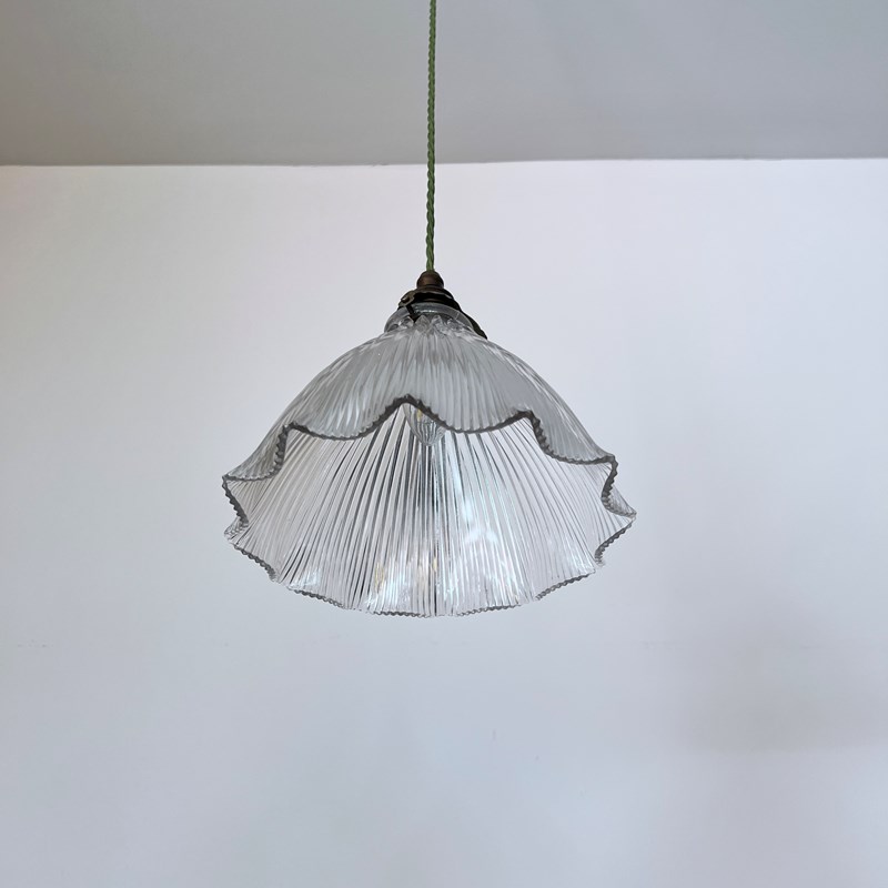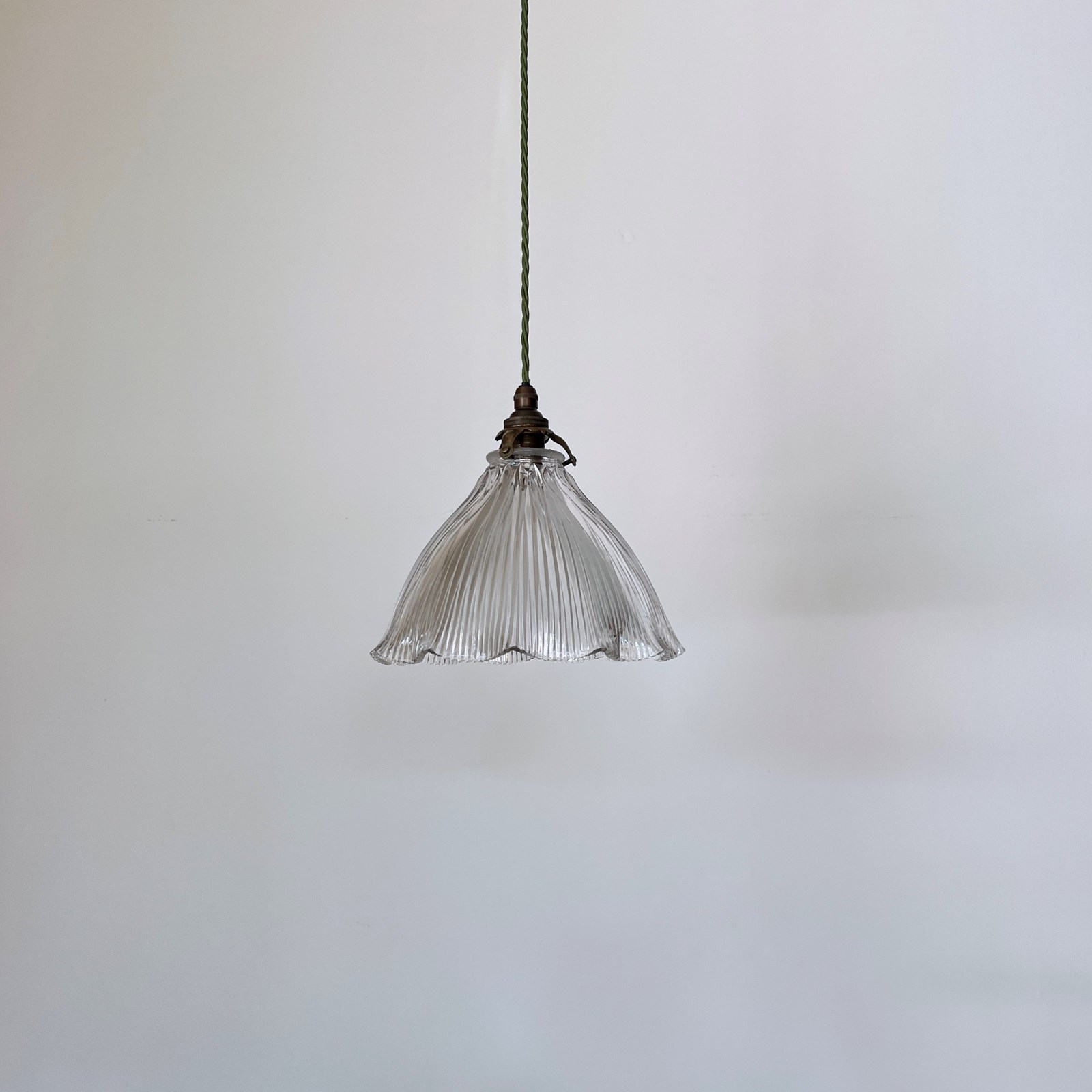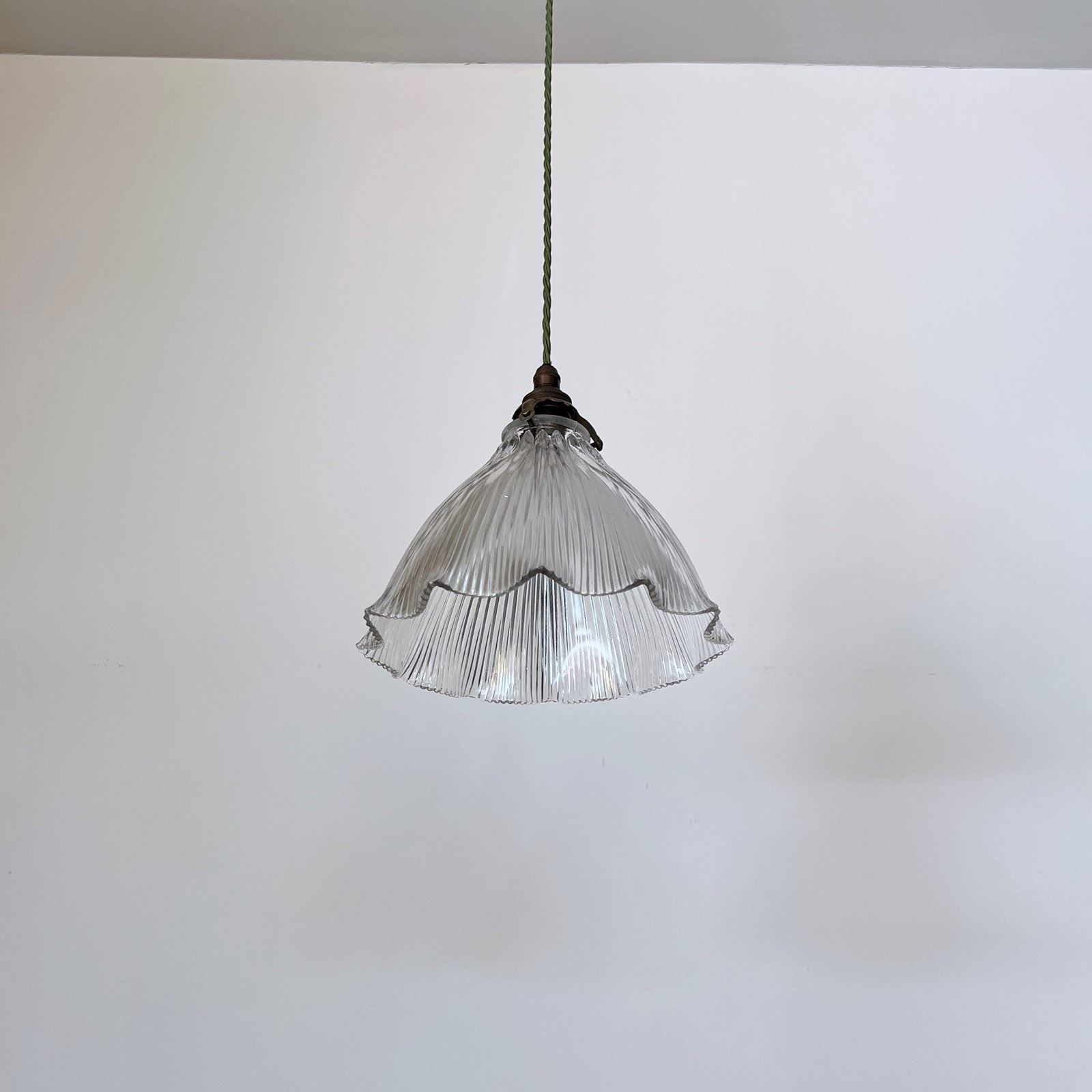 Large Holophane fluted glass shade. Stamped ‘Holophane E 100 Patent No. 20,222 1909’ . Rewired with an antique brass lamp holder and skeleton fitting with olive green braided flex. The shade requires one B22 lamp. The coloured flex can be changed to your preference and a matching ceiling fitting is supplied.