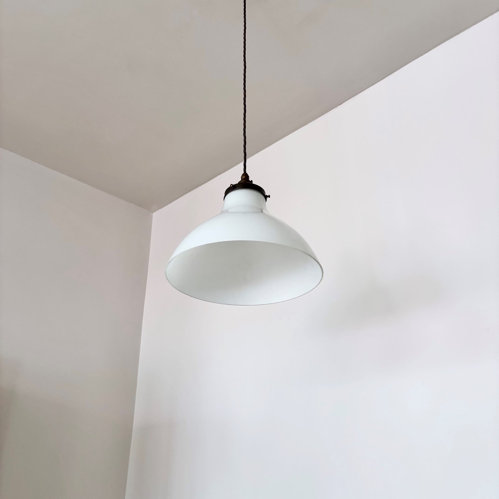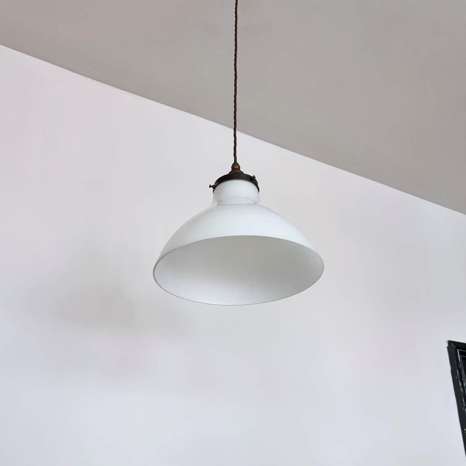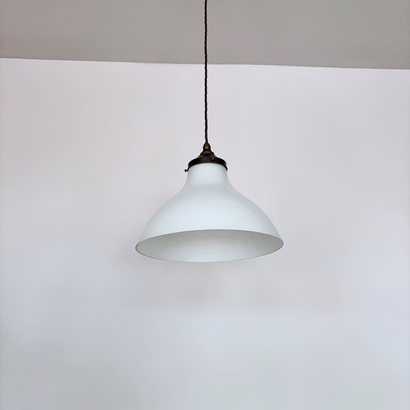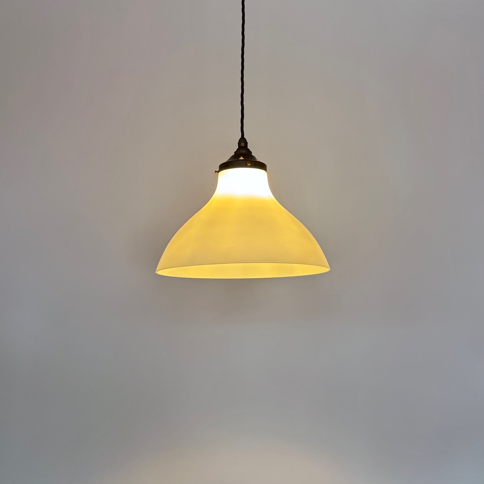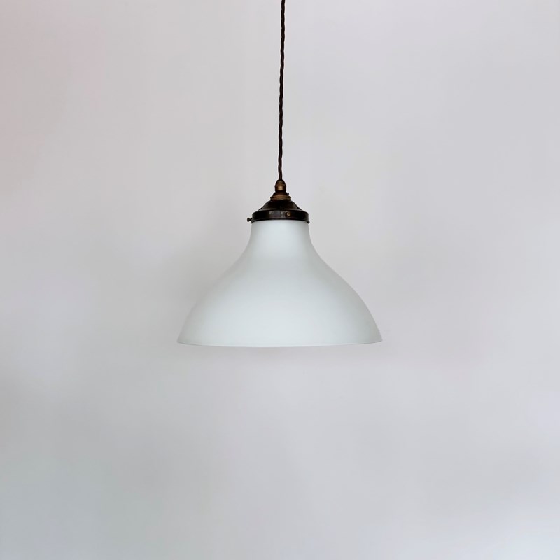 Matte conical glass shade. Some small marks due to age and use. Finished with an antique brass finish fitting and dark brown braided cable. The coloured braided flex can be changed to your preference and a matching ceiling fitting is supplied. The shade requires one b22 bulb. This is not included but can be supplied.