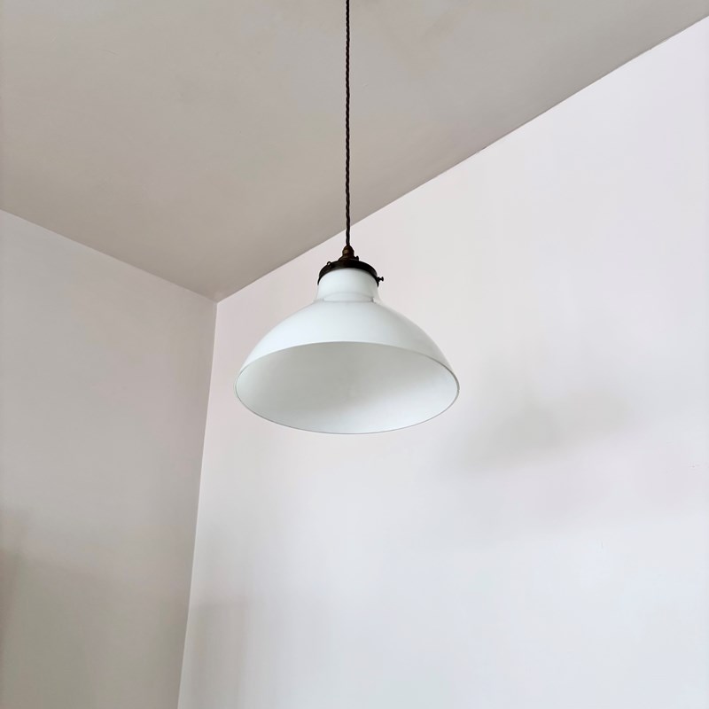 This shade has been fully rewired here, in Stockport, near Manchester by our small team of experts and is now ready to be installed. We recommend that this is installed by an electrician into a joist or a supporting noggin. To clean dust the flex and brass components regularly with a soft cloth. The glass shade can then be wiped with a glass wipe or a cloth that has been sprayed with glass cleaner. A final wipe with a paper towel will give a polished finish.
