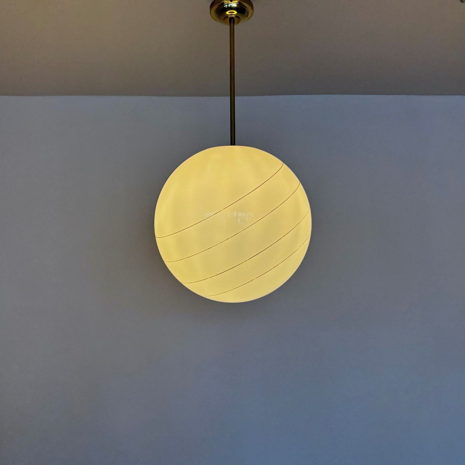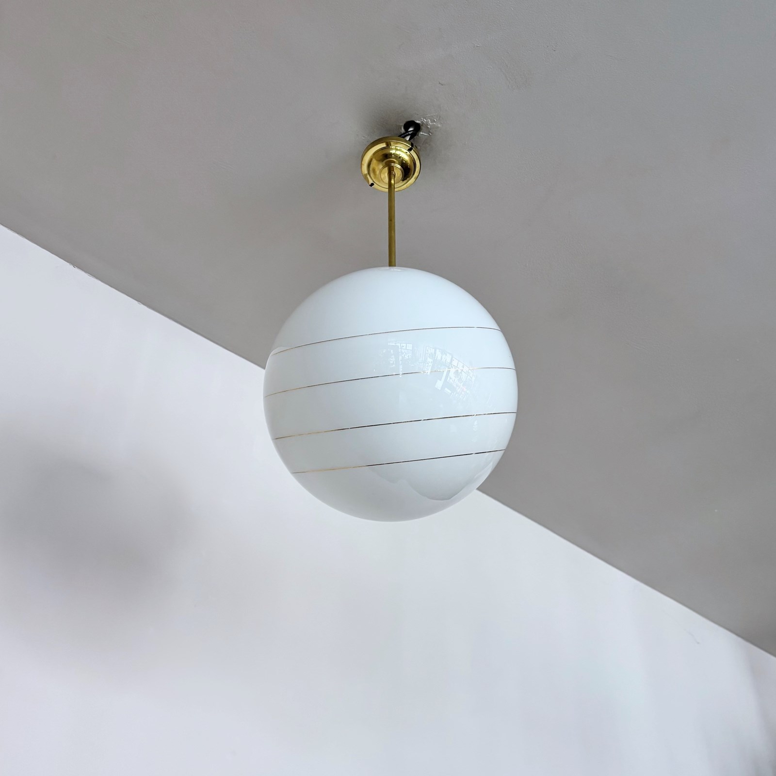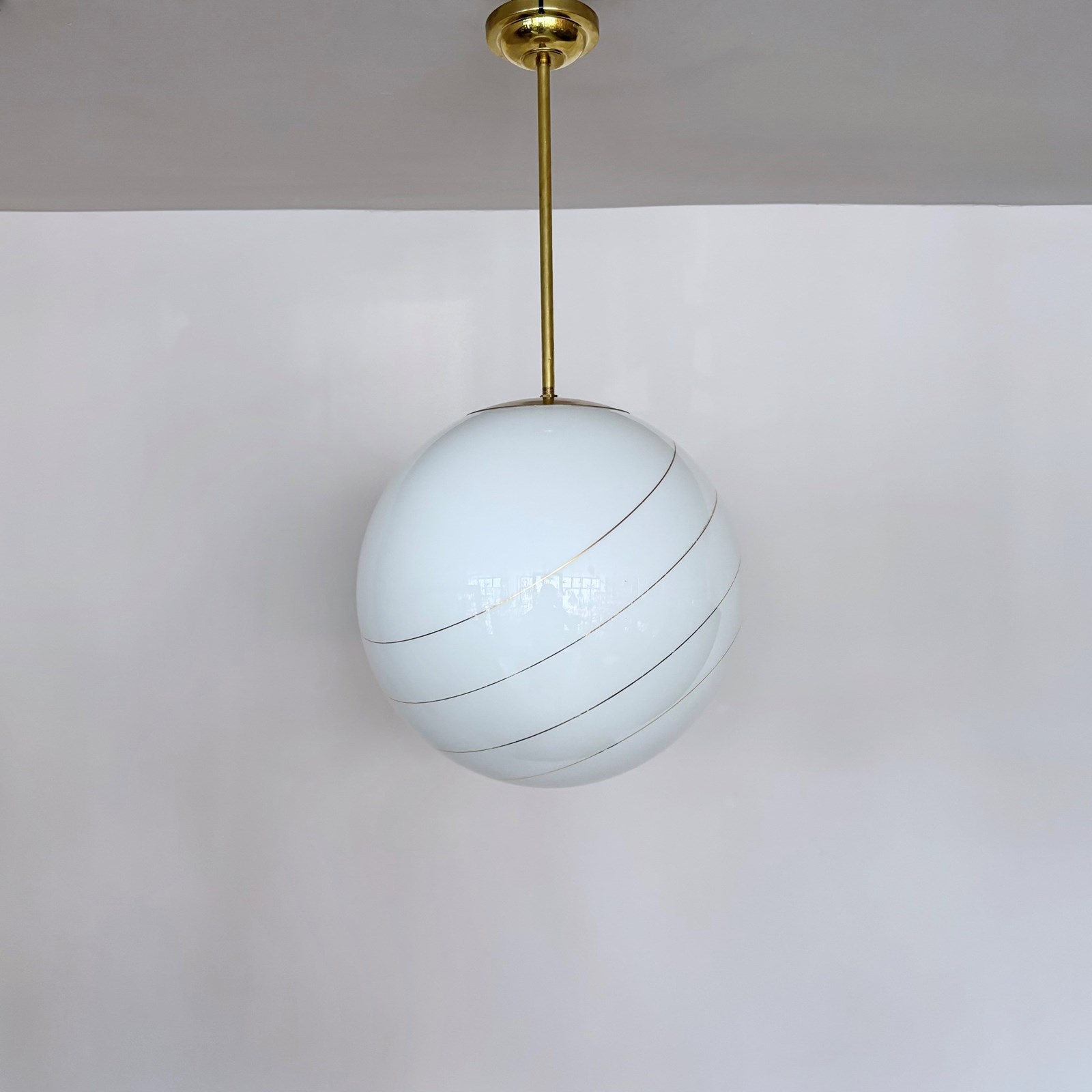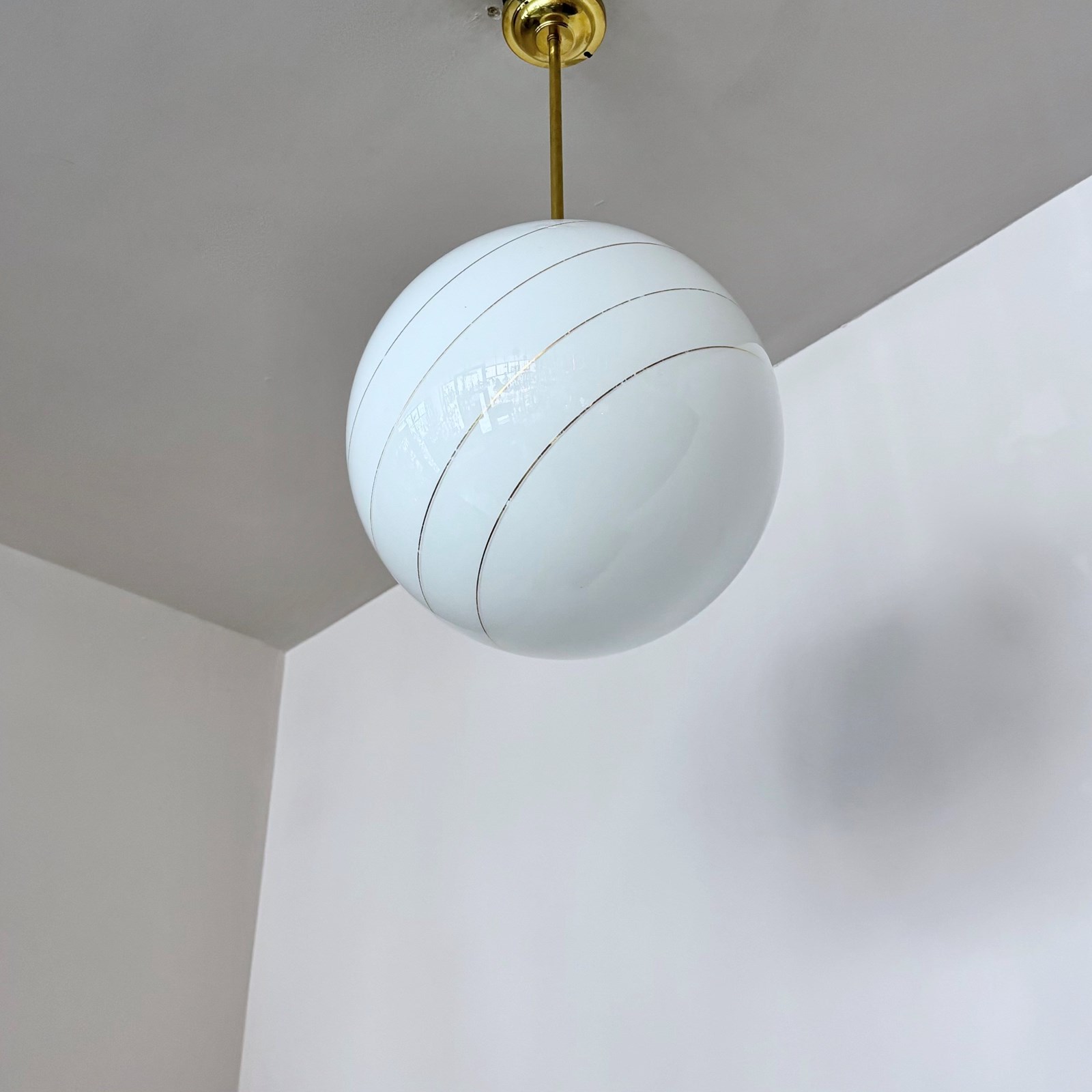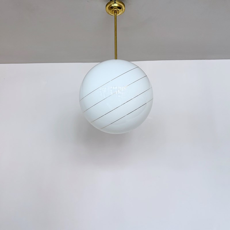 Large Mid Century polished globe shade with gold band details. With a new monks cap fitting rewired with a brass bar and fits straight to the ceiling. This shade requires one B22 lamp.