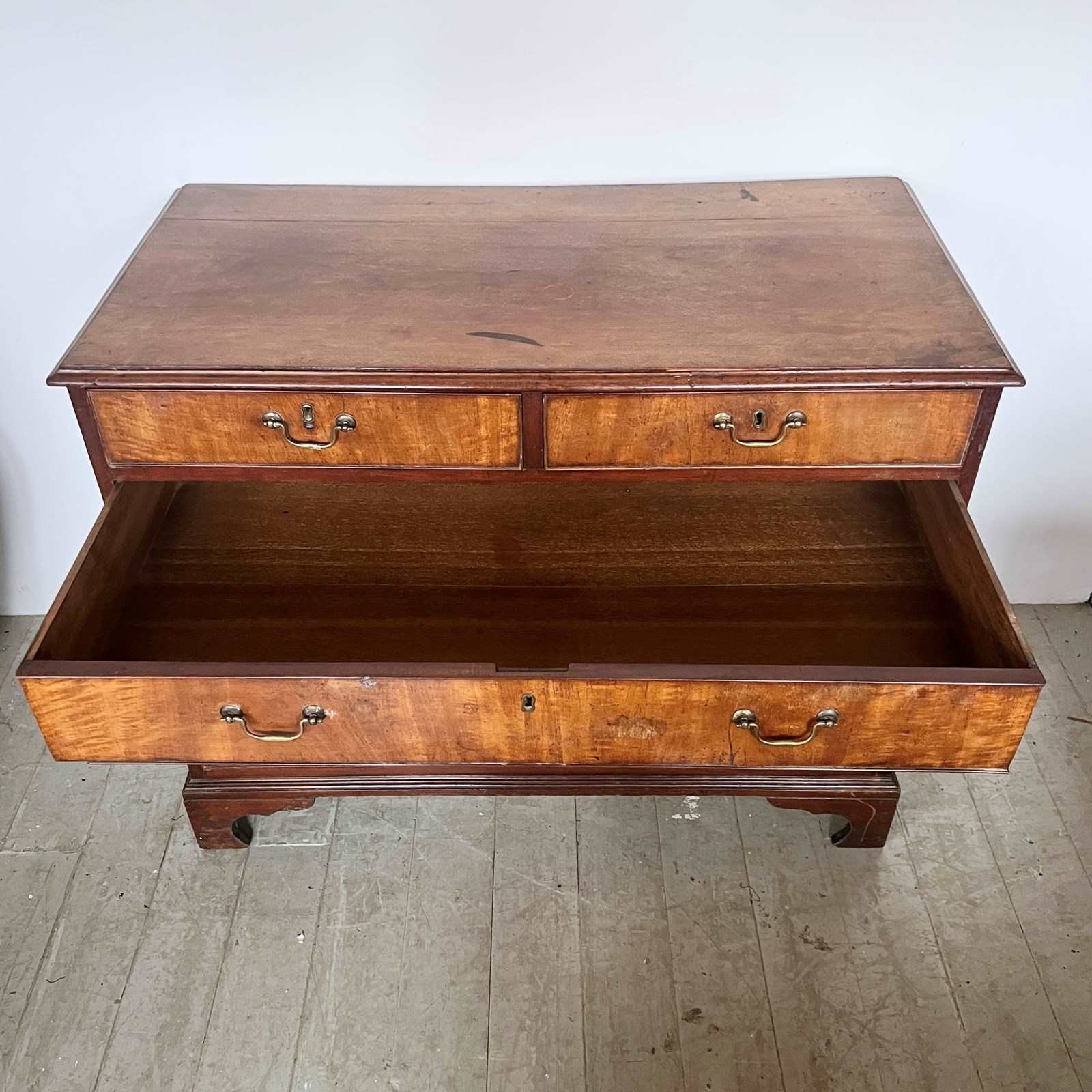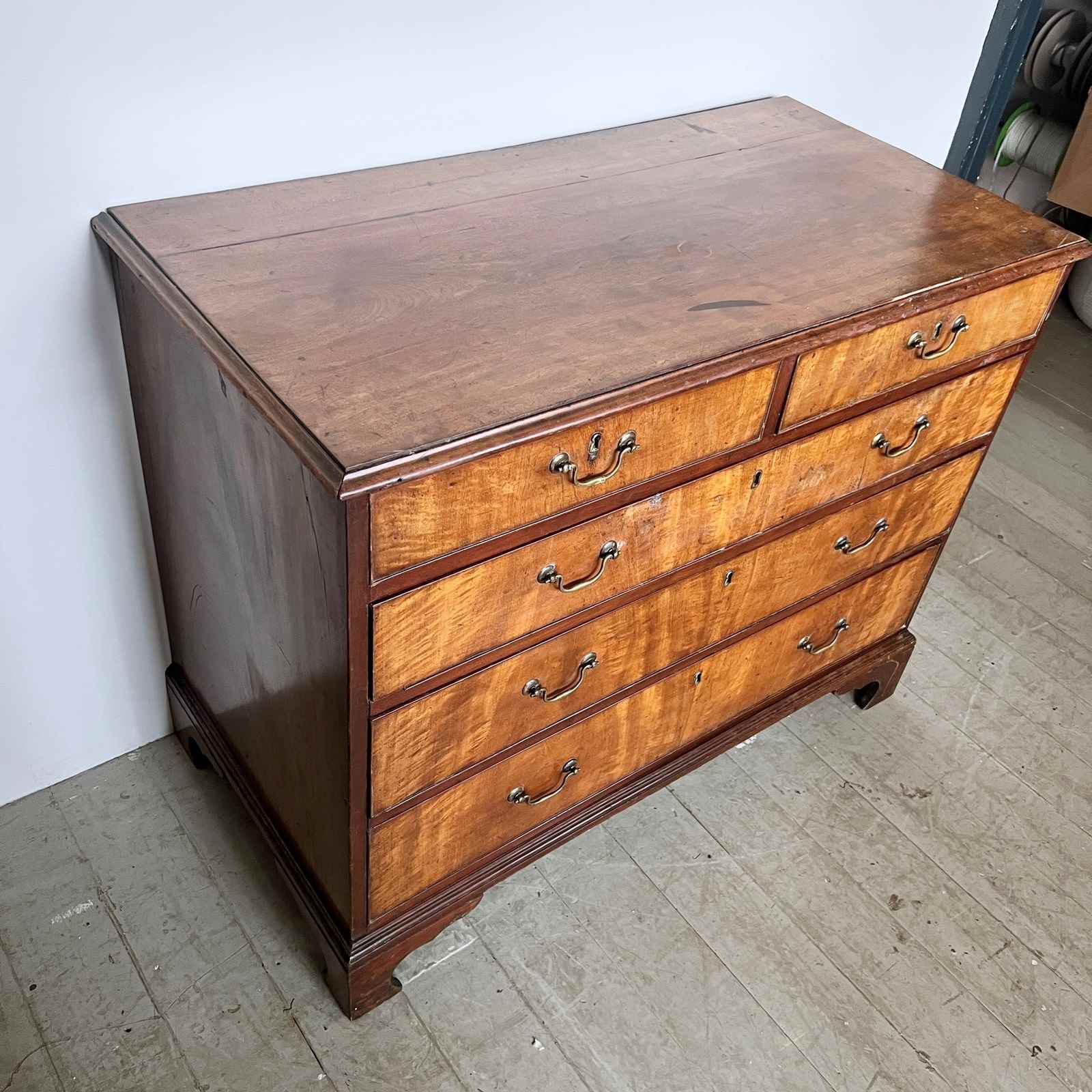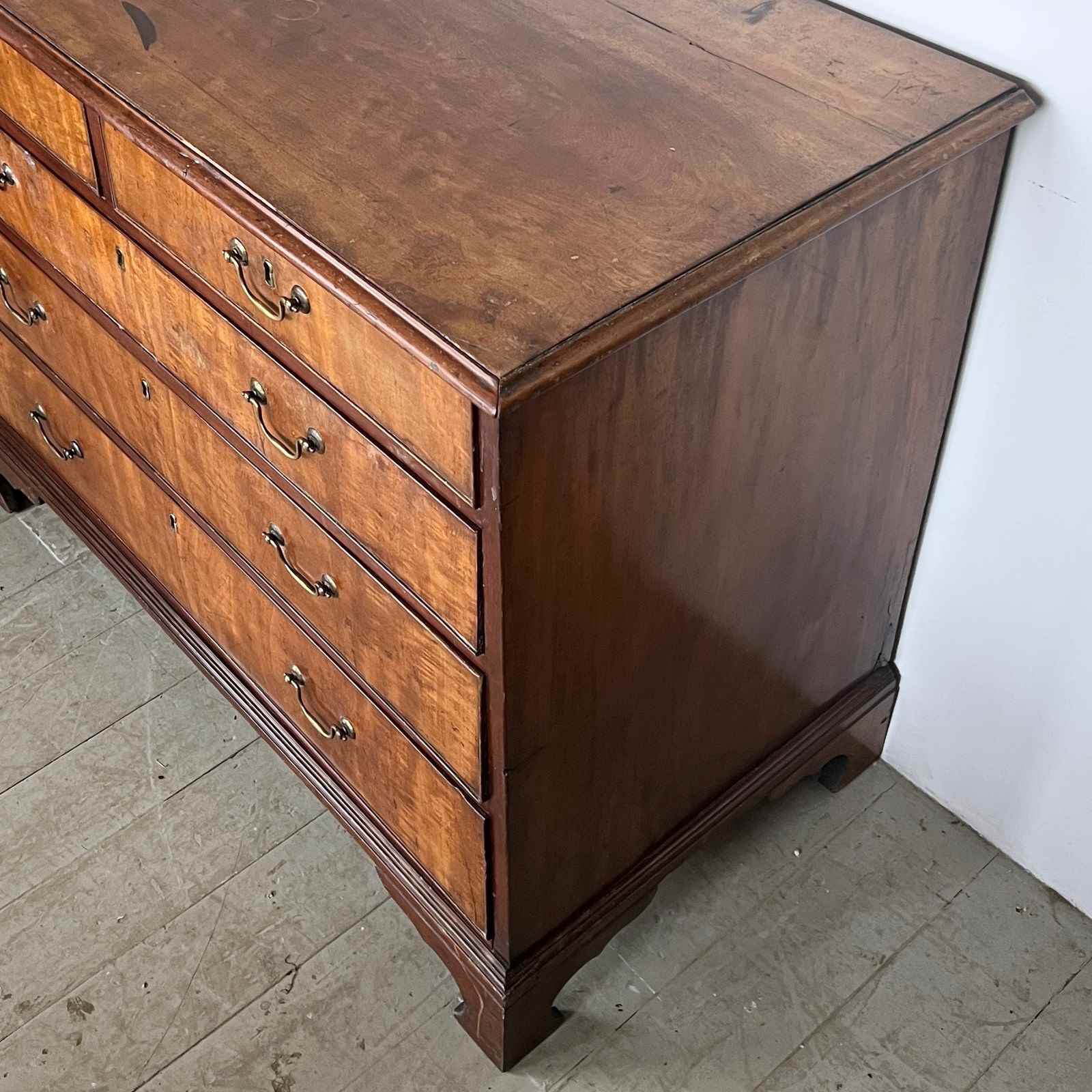 Solid mahogany chest of drawers with original brass handle pulls. Two drawers over three. Top left corner has been repaired.