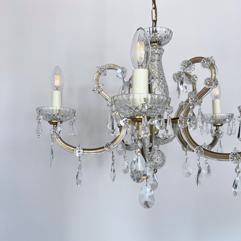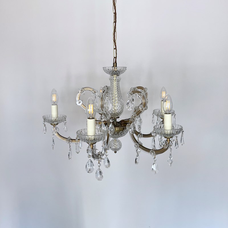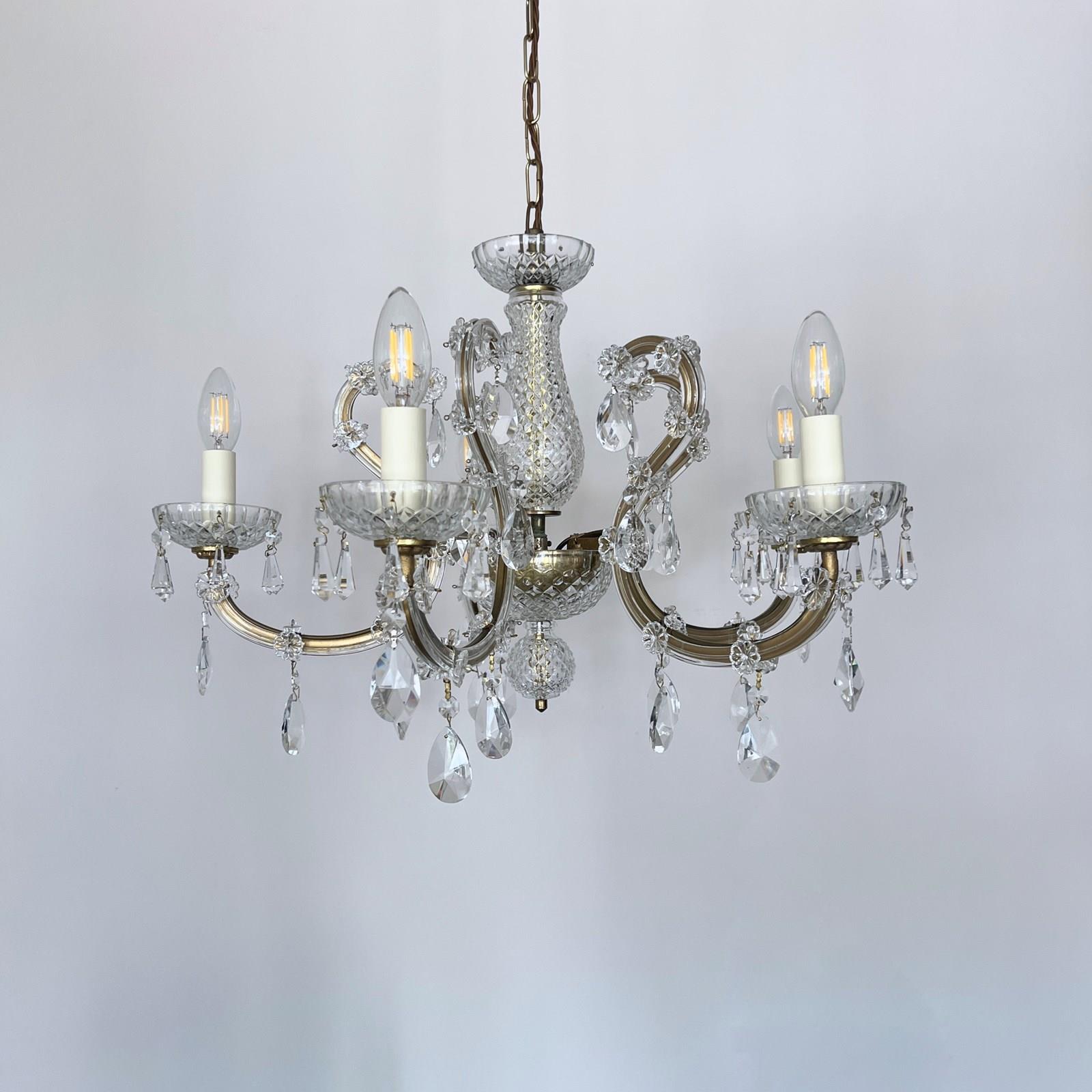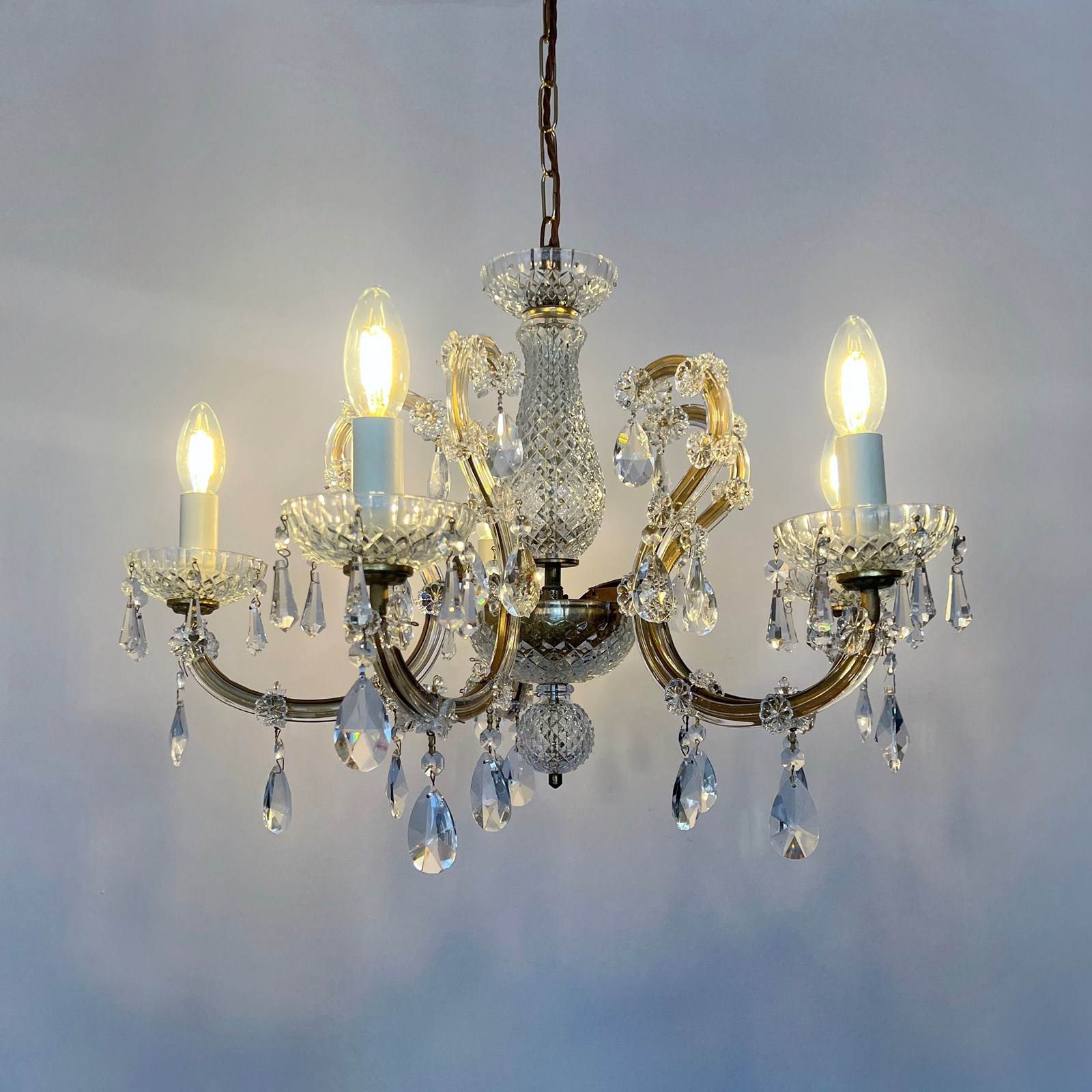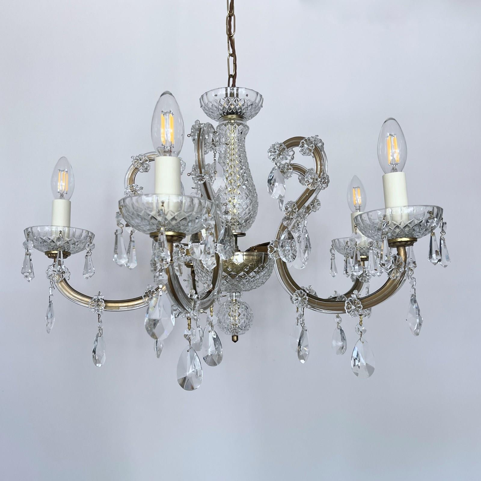 This Marie Thérèse chandelier has a gilt brass frame encased in clear glass. It has five lamps and is dressed in cut glass prisms with buttons and pear drops . It dates from late 20th century France and hangs well in a variety of contemporary or period settings. The decorative frame gives the light great proportions. The chandelier is finished with polished brass parts and comes supplied with braided flex and chain, ceiling rose and a chandelier hook plate. Chandelier requires SES lamps, these are not included but can be supplied.
