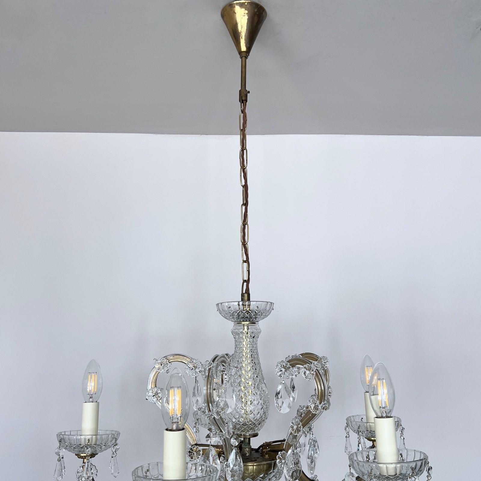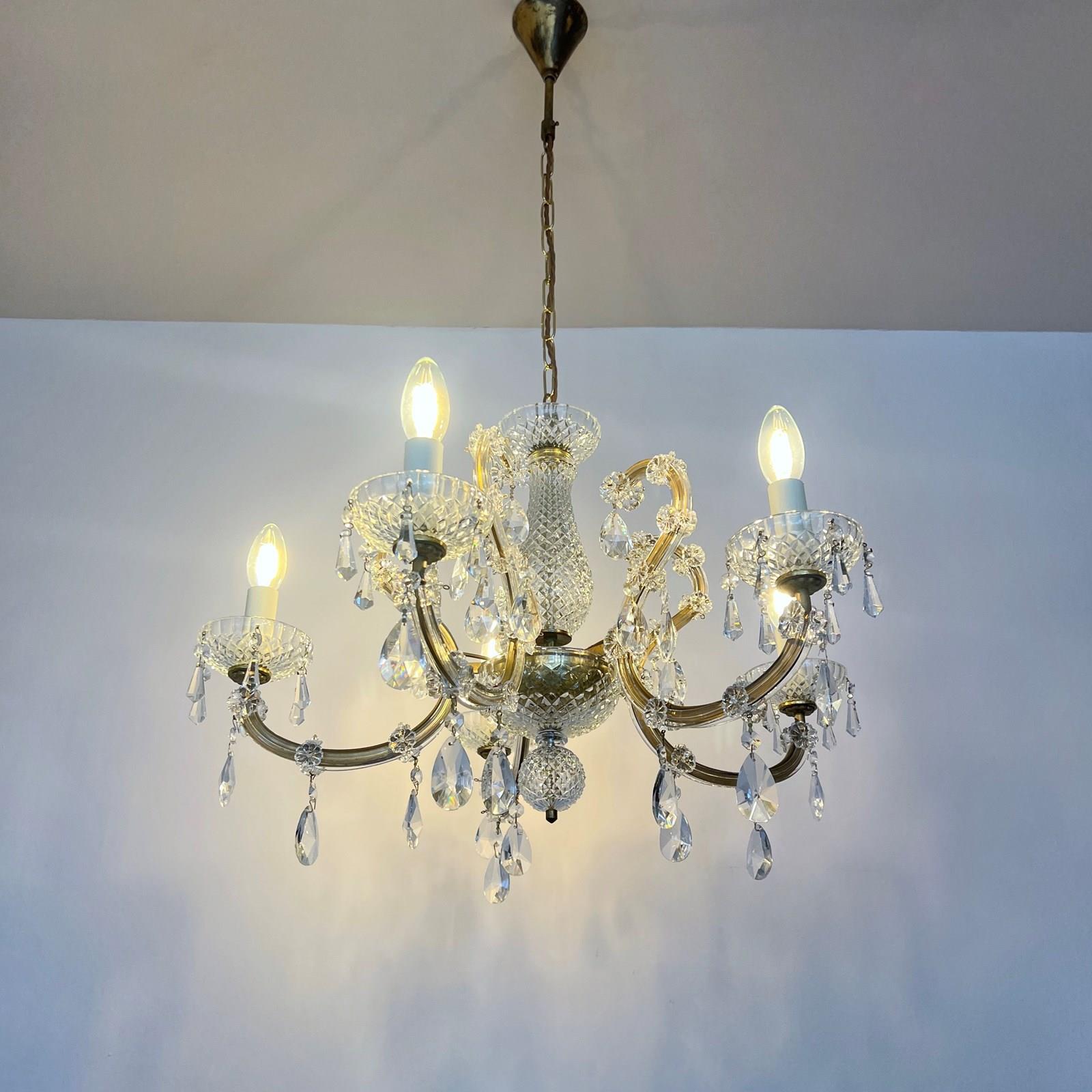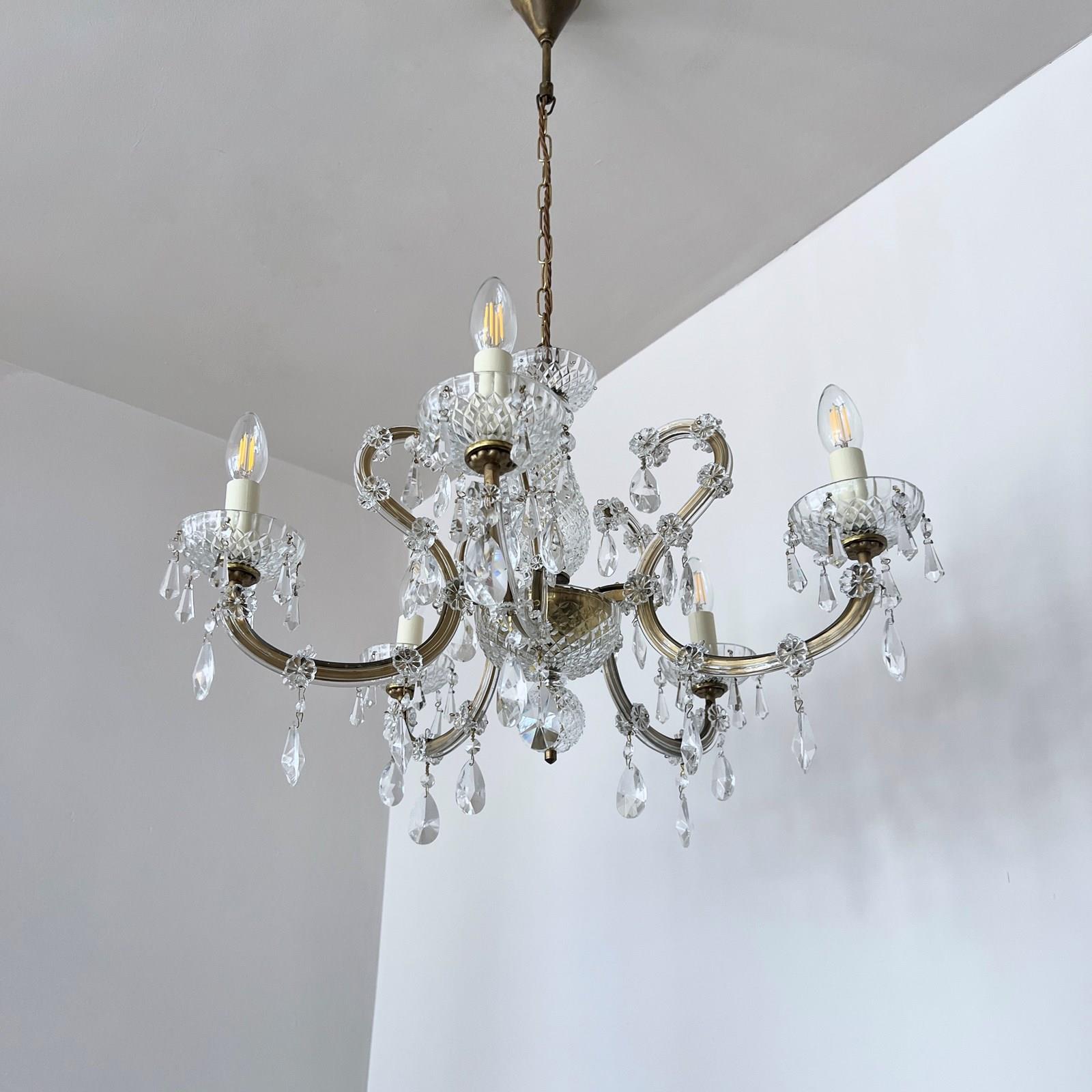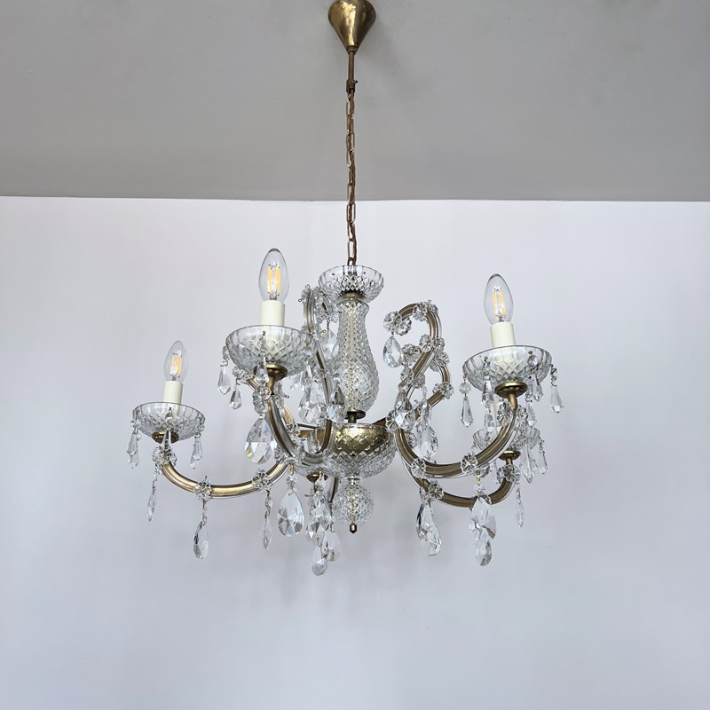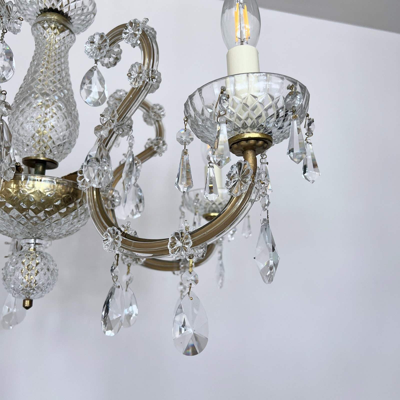 This Marie Thérèse chandelier has a gilt brass frame encased in clear glass. It has five lamps and is dressed in cut glass prisms with buttons and pear drops . It dates from late 20th century France and hangs well in a variety of contemporary or period settings. The decorative frame gives the light great proportions. The chandelier is finished with polished brass parts and comes supplied with braided flex and chain, ceiling rose and a chandelier hook plate. Chandelier requires SES lamps, these are not included but can be supplied.