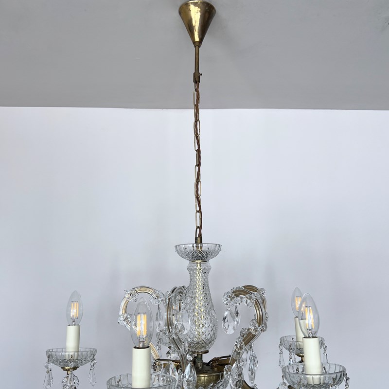 This chandelier has been fully restored and rewired here, in Stockport, near Manchester by our small team of experts and is now ready to be installed. We recommend that this chandelier is installed by an electrician and into a joist or a supporting noggin. To clean the chandelier dust the components regularly with a soft cloth. The glass can then be wiped with a glass wipe or a cloth that has been sprayed with glass cleaner. A final wipe with a paper towel will give a polished finish.