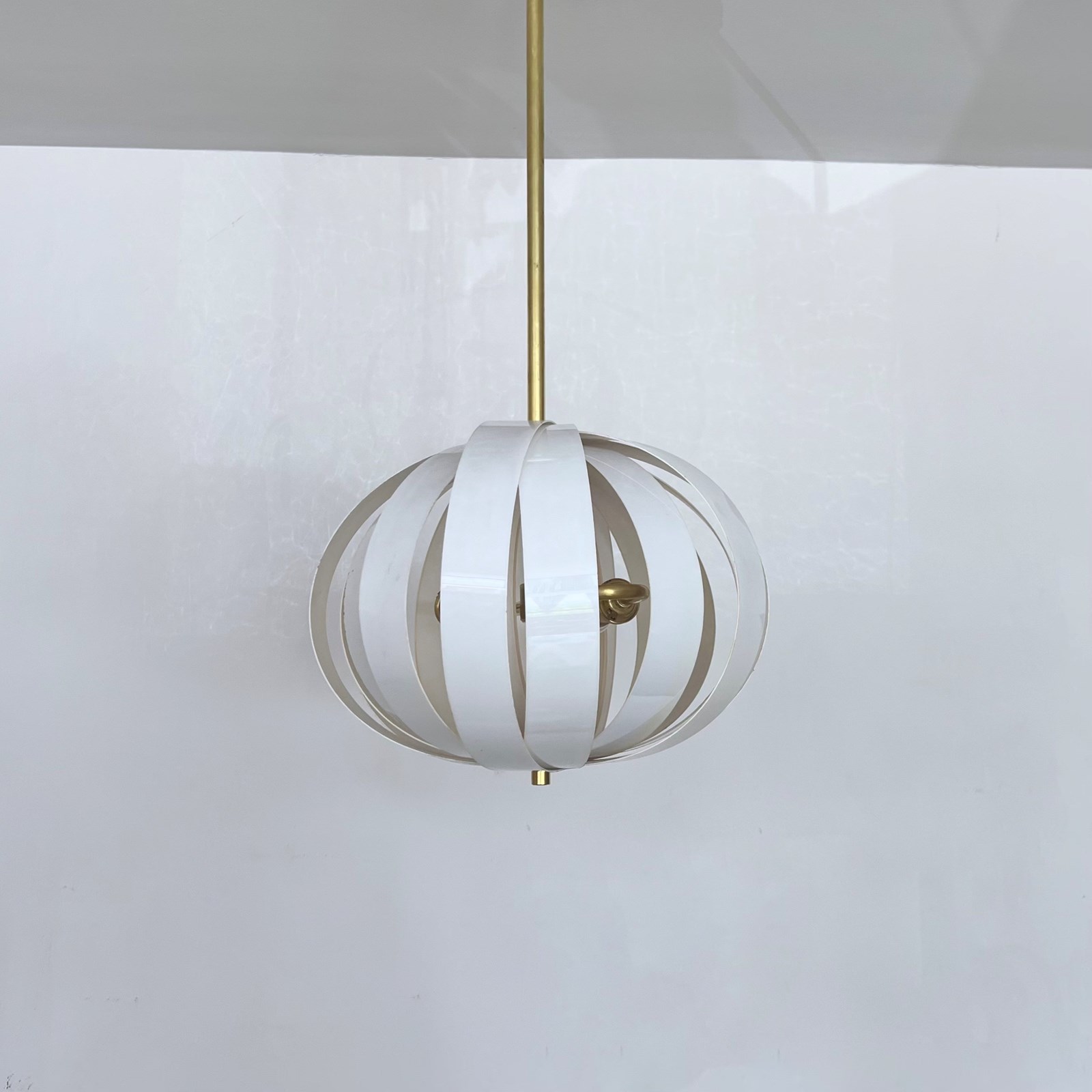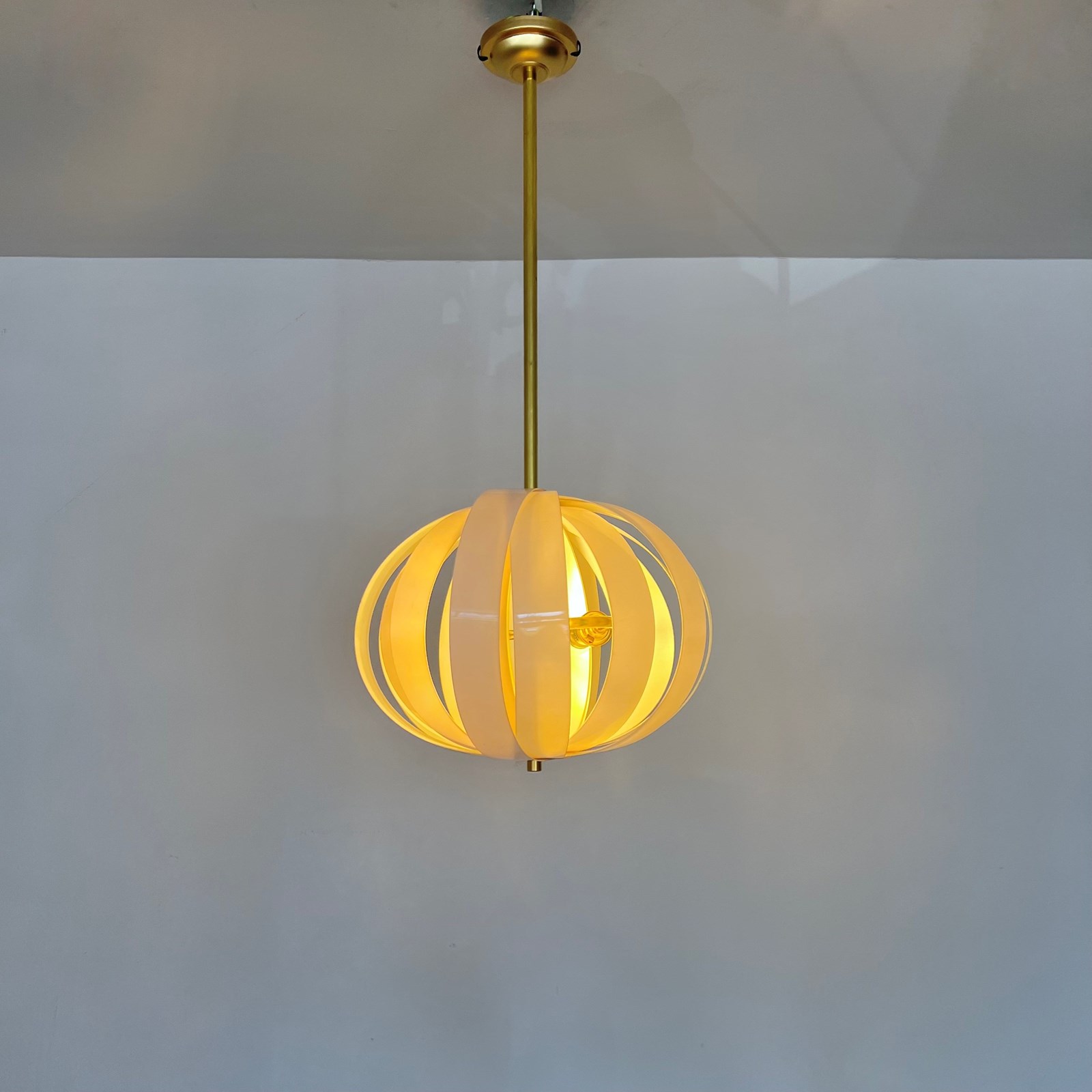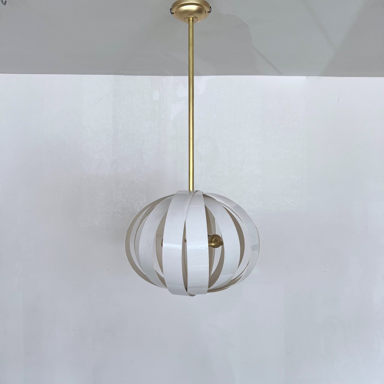 Mid Century plastic shade newly wired polished brass bar fitting. This shade requires two b22 lamps. The pieces fits directly to the ceiling. The central bar could be extended or shortened as needed.