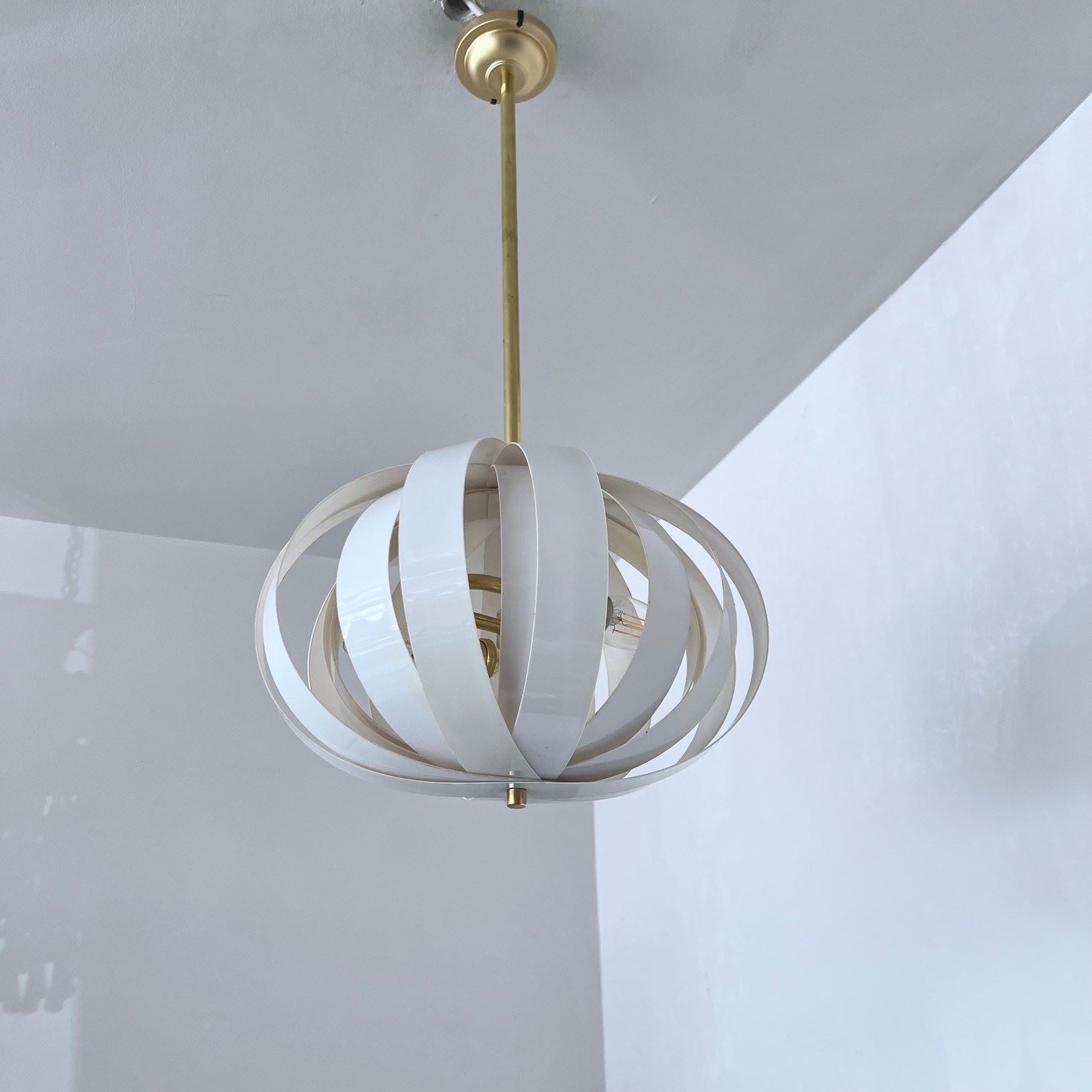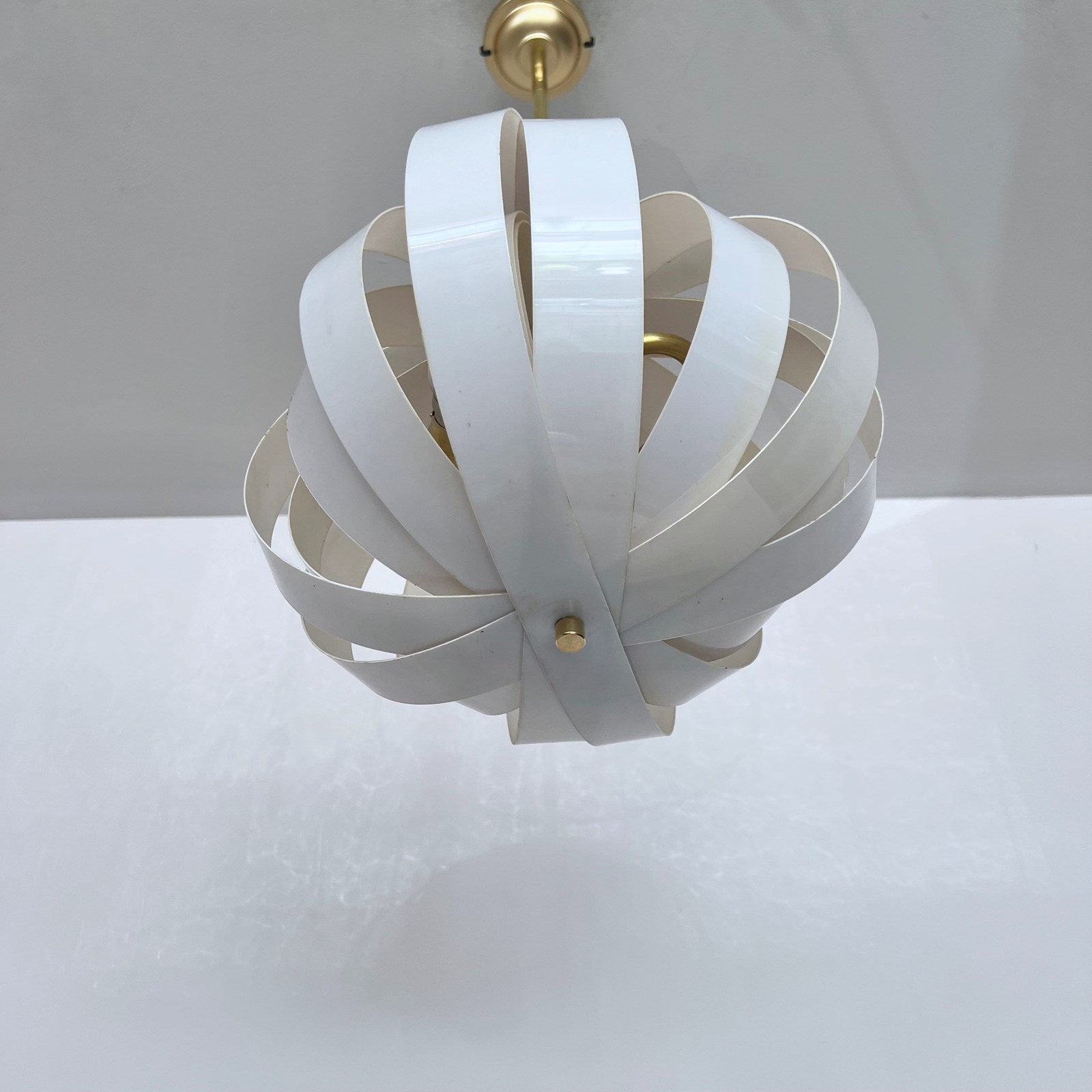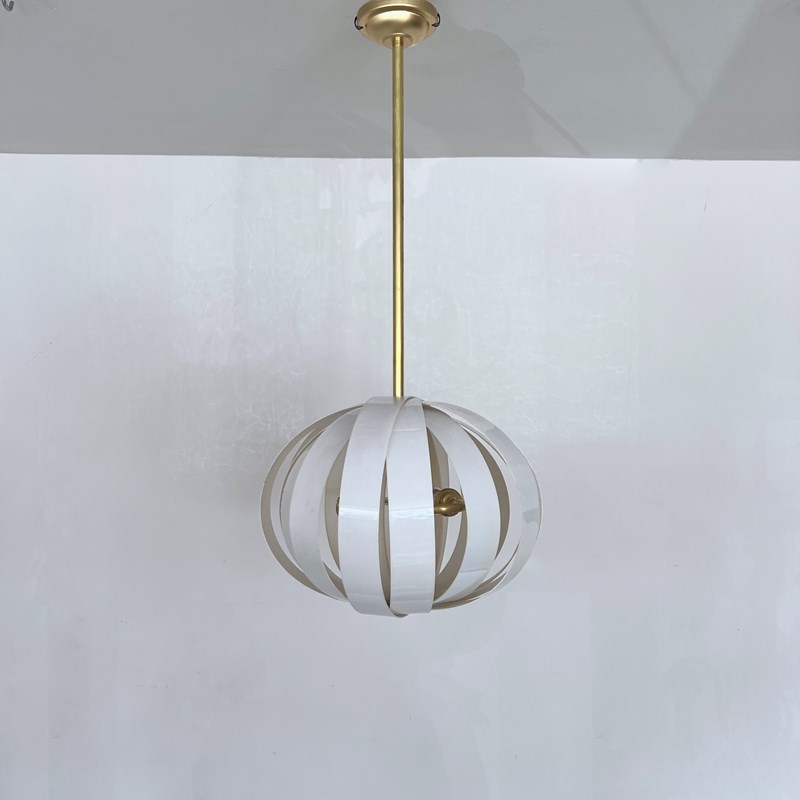 Mid Century plastic shade newly wired polished brass bar fitting. This shade requires two b22 lamps. The pieces fits directly to the ceiling. The central bar could be extended or shortened as needed.
