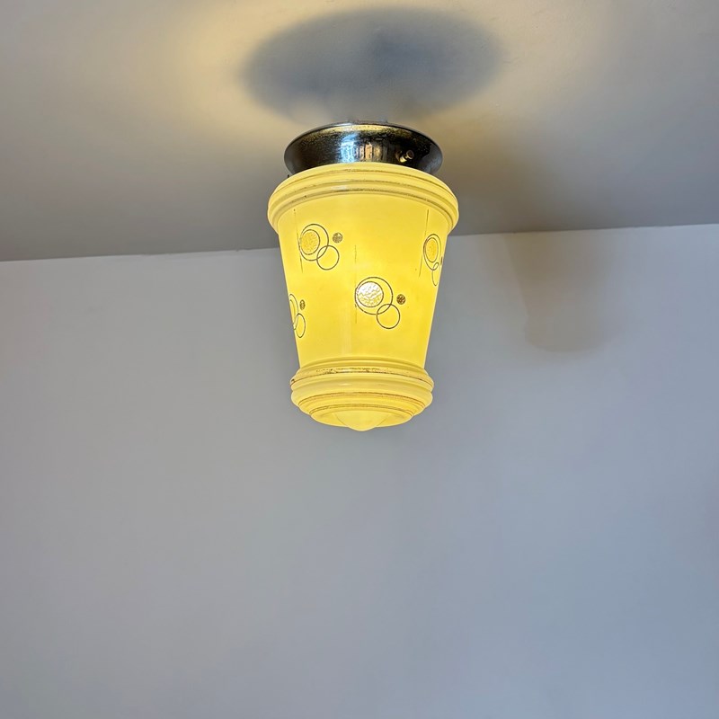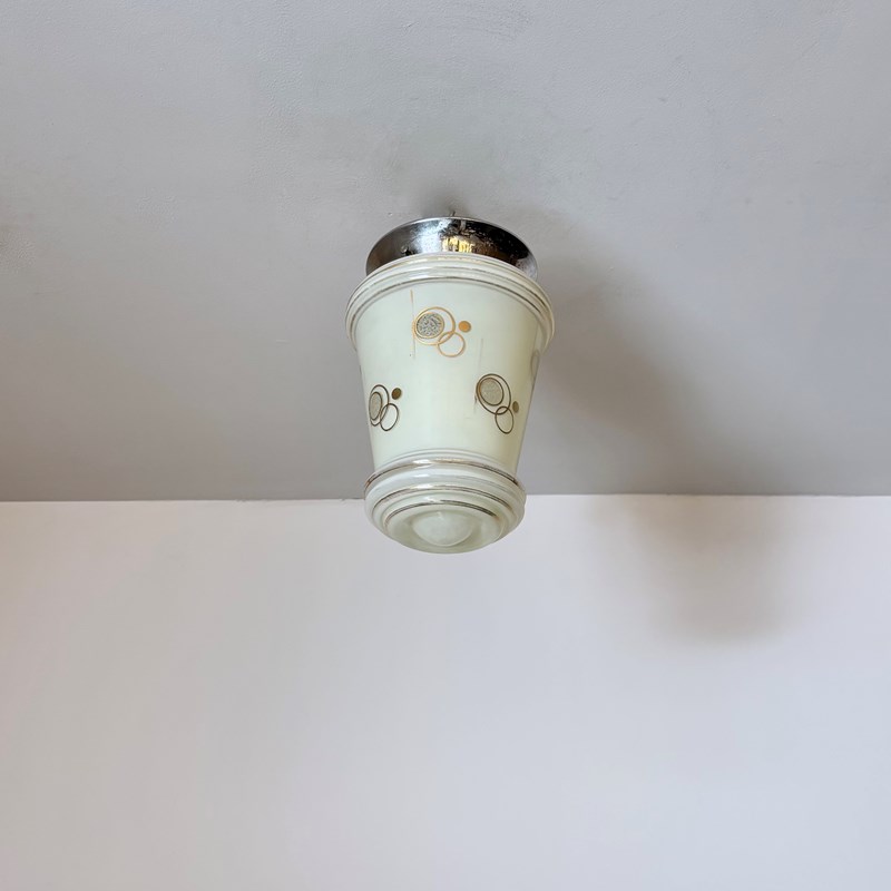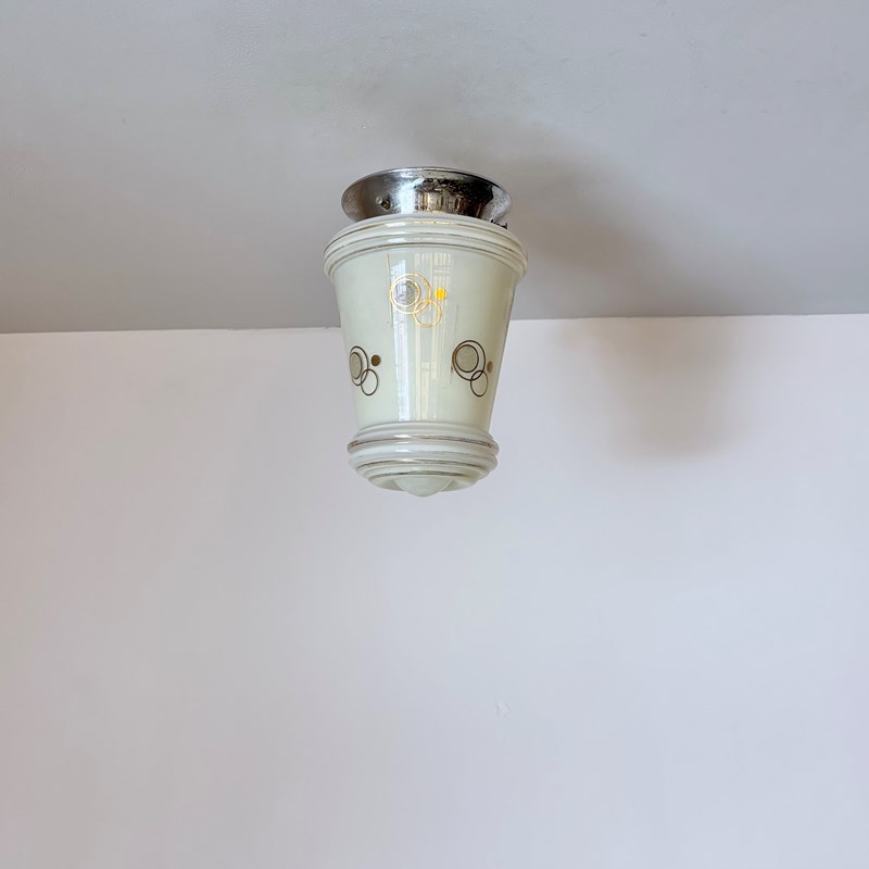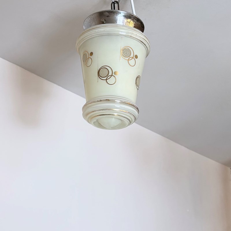 Mid century shade pendant. Featuring a moulded glass shade with graphic circular pattern with gold bands. This pendant requires one b22 lamp, this is not included but can be supplied. The pieces fits directly to the ceiling.