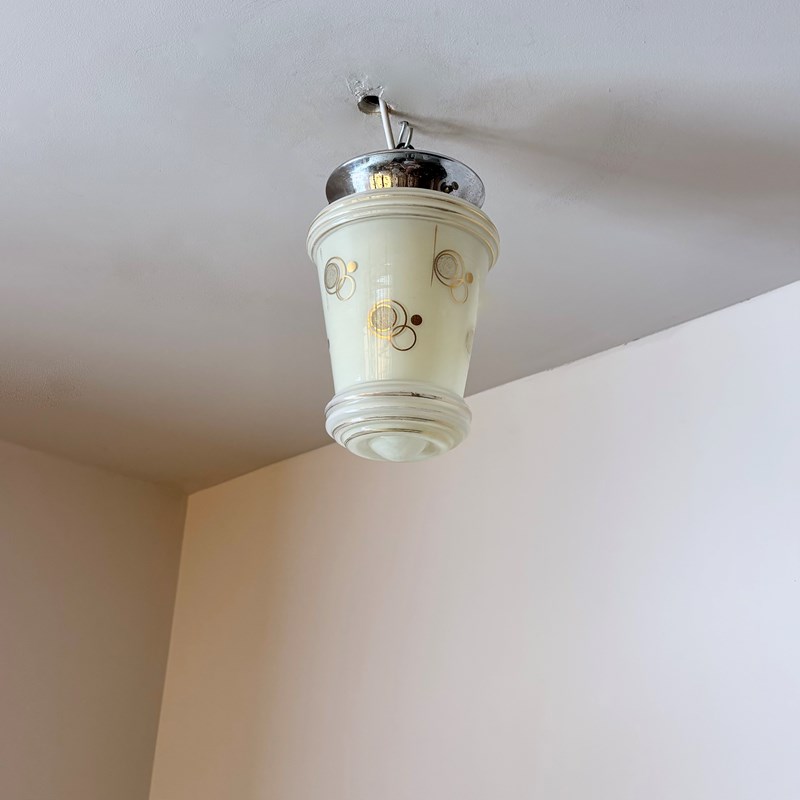 This has been newly wired here, in Stockport, near Manchester by our small team of experts and are now ready to be installed. We recommend that this is installed by an electrician into a joist or a supporting noggin. To clean dust the metal components regularly with a soft cloth. The glass shade can then be wiped with a glass wipe or a cloth that has been sprayed with glass cleaner. A final wipe with a paper towel will give a polished finish.