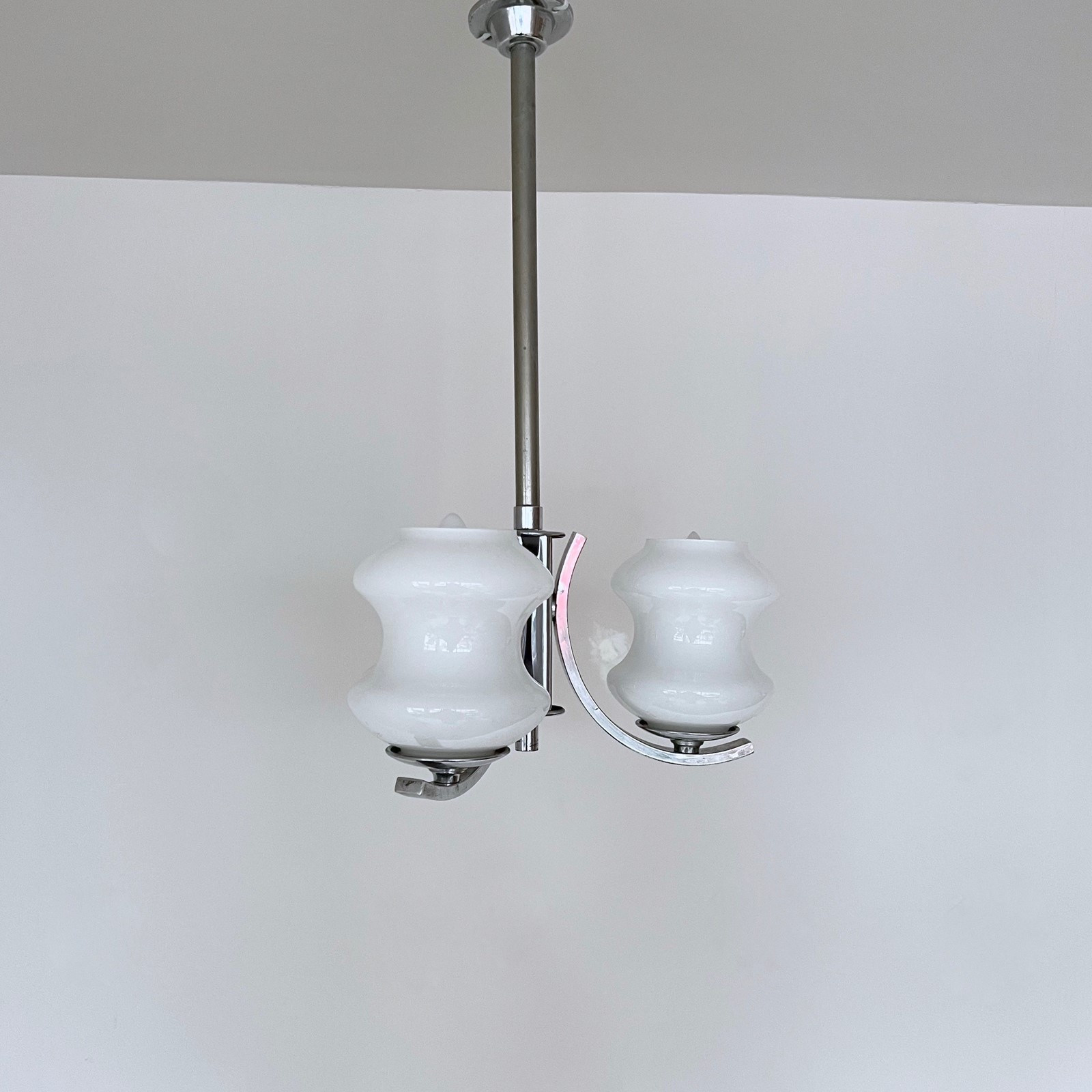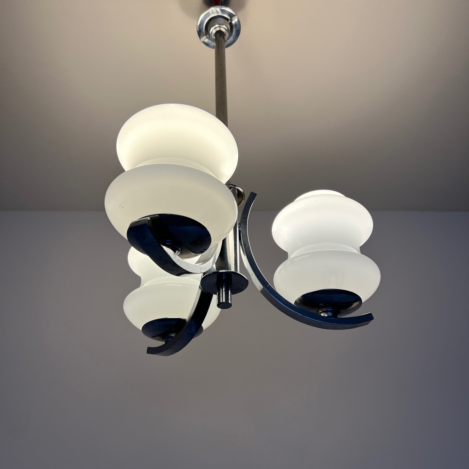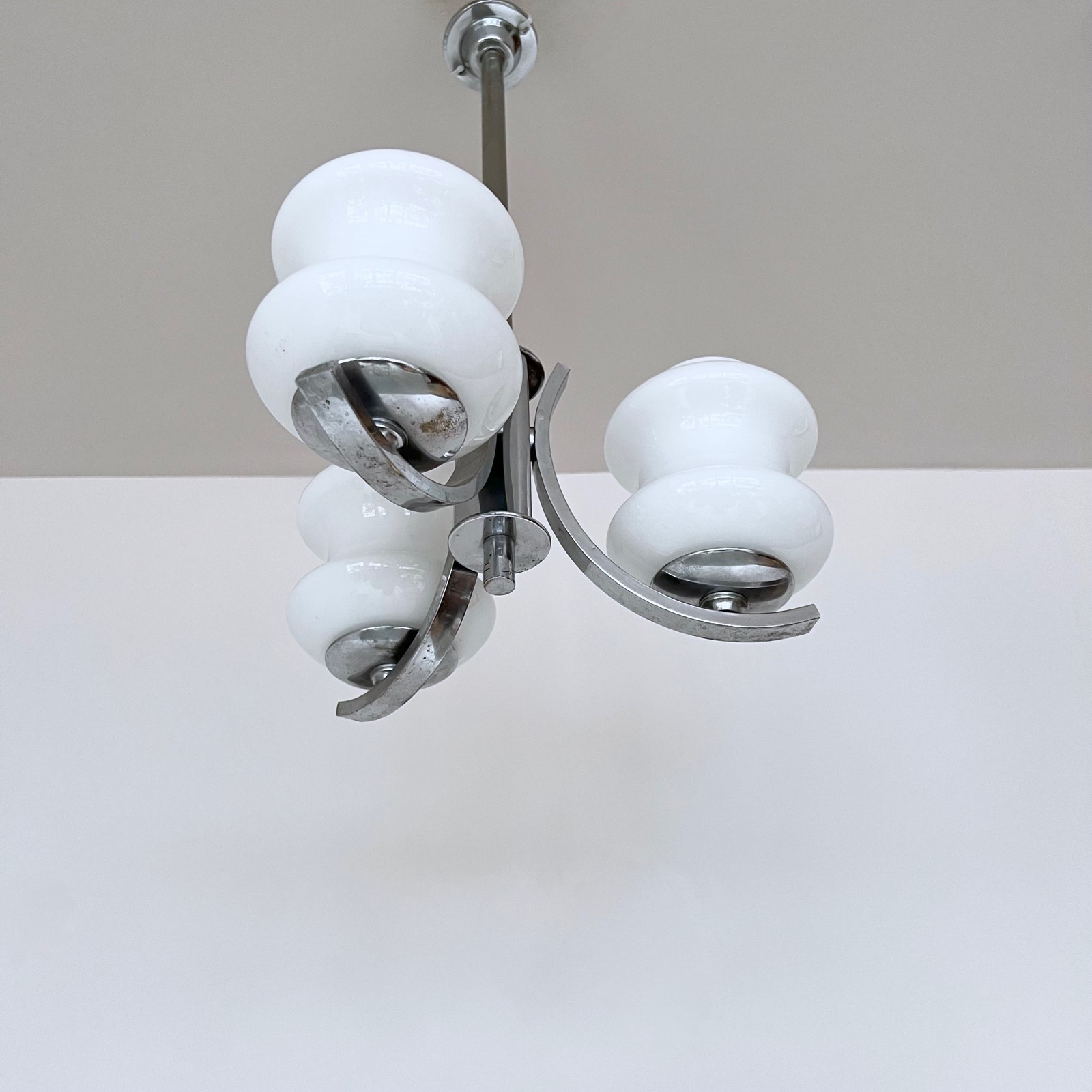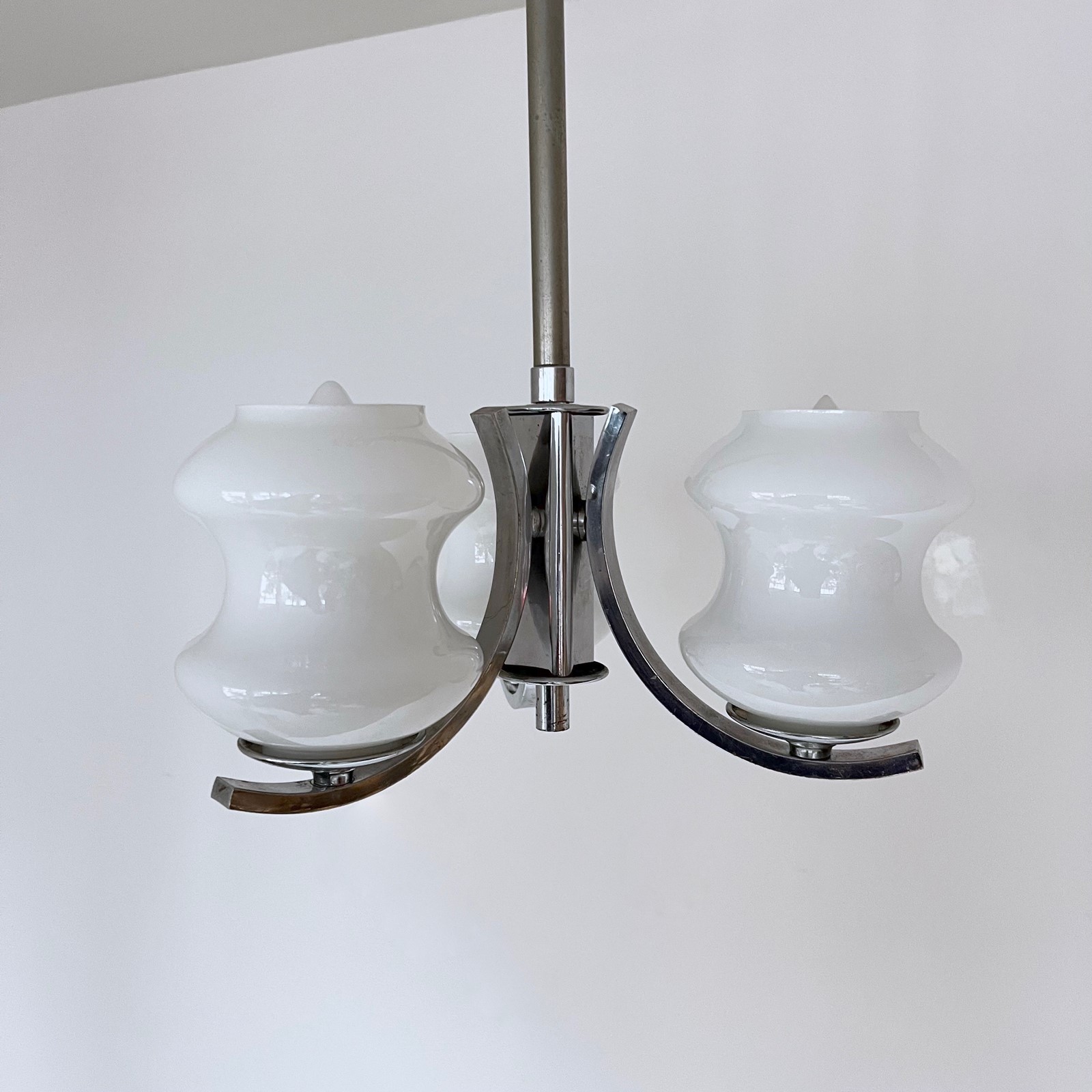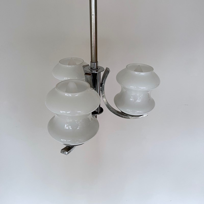 Mid century chromed pendant with three original polished glass shades. The pendant requires three B22 lamps, these are not included and it fits directly to the ceiling. This pendant has been fully restored and rewired here, in Stockport, near Manchester by our small team of experts and is now ready to be installed. We recommend that this pendant is installed by an electrician and into a joist or a supporting noggin. To clean the pendant dust the metal components regularly with a soft cloth. The shades can then be wiped with a glass wipe or a cloth that has been sprayed with glass cleaner. A final wipe with a paper towel will give a polished finish.