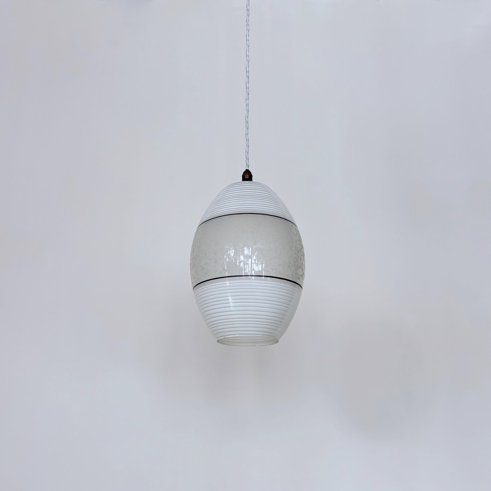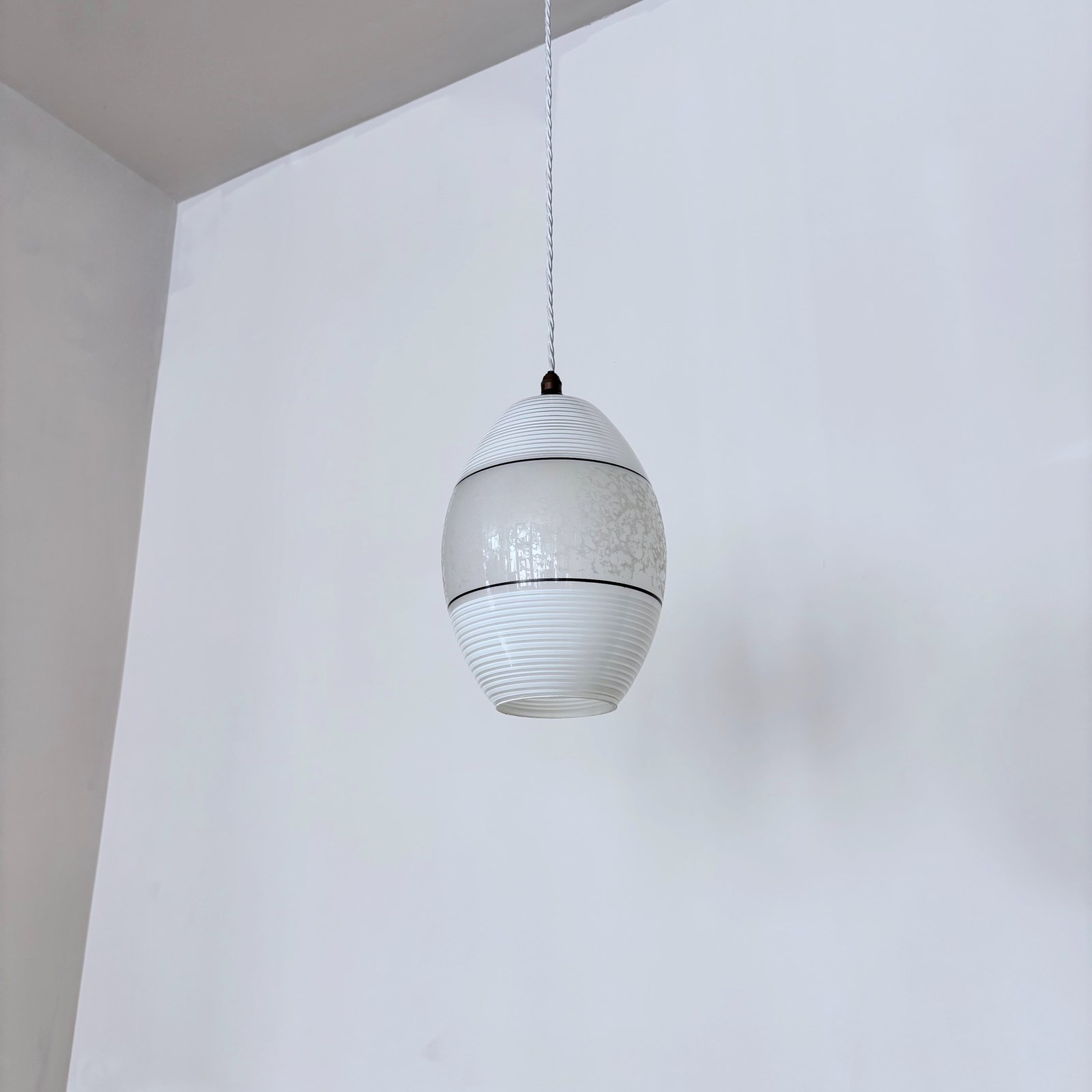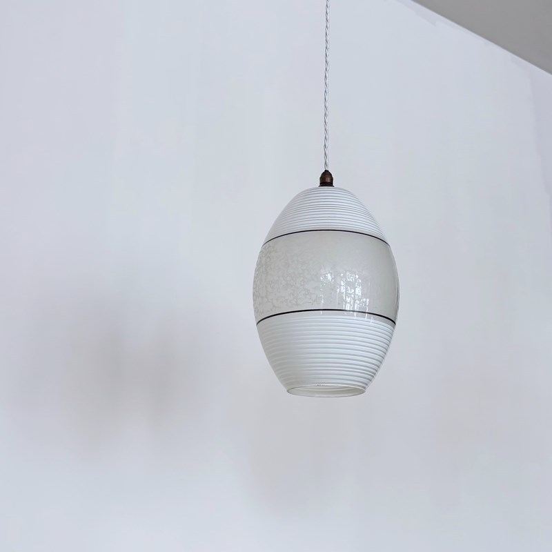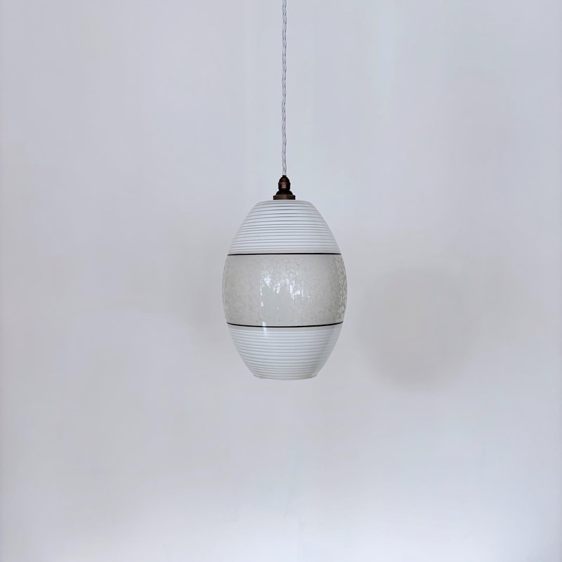 Moulded decorative glass shade with white and black details. Finished with an antique brass finish fitting and white braided cable. The coloured braided flex can be changed to your preference and a matching ceiling fitting is supplied. The shade requires one b22 bulb. This is not included but can be supplied.