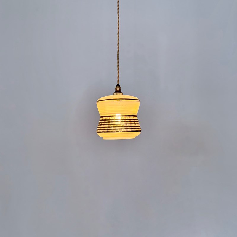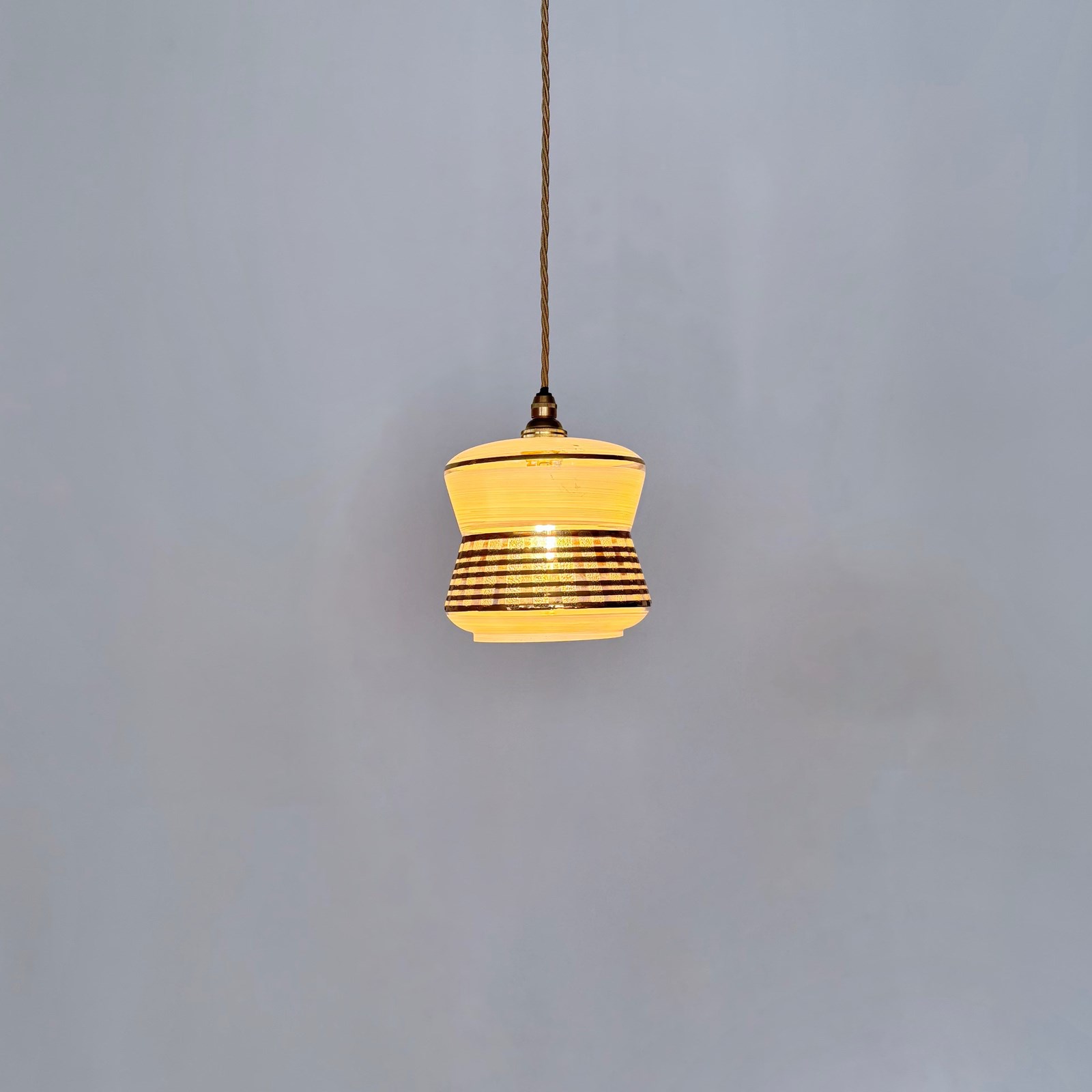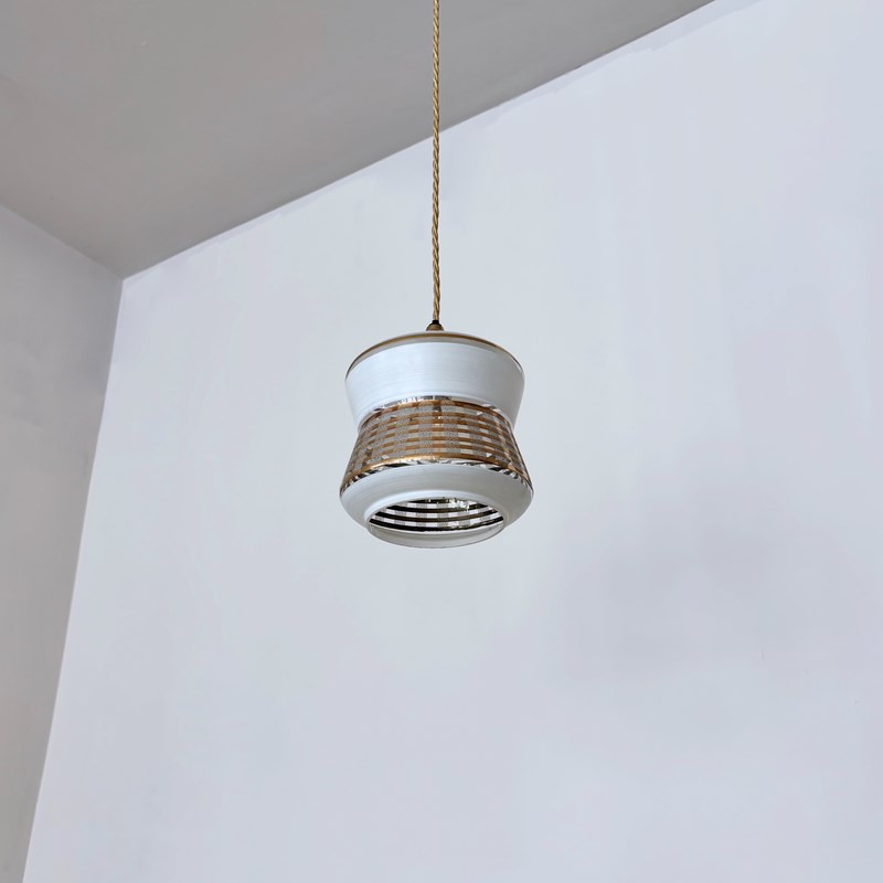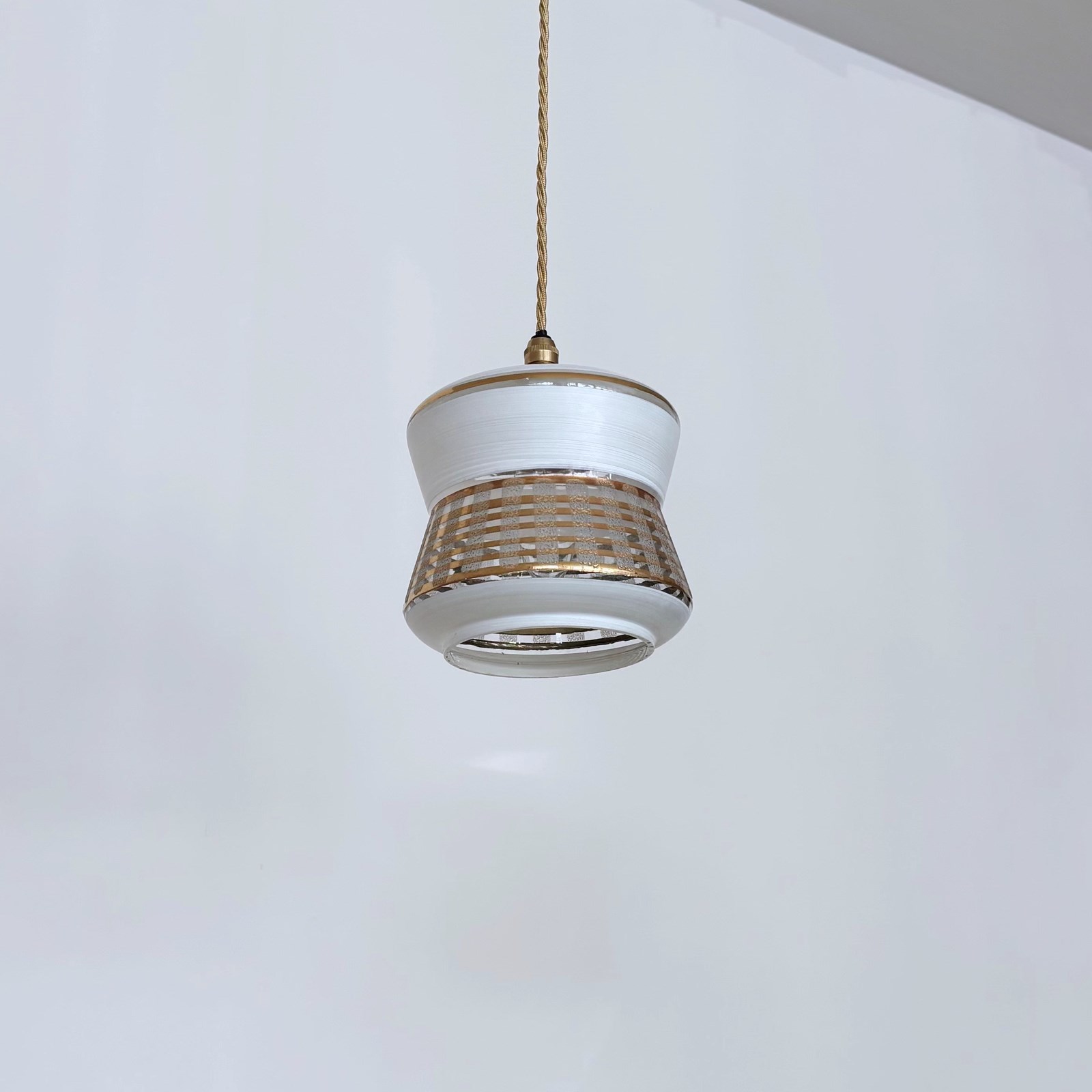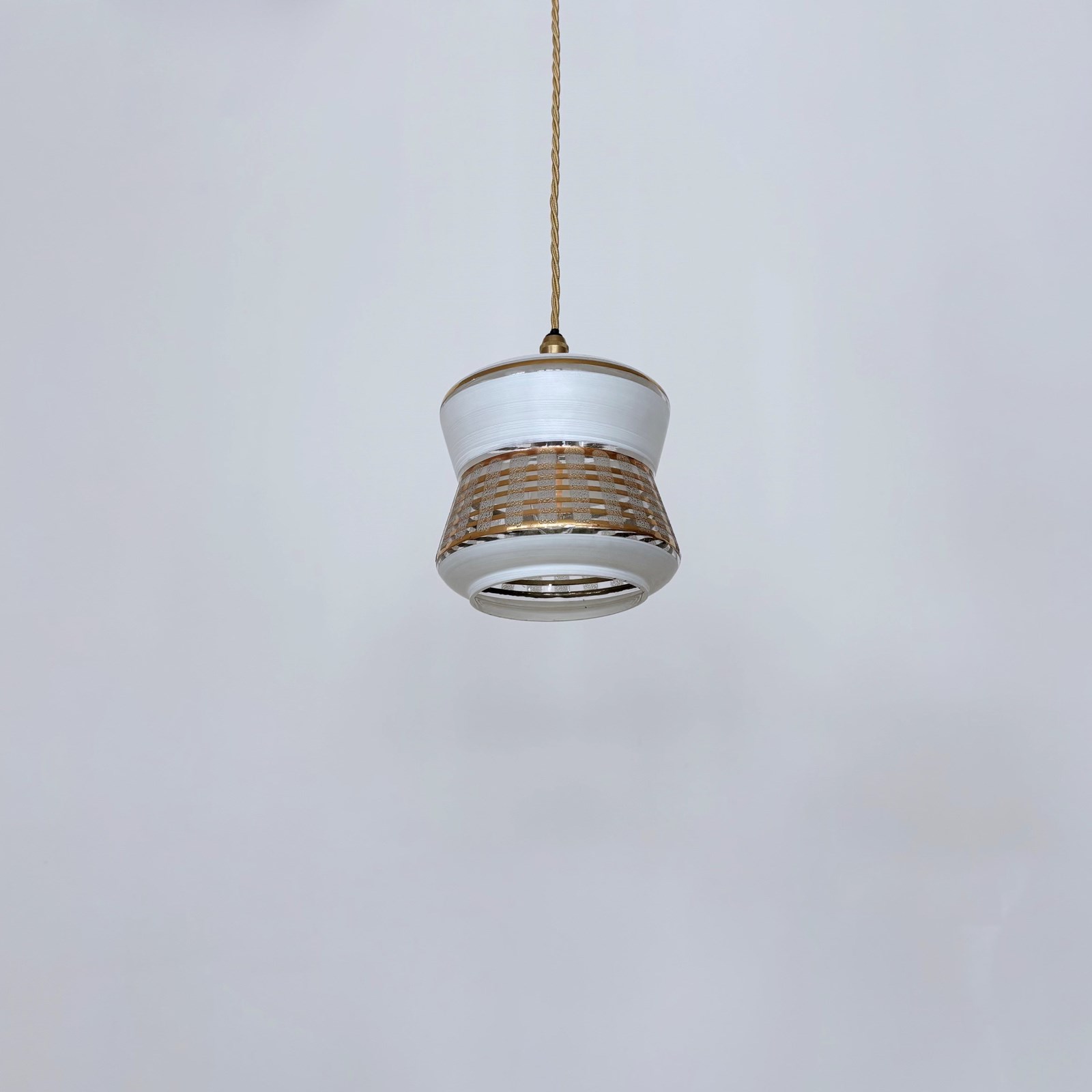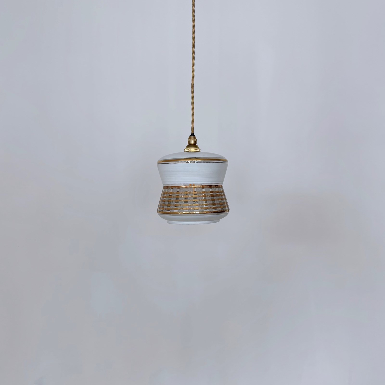 White glass shade with gold bands finished with a polished brass finish fitting and satin gold braided cable. The coloured braided flex can be changed to your preference and a matching ceiling fitting is supplied. The shade requires one b22 bulb. This is not included but can be supplied.