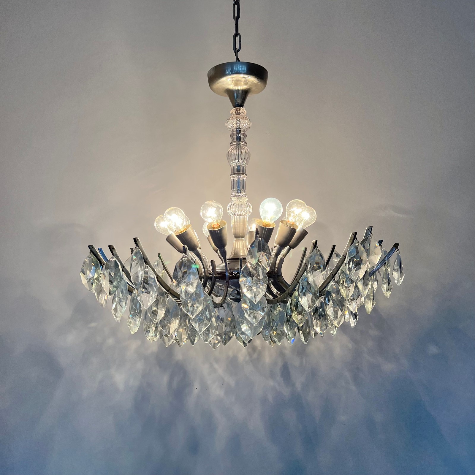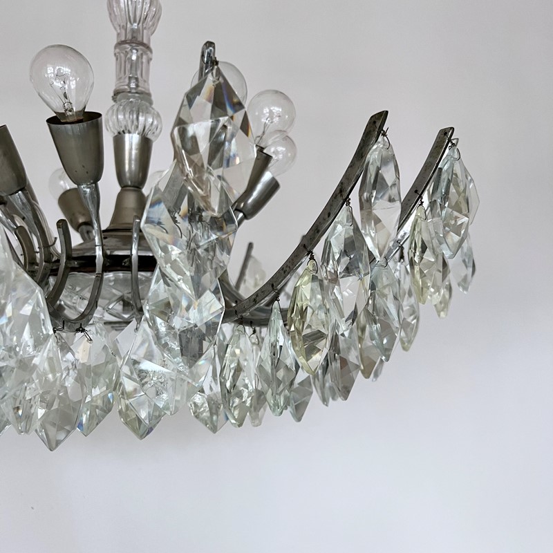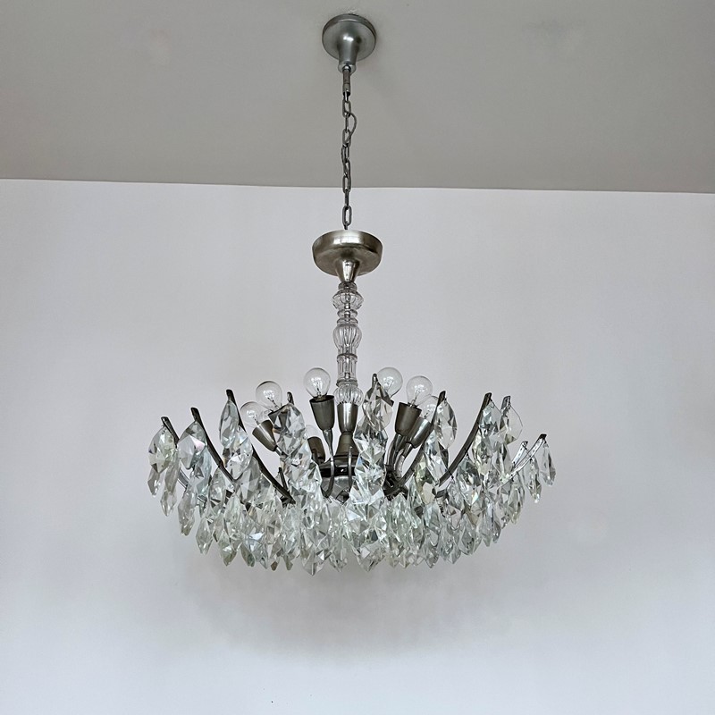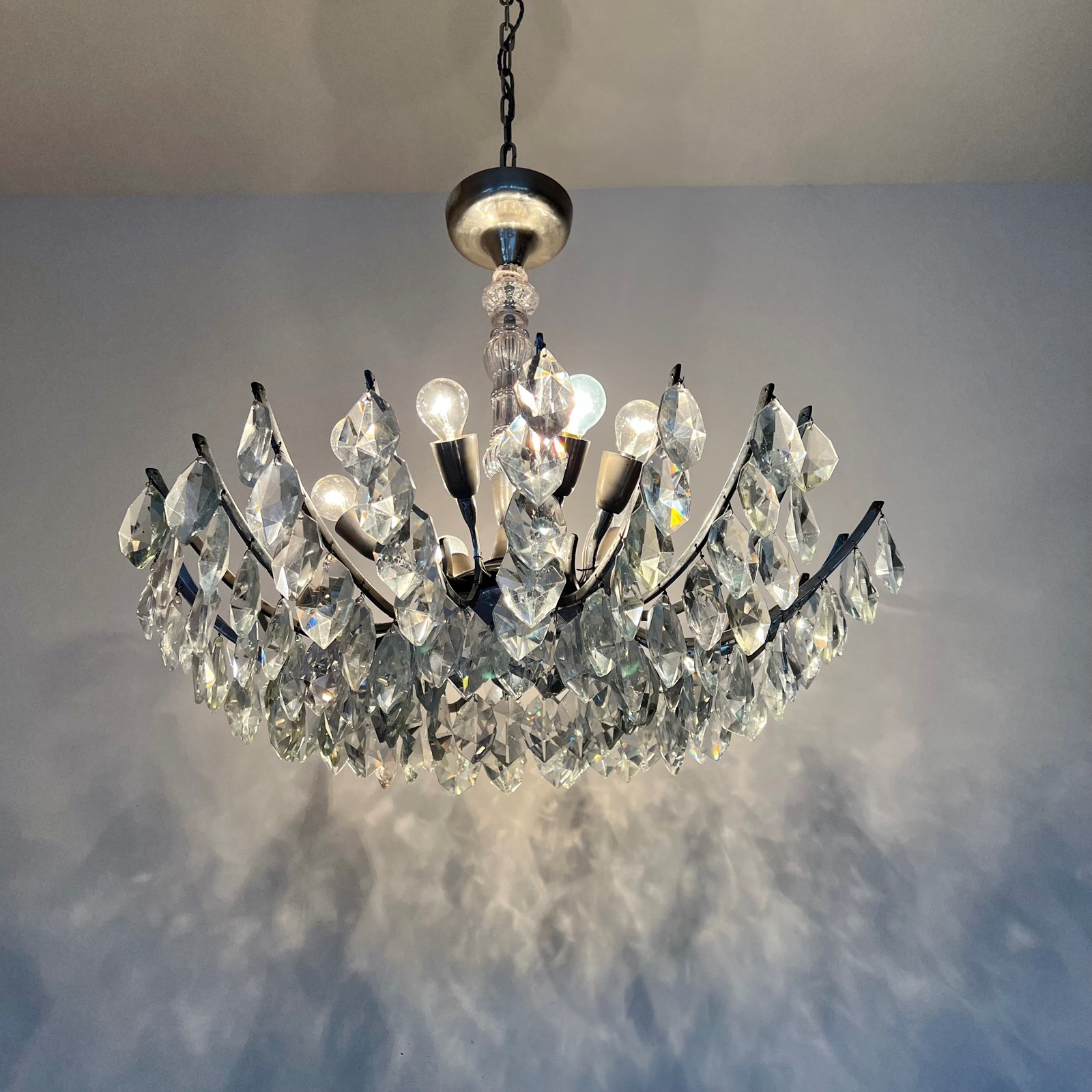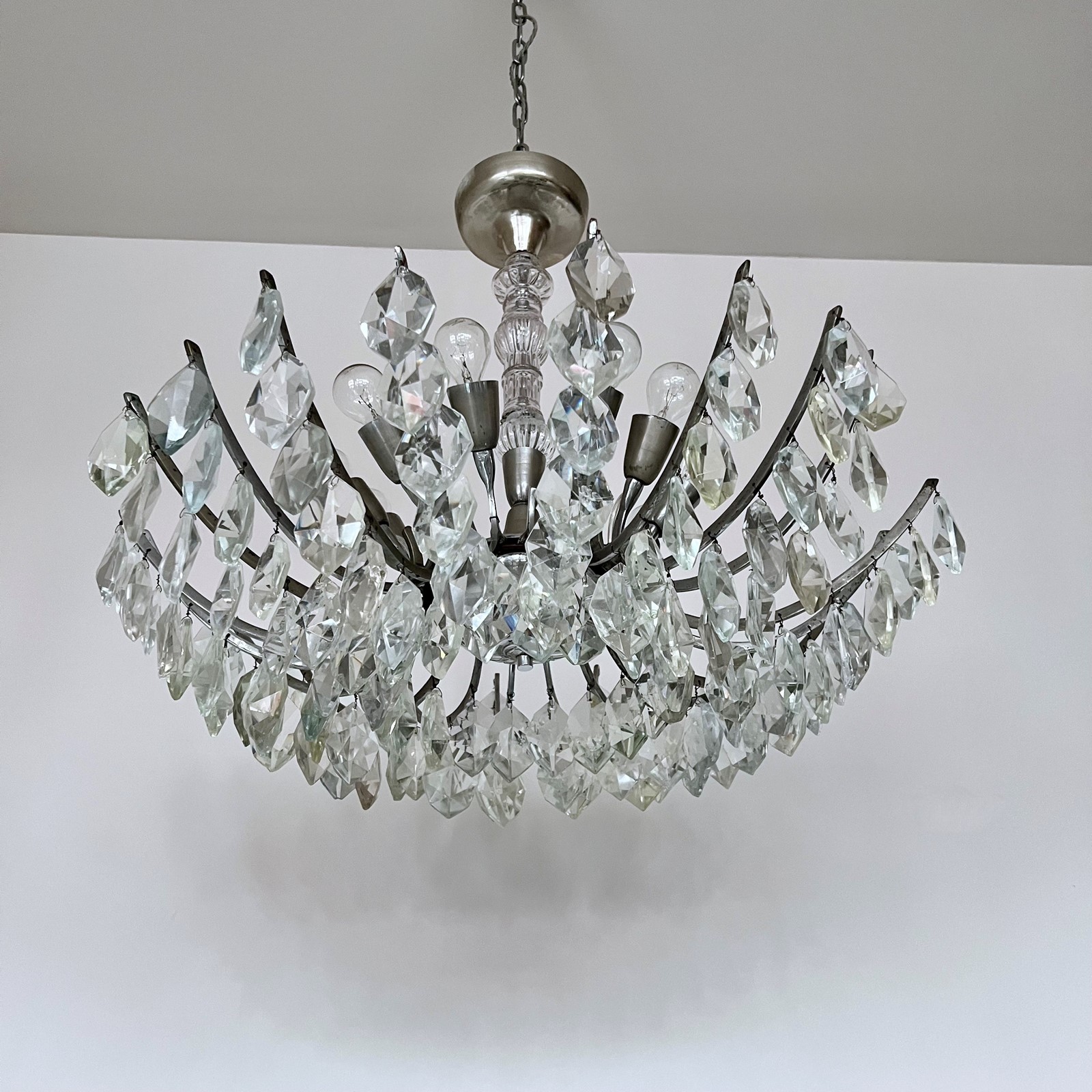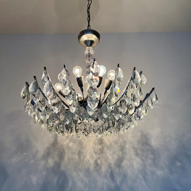 Multi arm chandelier dressed in chunky hand cut crystal iceberg drops. The frame is nickel plated giving a silver finish.The mix of vintage crystal iceberg drops have some slight variations in colour. Please see photos. There are ten B15 lamp holders in the centre of the chandelier. The chandelier is supplied with braided flex, chain, ceiling rose and a chandelier hook plate. The chandelier has been fully restored and rewired here in Stockport, near Manchester by our small team of professionals and are now ready to be installed. We recommend that this brass and crystal multi-arm chandelier is installed by an electrician into a joist or a supporting noggin. To clean the chandelier dust the frame regularly with a soft cloth. The crystal droppers can then be wiped with a glass cleaner wipe or a cloth that has been sprayed with glass cleaner. A final wipe with a paper towel will give a polished finish.