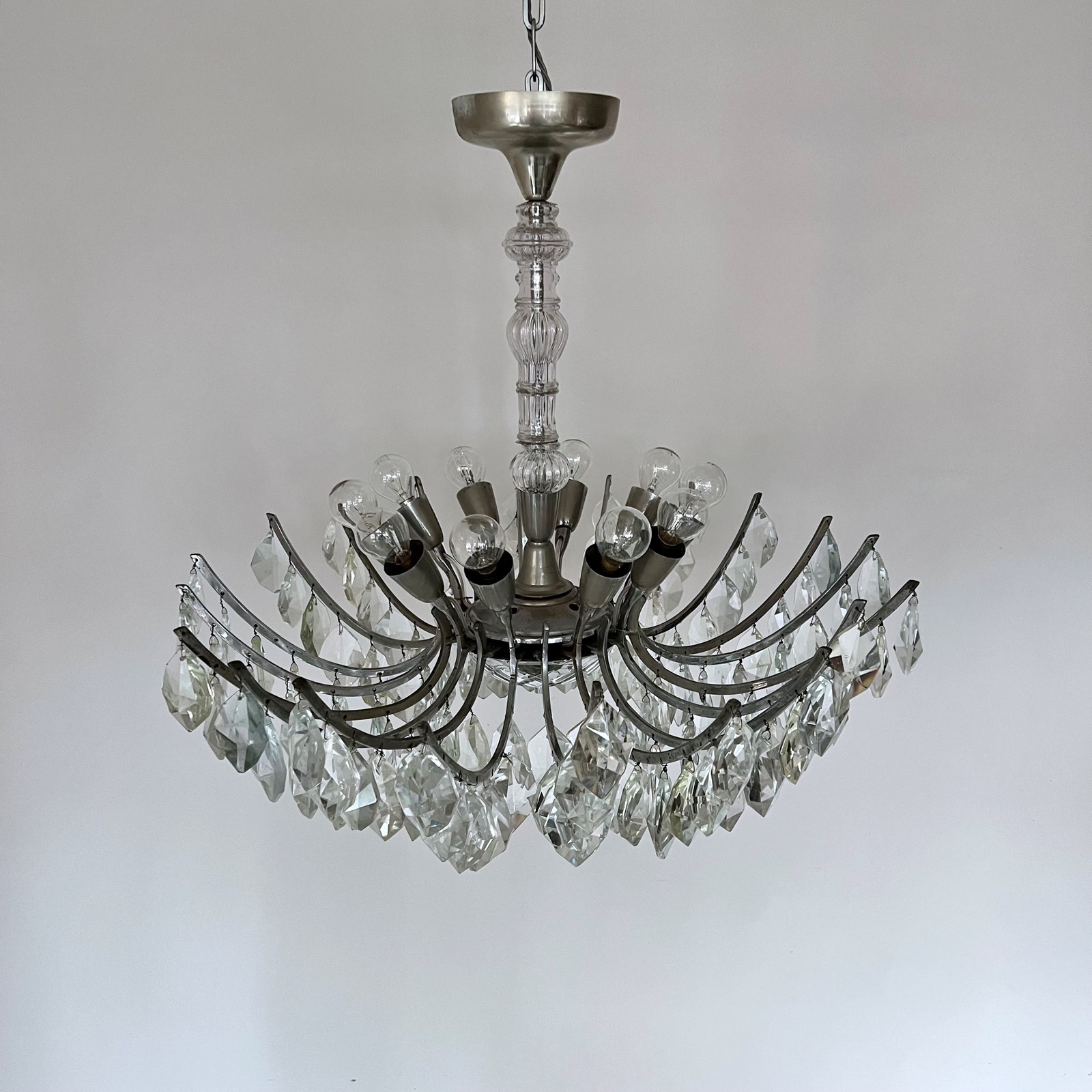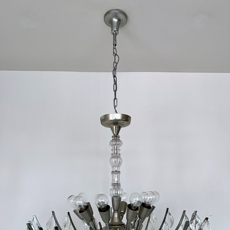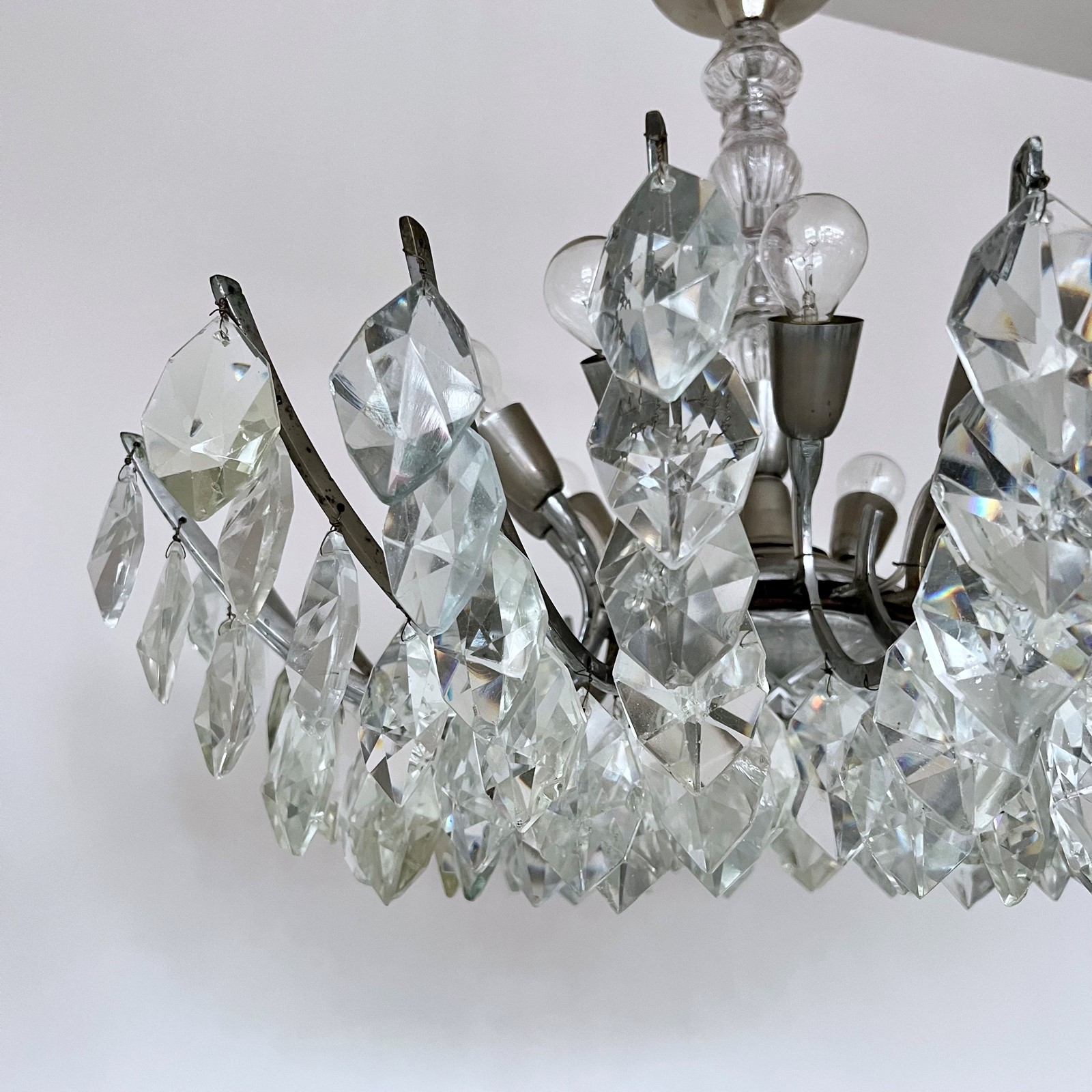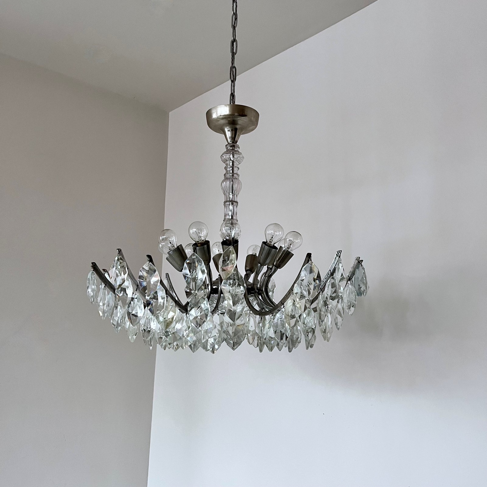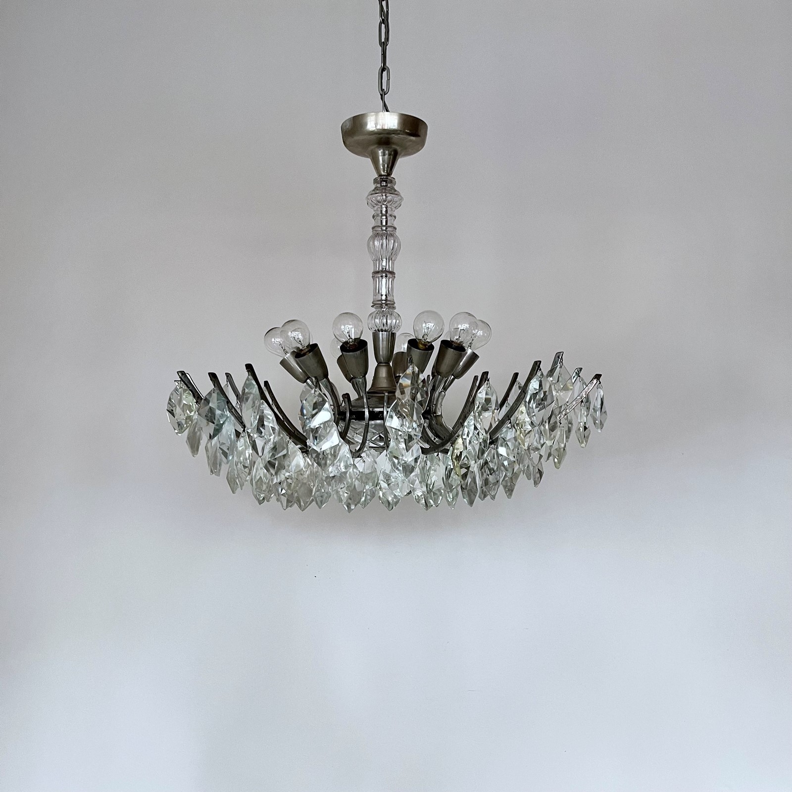 Multi arm chandelier dressed in chunky hand cut crystal iceberg drops. The frame is nickel plated giving a silver finish.The mix of vintage crystal iceberg drops have some slight variations in colour. Please see photos. There are ten B15 lamp holders in the centre of the chandelier. The chandelier is supplied with braided flex, chain, ceiling rose and a chandelier hook plate. The chandelier has been fully restored and rewired here in Stockport, near Manchester by our small team of professionals and are now ready to be installed. We recommend that this brass and crystal multi-arm chandelier is installed by an electrician into a joist or a supporting noggin. To clean the chandelier dust the frame regularly with a soft cloth. The crystal droppers can then be wiped with a glass cleaner wipe or a cloth that has been sprayed with glass cleaner. A final wipe with a paper towel will give a polished finish.