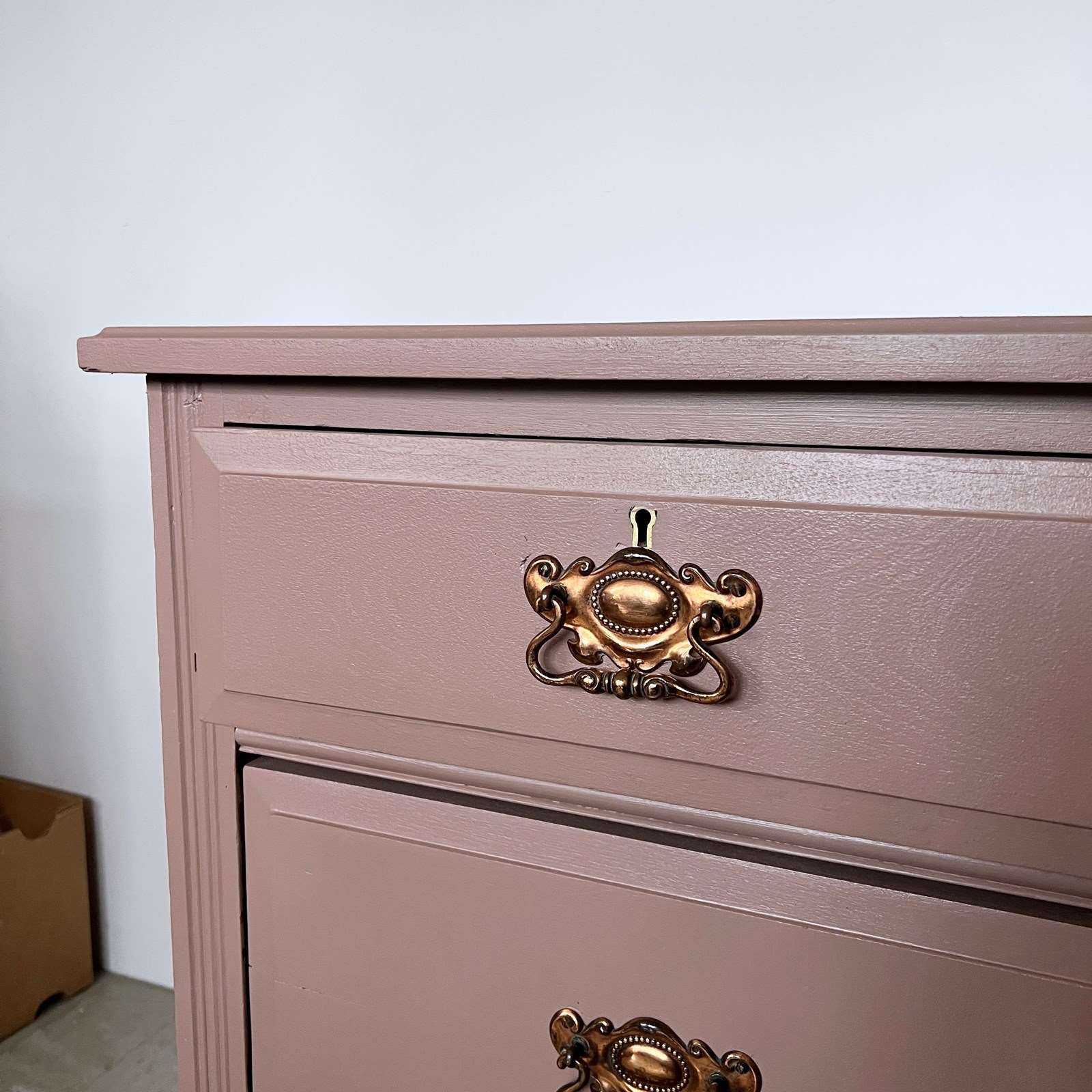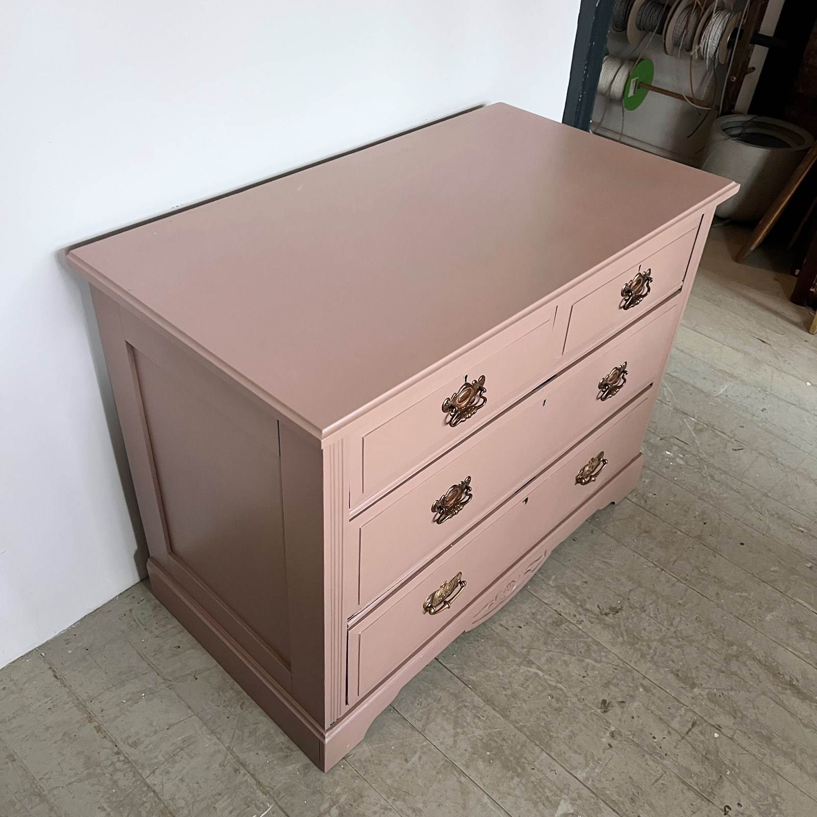 Newly painted solid wood chest of drawers. Painted in Mchanga (337) by Paint and Paper Library. The handles are different to the rest on the bottom drawer.