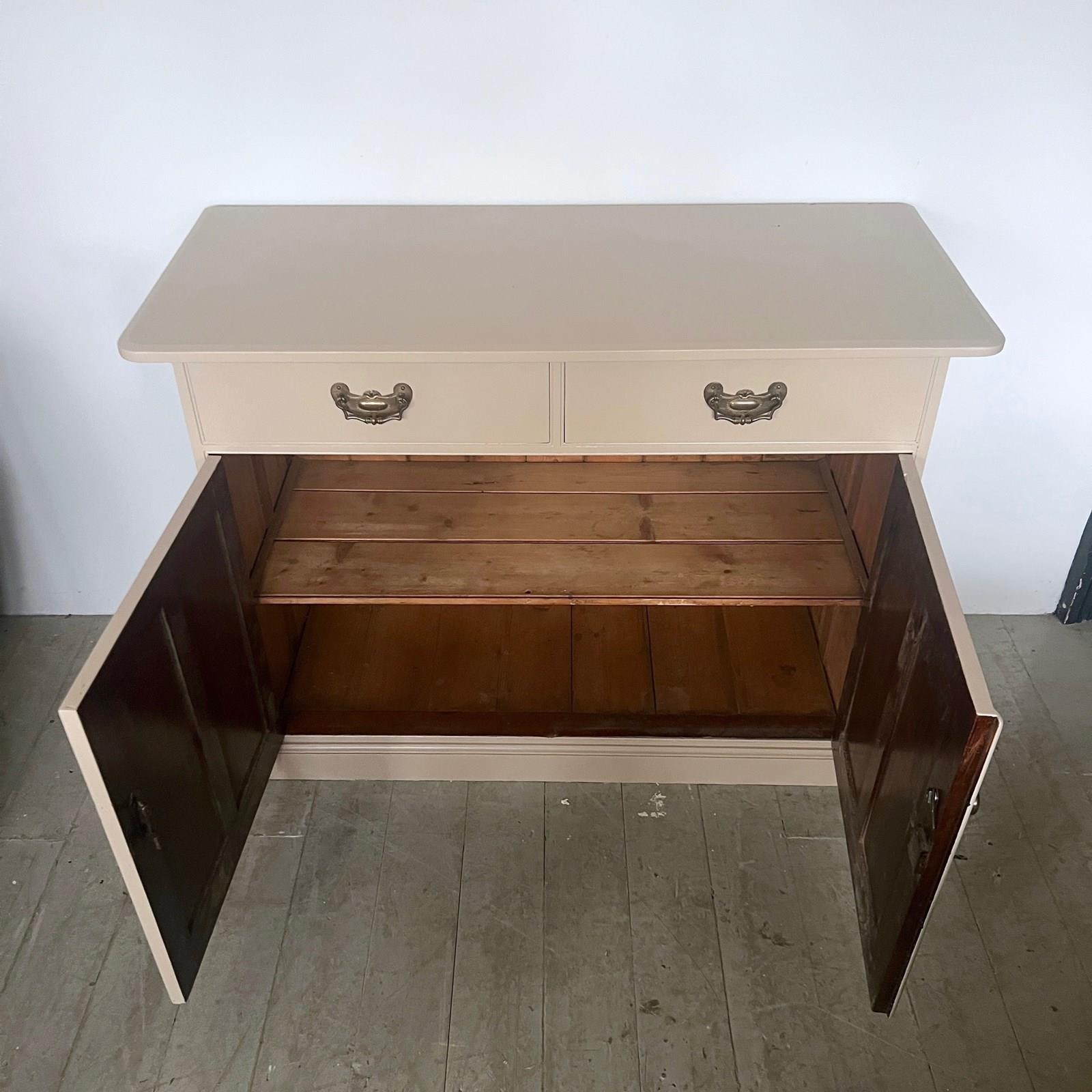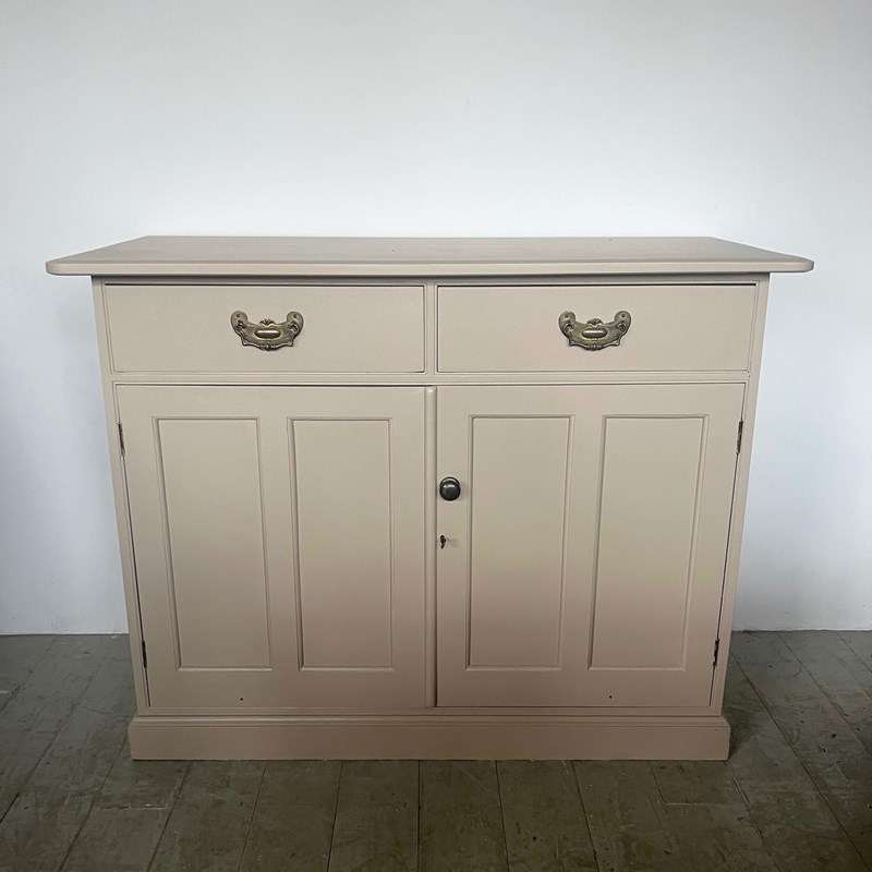 Wooden sideboard newly painted in Mink (297) eggshell paint by Paint & Paper Library. Two drawers and a lower pot cupboard with internal shelf.