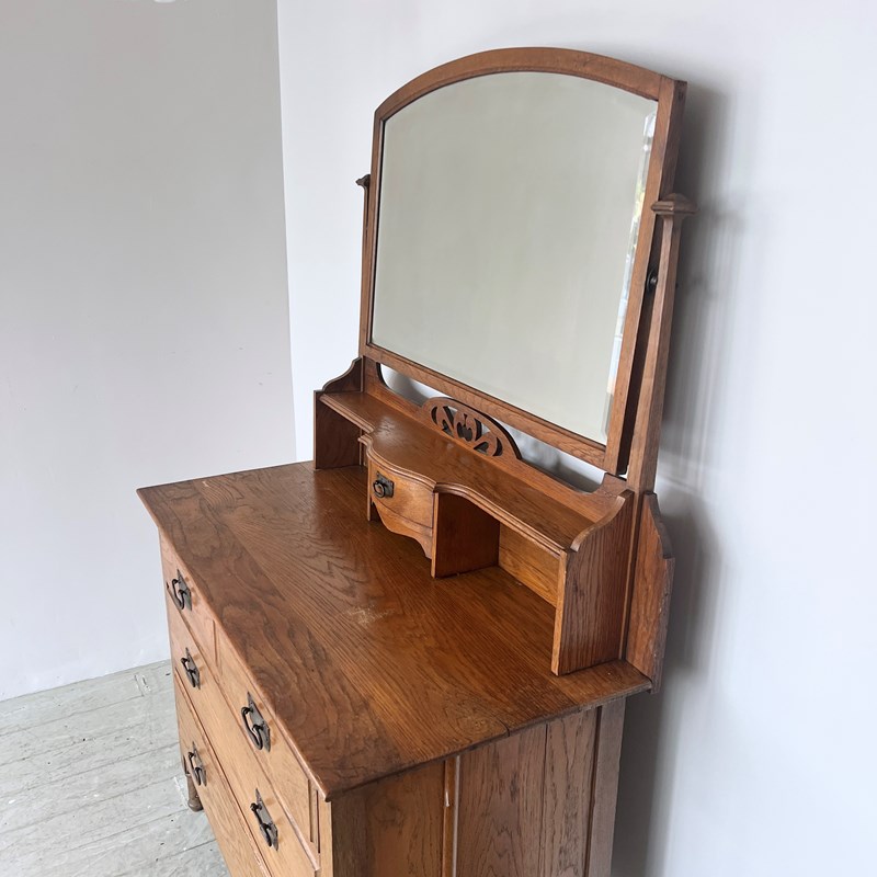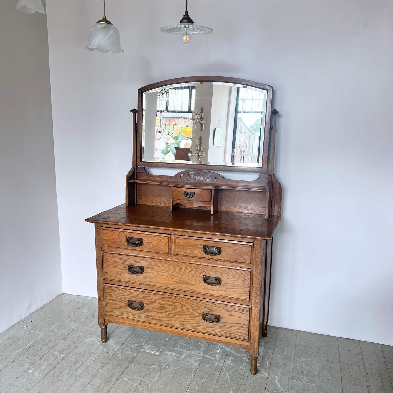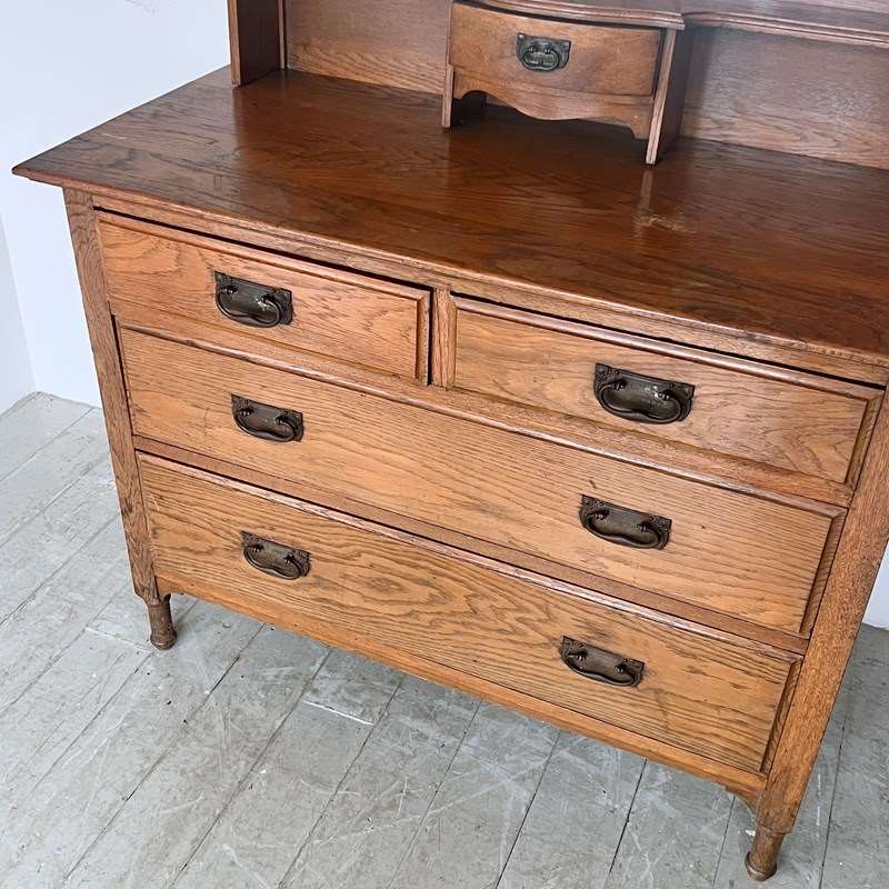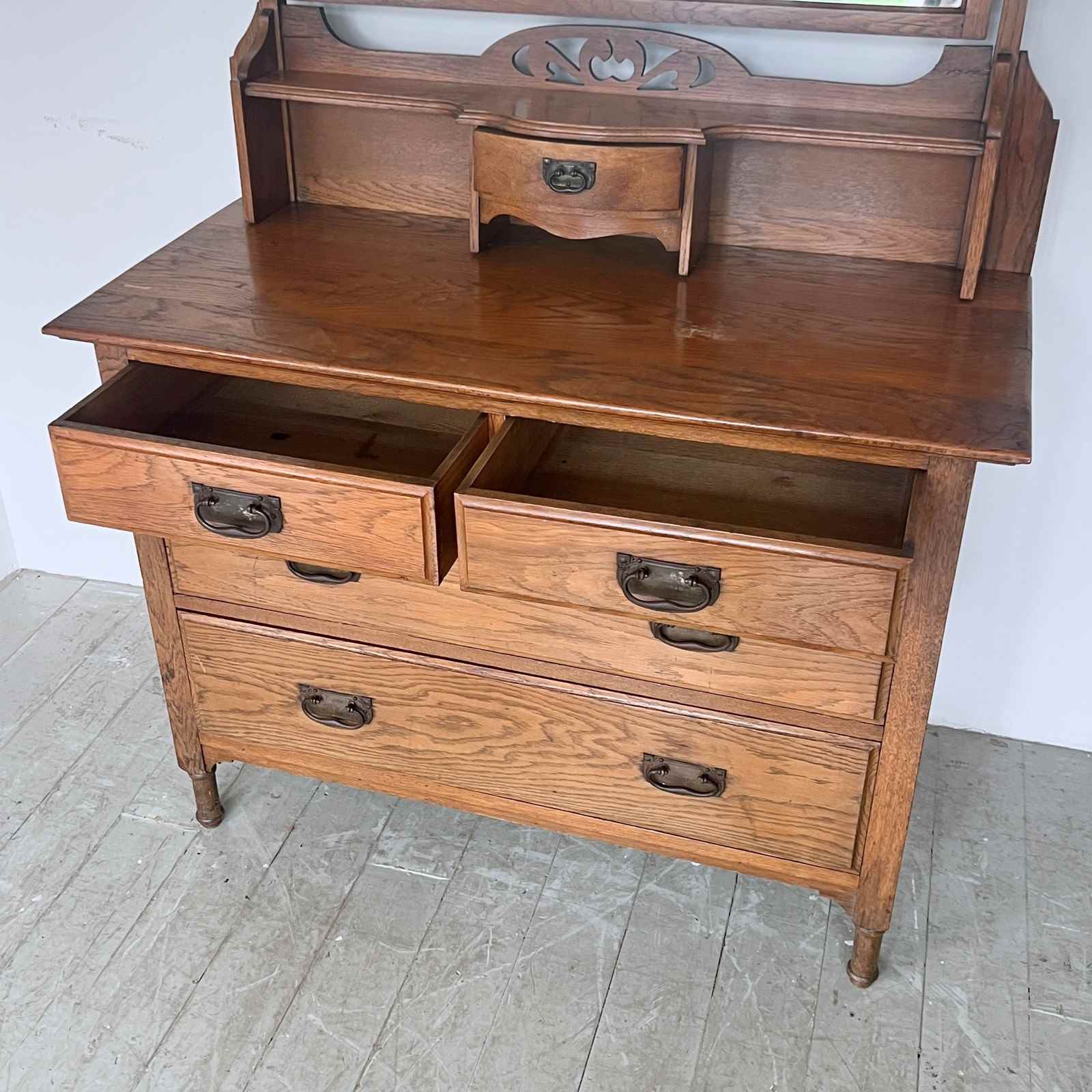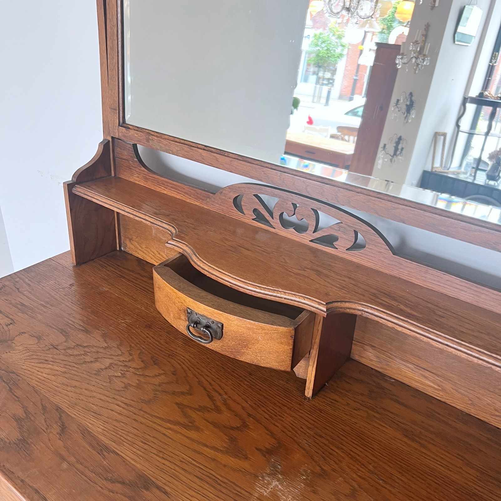 Oak Art Nouveau dresser with mirror and upper small drawer. The lower features two over two drawers.