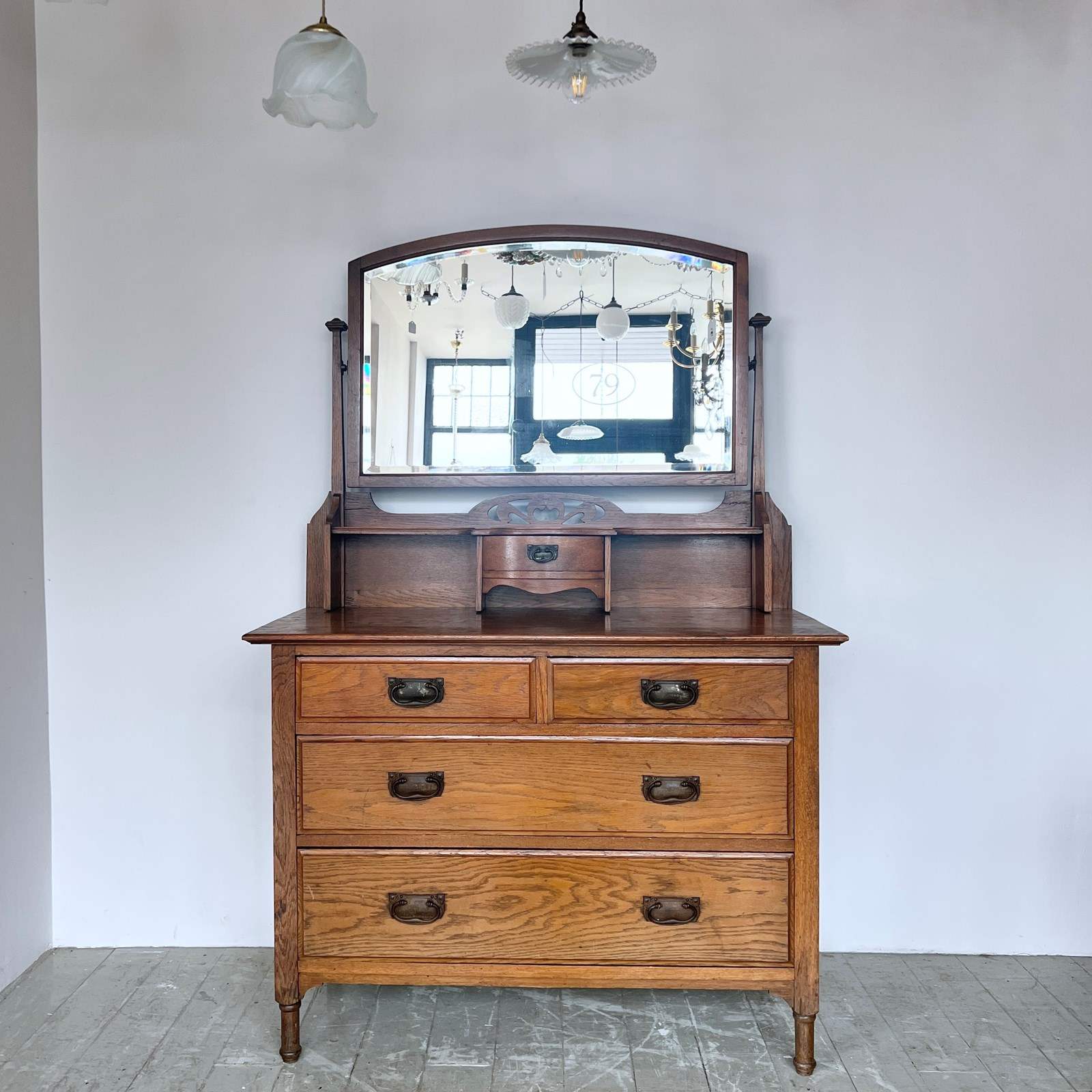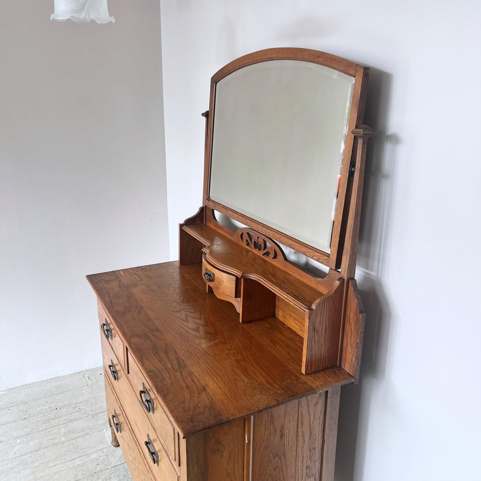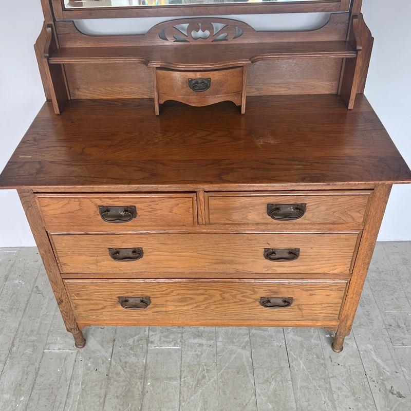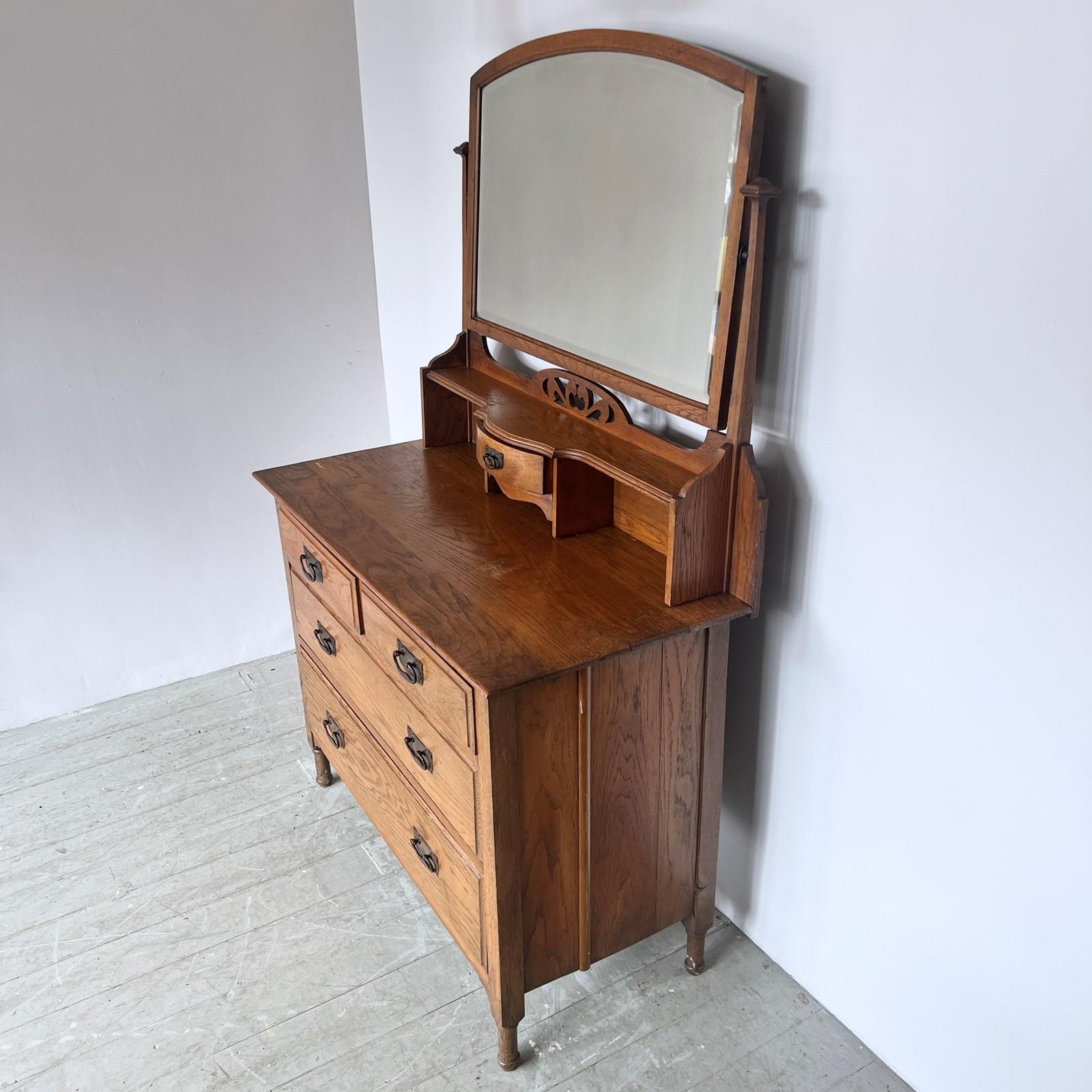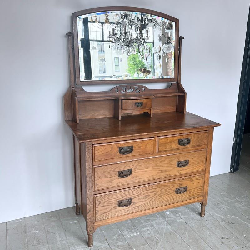 Oak Art Nouveau dresser with mirror and upper small drawer. The lower features two over two drawers.