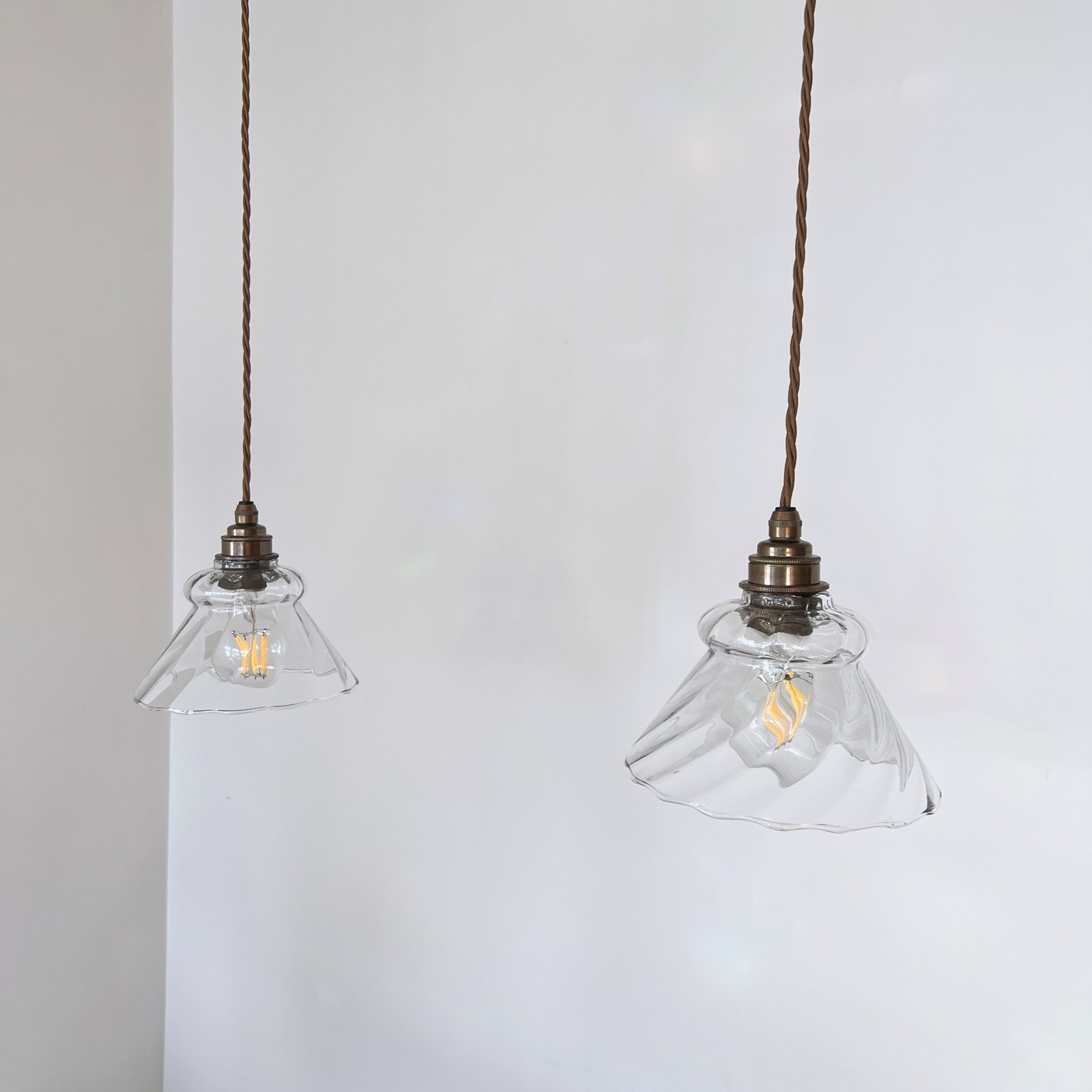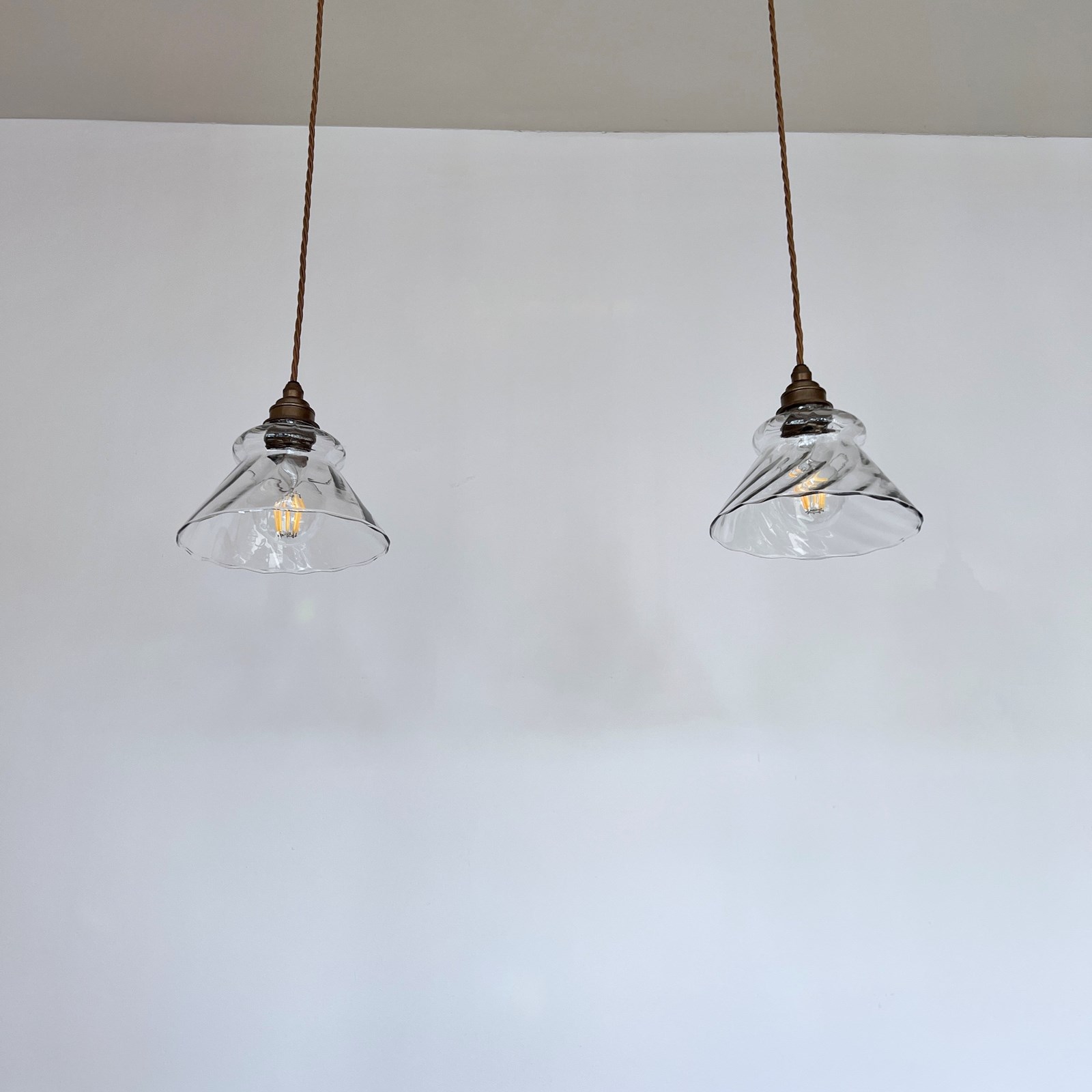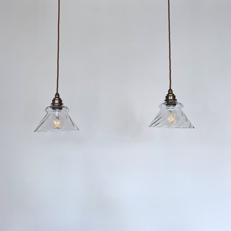 Pair of clear glass shades. Each rewired with an antique brass finish fitting and light brown braided flex. Each shade requires one E27 lamp, these are not included but can be supplied. The coloured flex can be changed to your preference and a matching ceiling fitting is supplied.