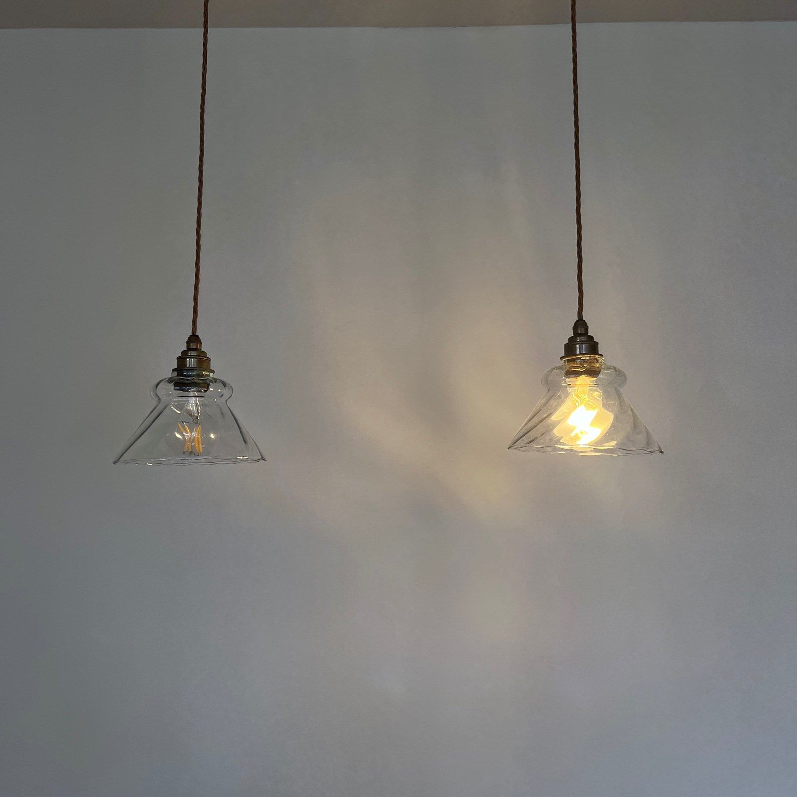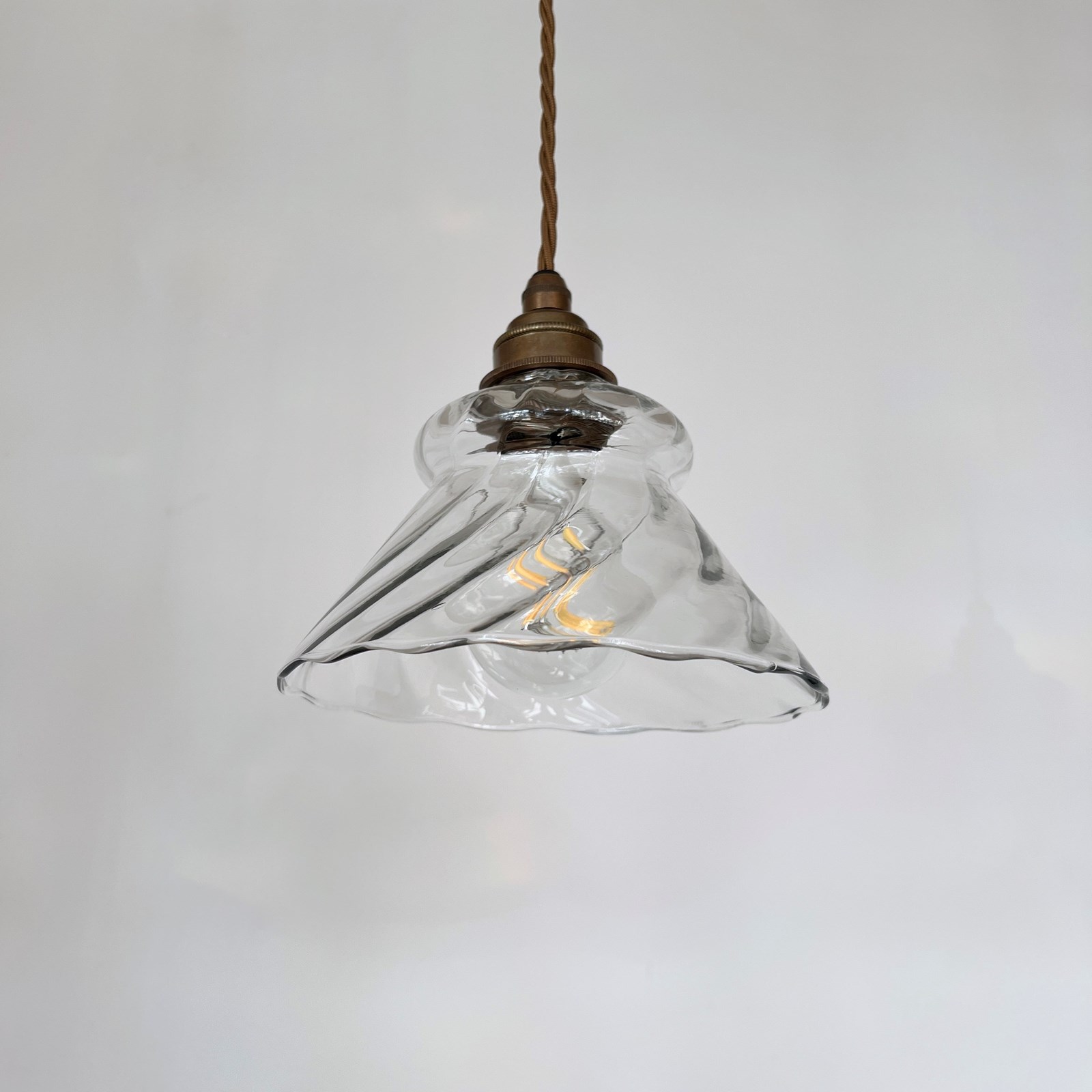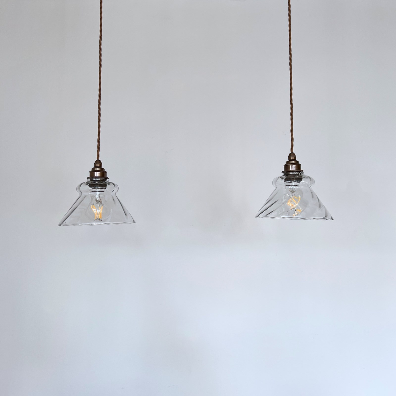 Pair of clear glass shades. Each rewired with an antique brass finish fitting and light brown braided flex. Each shade requires one E27 lamp, these are not included but can be supplied. The coloured flex can be changed to your preference and a matching ceiling fitting is supplied.