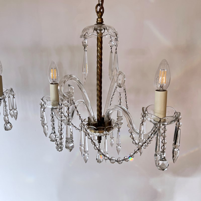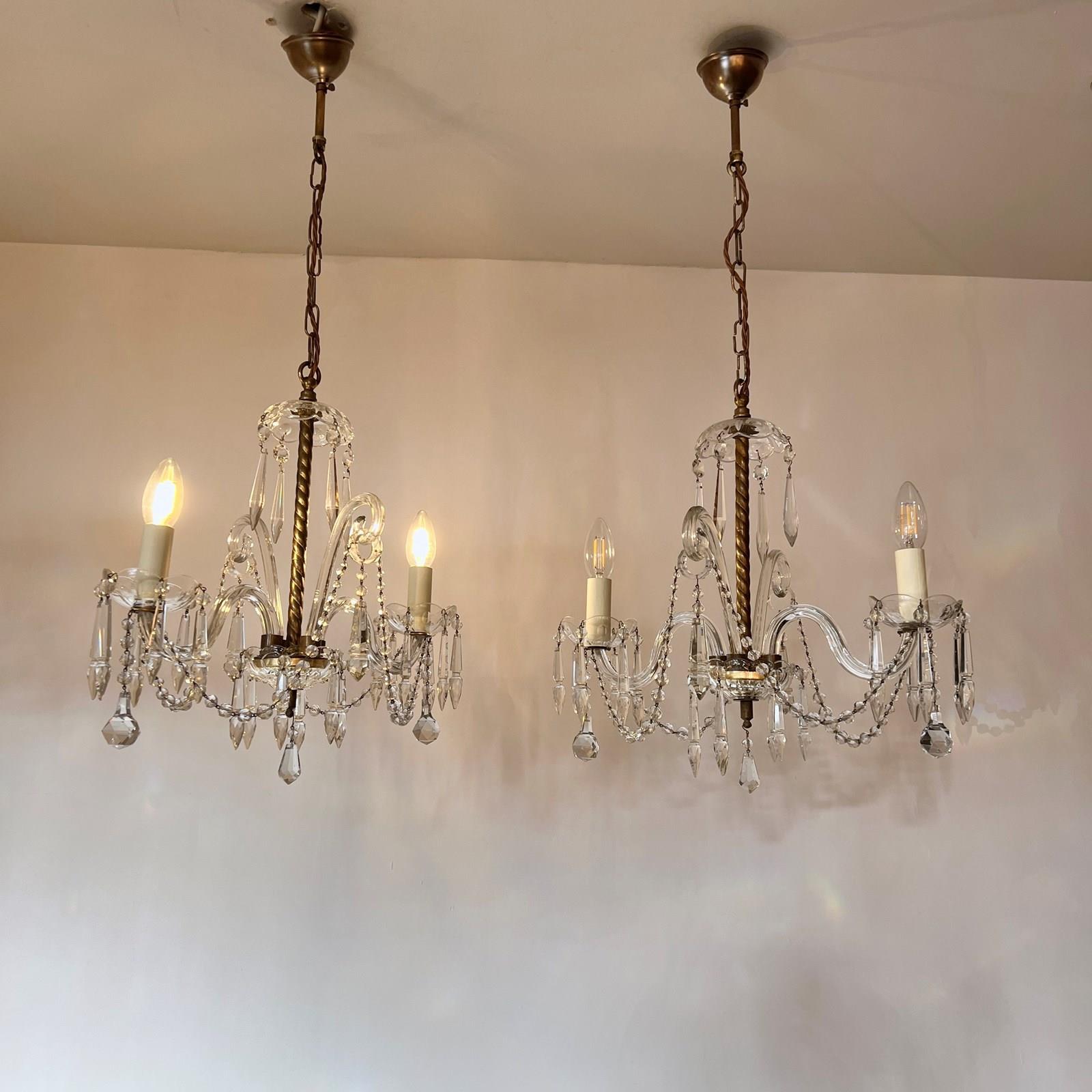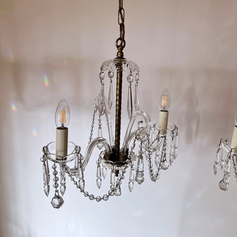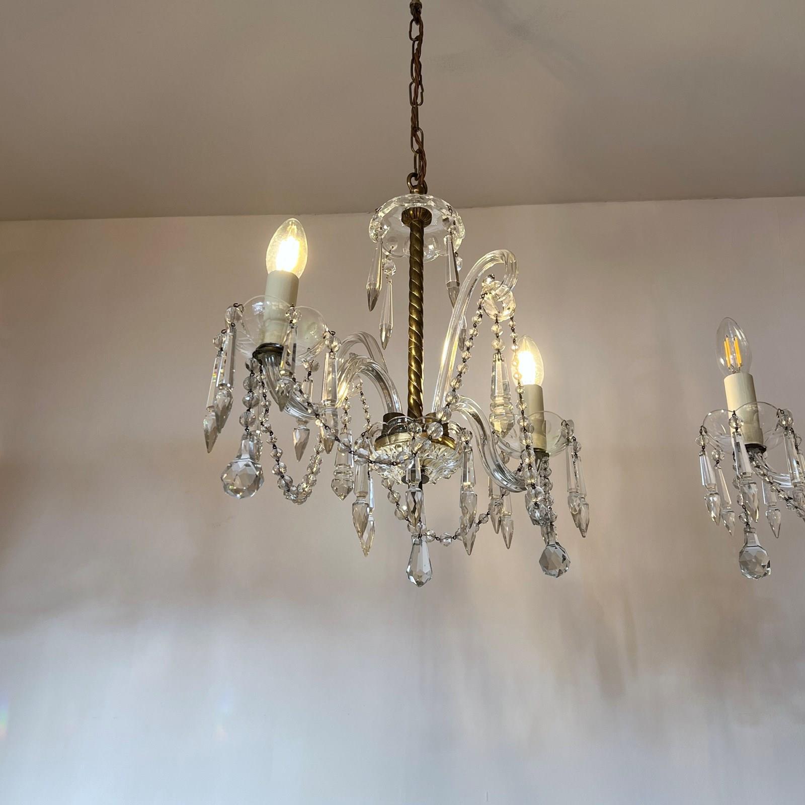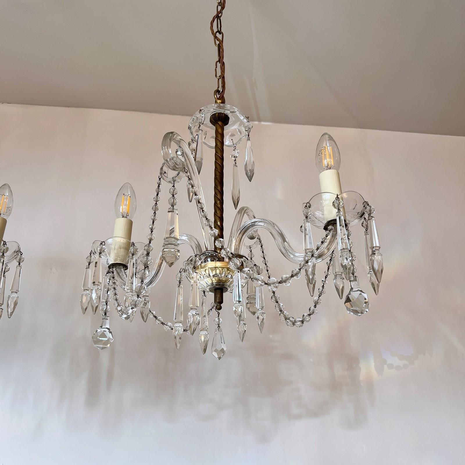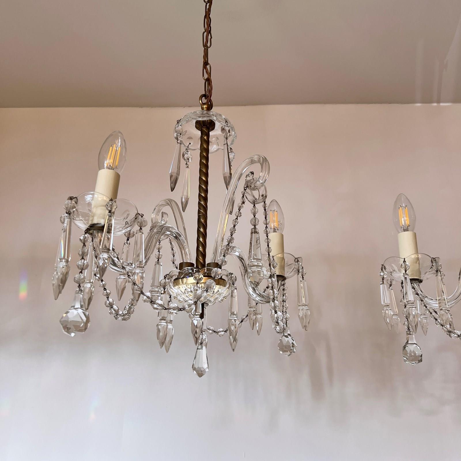 The chandeliers have been fully restored and rewired here, in Stockport, near Manchester by our small team of experts and are now ready to be installed. We recommend that the chandeliers are installed by an electrician and into a joist or a supporting noggin. To clean the chandeliers dust the metal components regularly with a soft cloth or brush. The glass parts and drops can then be wiped with a glass wipe or a cloth that has been sprayed with glass cleaner. A final wipe with a paper towel will give a polished finish.