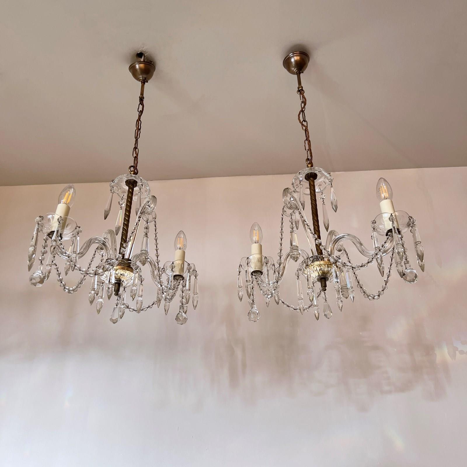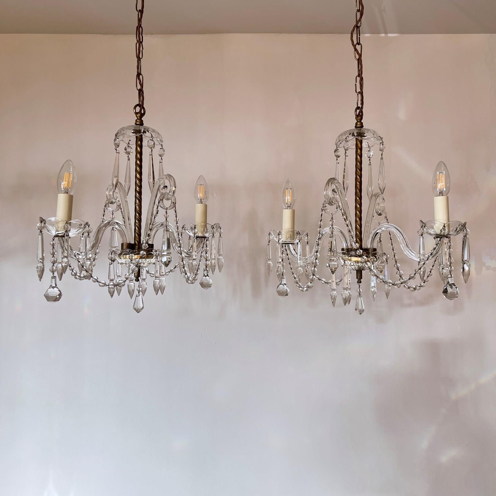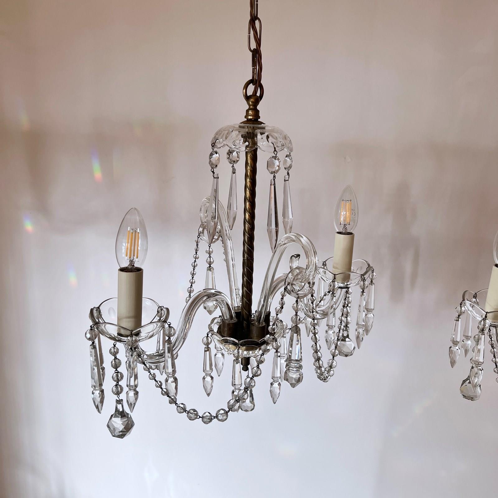 A wonderful pair of French crystal chandeliers with moulded swan neck arms and decorative walking sticks. Cut glass icicle drops and faceted glass beads swags adorn the pieces. They are highly decorative statement pieces which would suit modern or period decor. The chandeliers come supplied with braided flex, decorative chain and a ceiling rose. Each chandelier requires two SES lamps, these are not included but can be supplied.