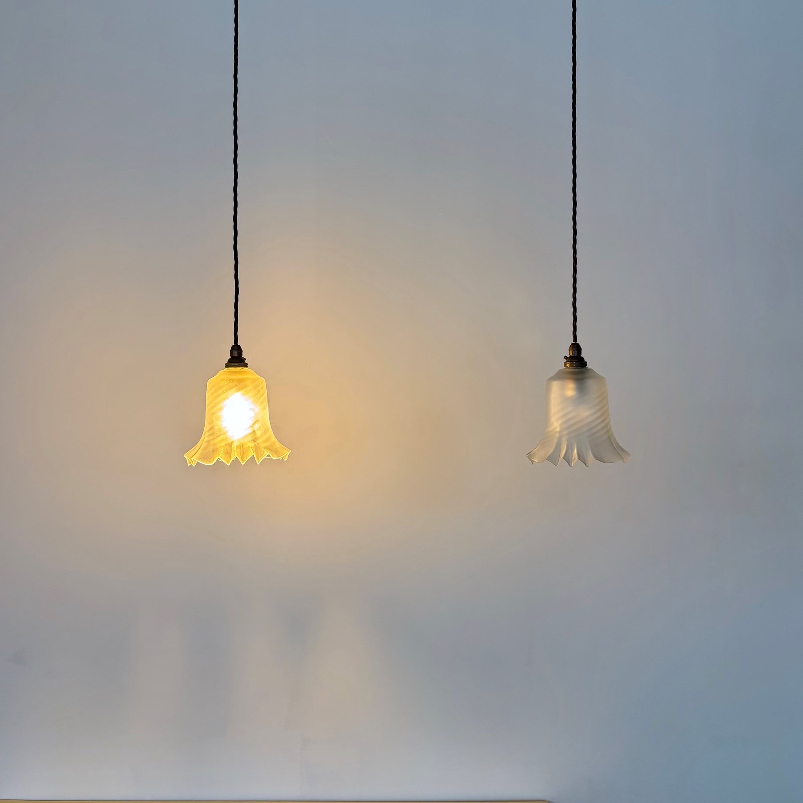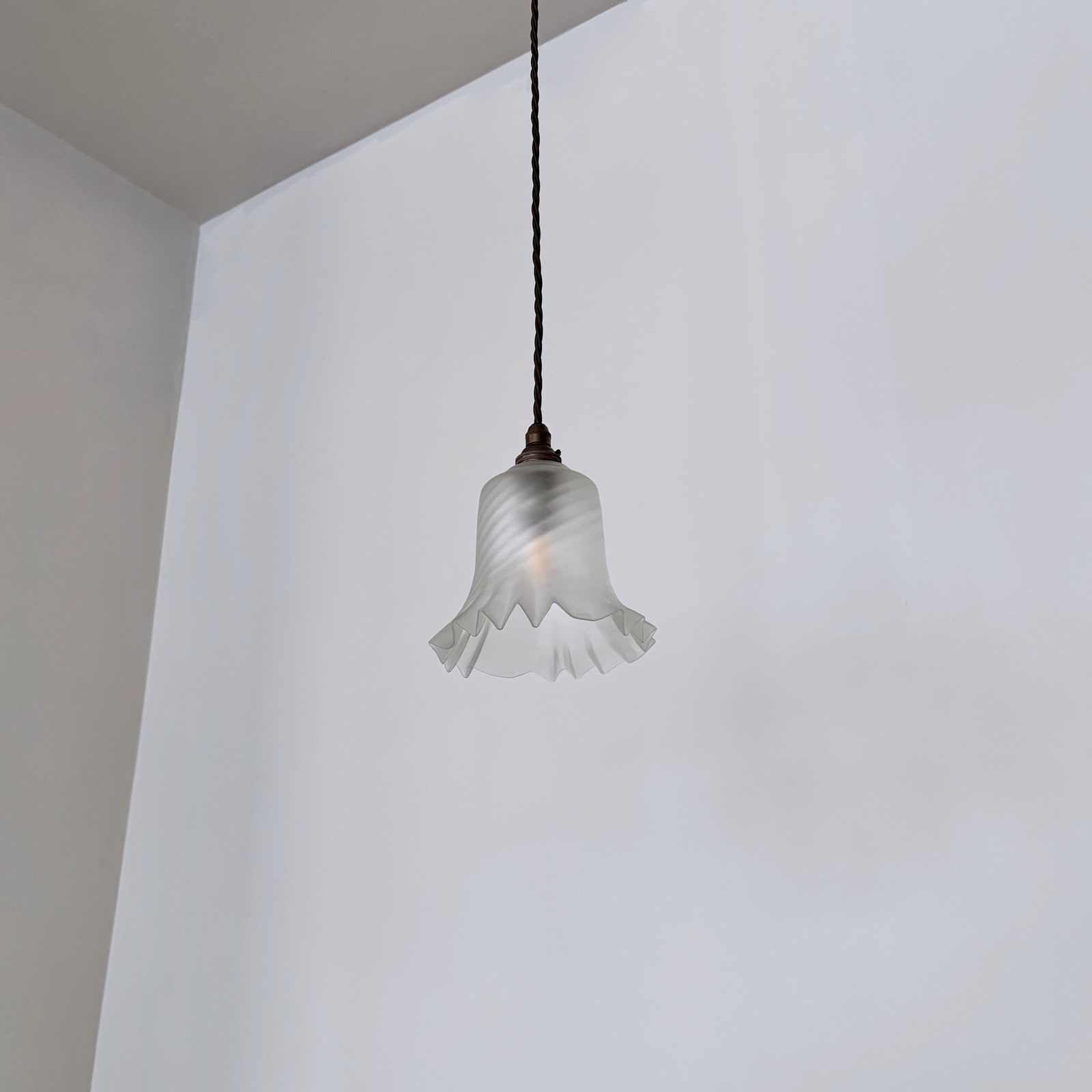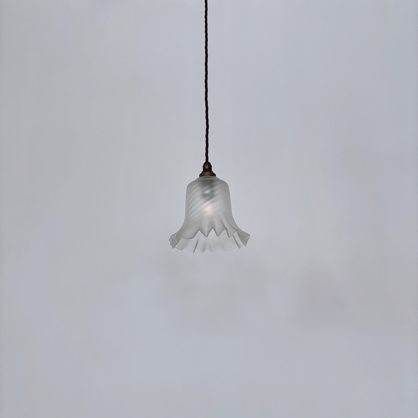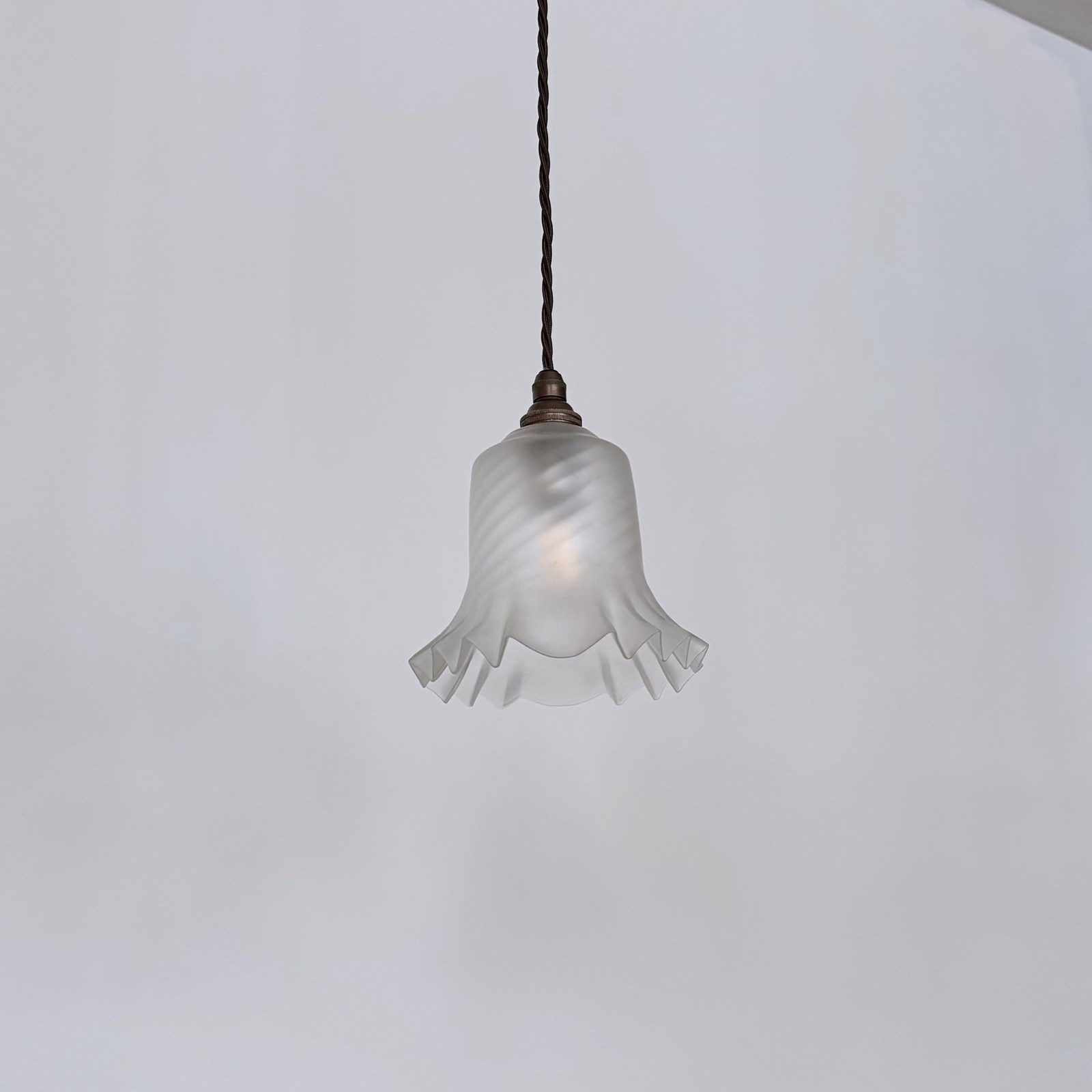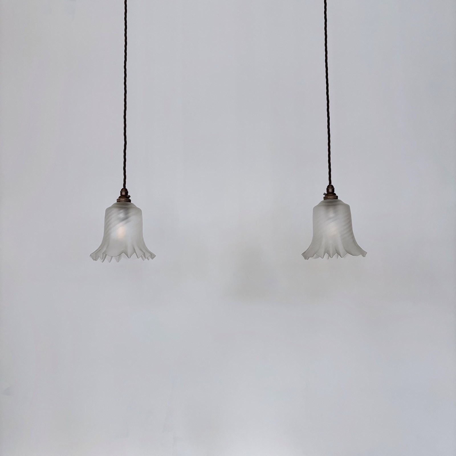 Pair of decorative moulded frosted glass shades. Each rewired with an antique brass fitting and dark brown braided flex. Each shade requires one b22 lamp. The braided flex can be changed to your preference and a matching ceiling fitting is supplied.