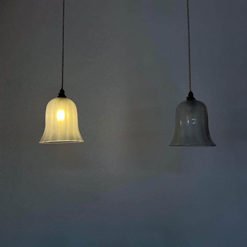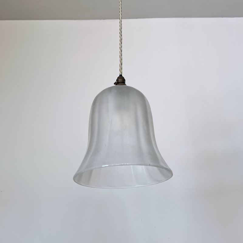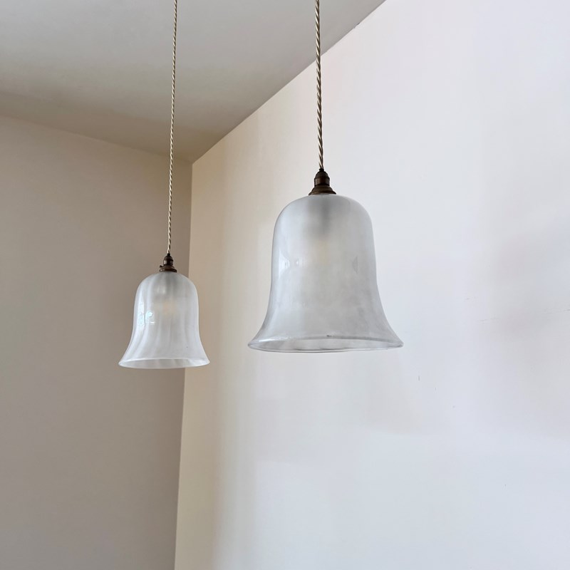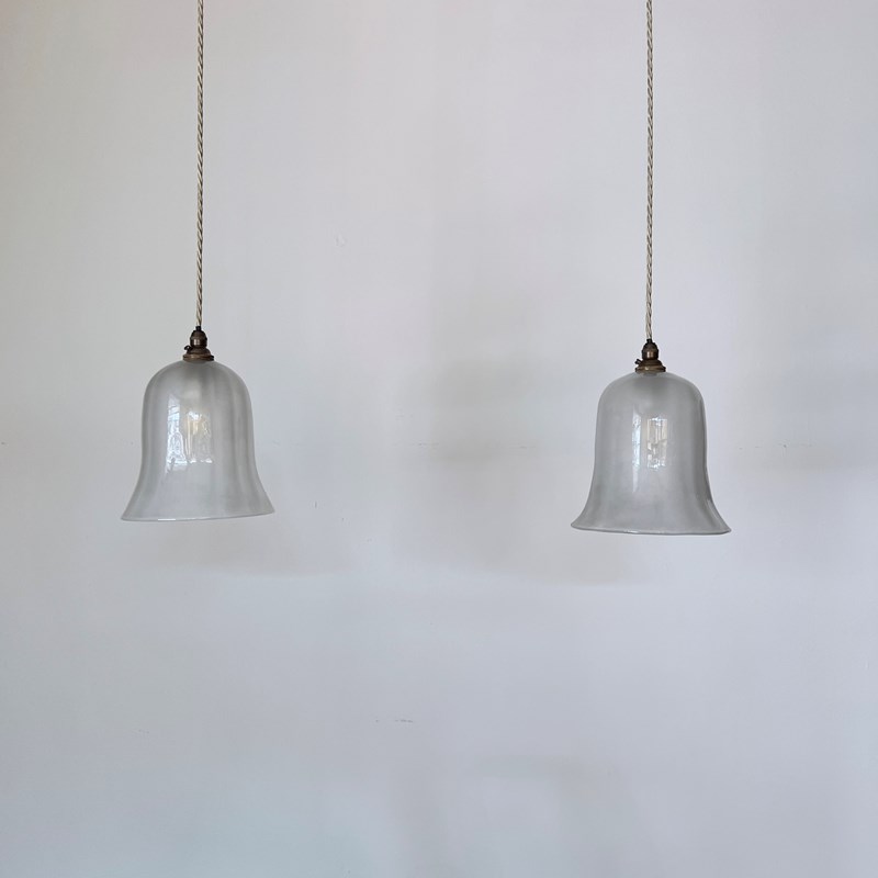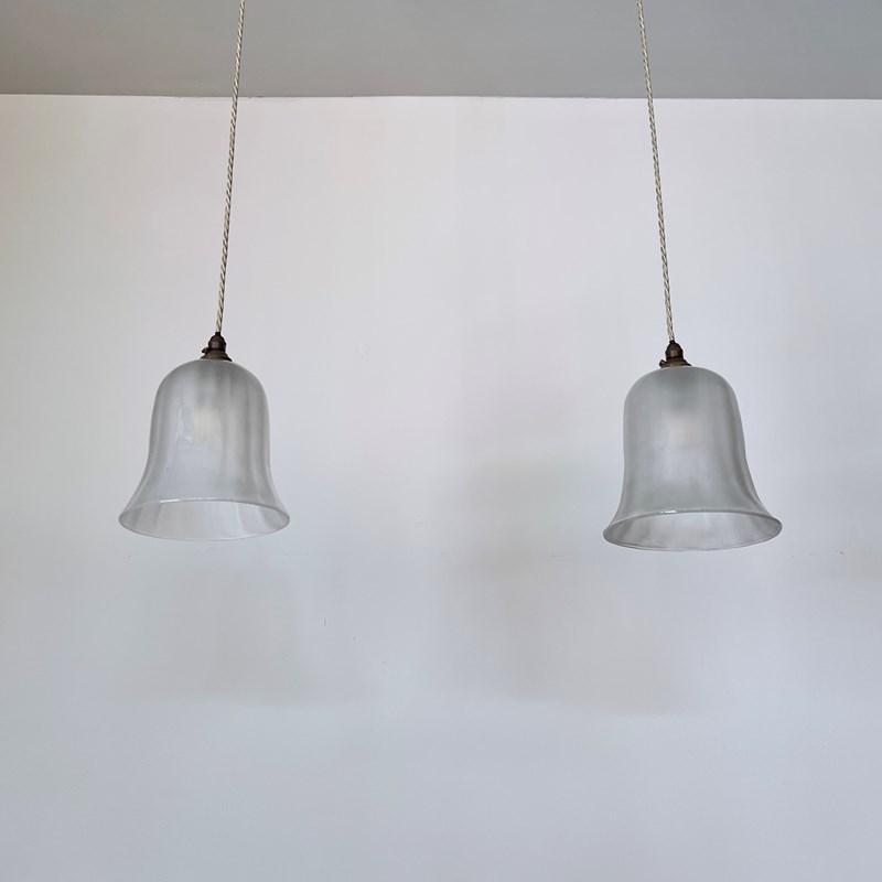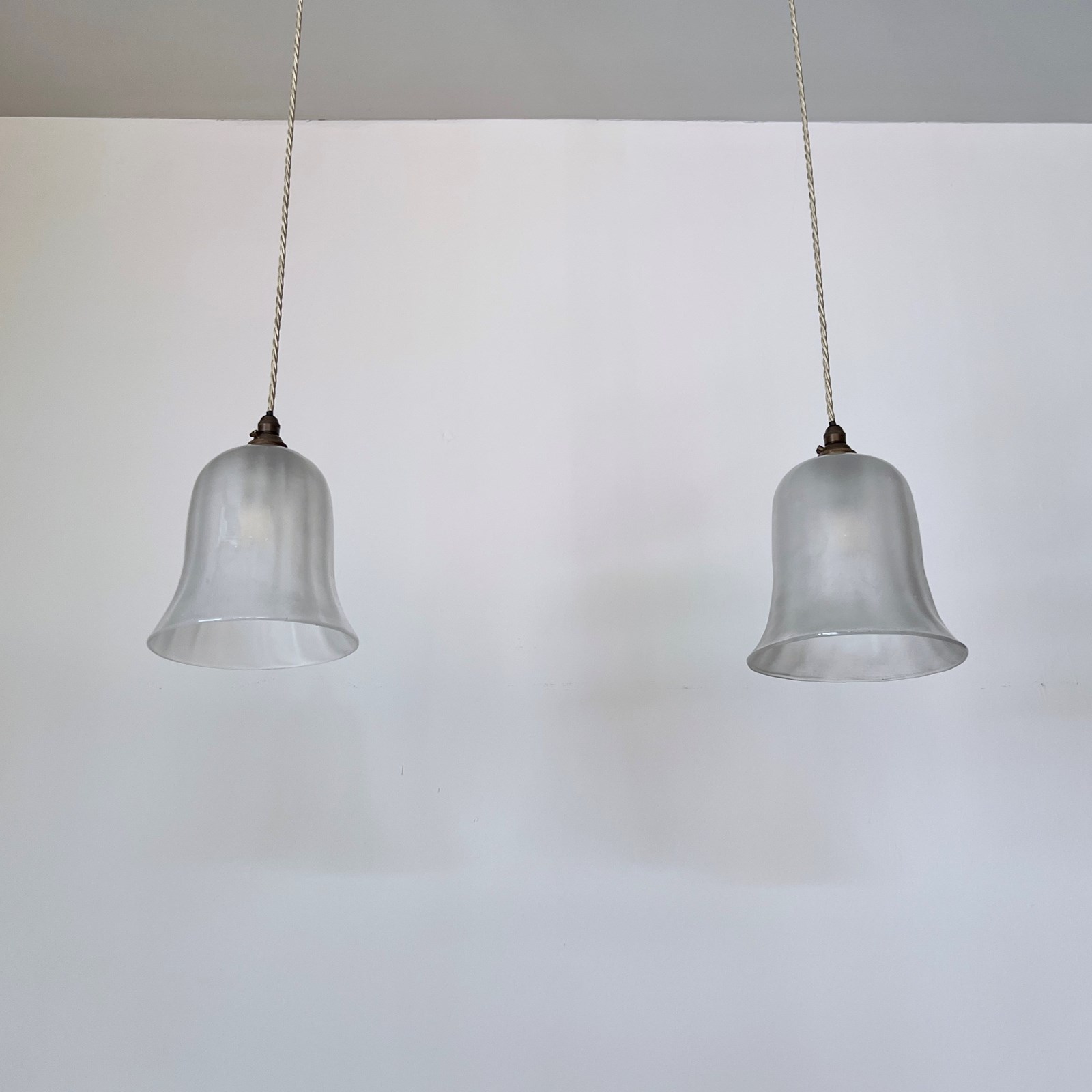 Pair of frosted glass bell shades. Each rewired with an antique brass fitting and beige braided flex. Each shade requires one b22 lamp. These are not included but can be supplied. The braided flex can be changed to your preference and a matching ceiling fitting is supplied.