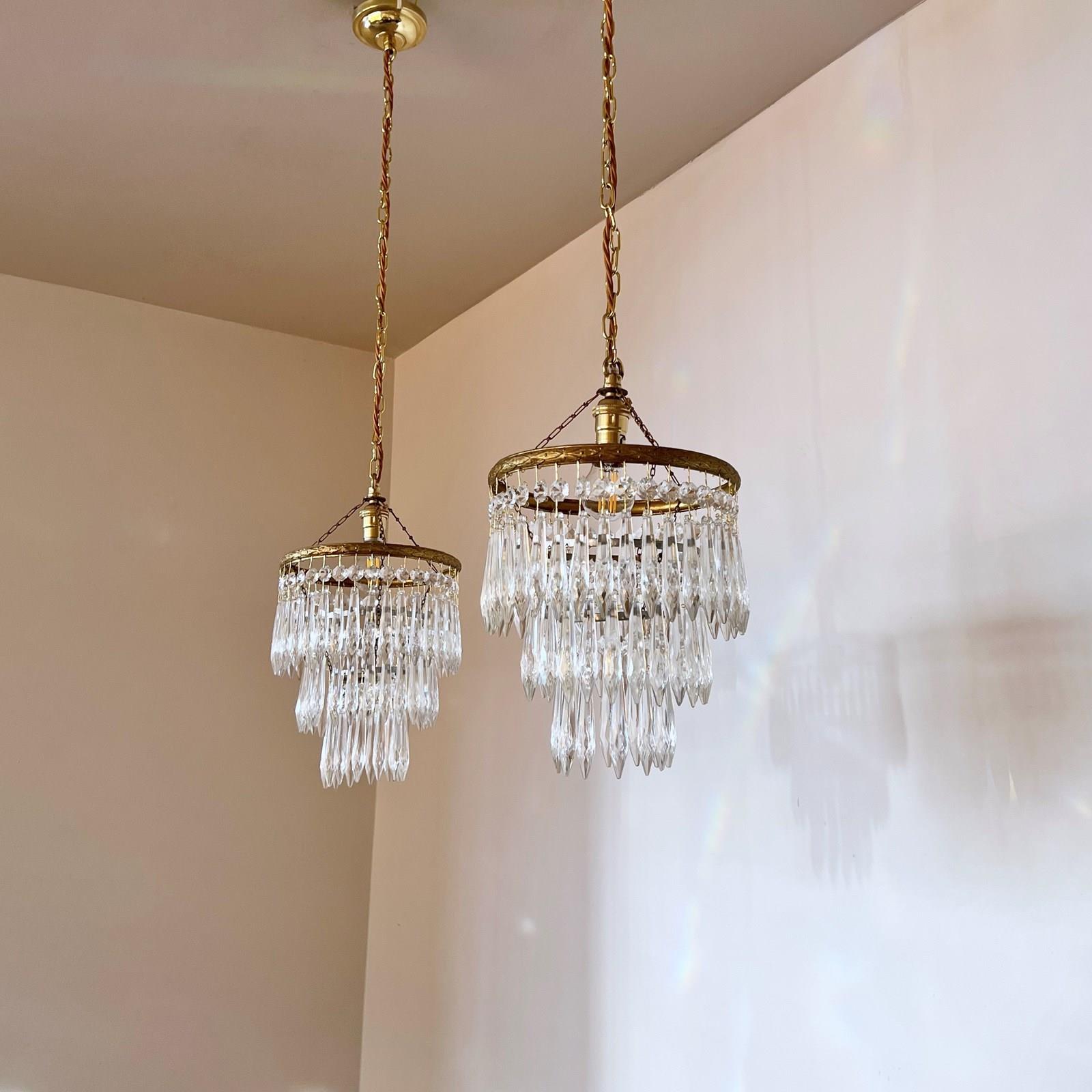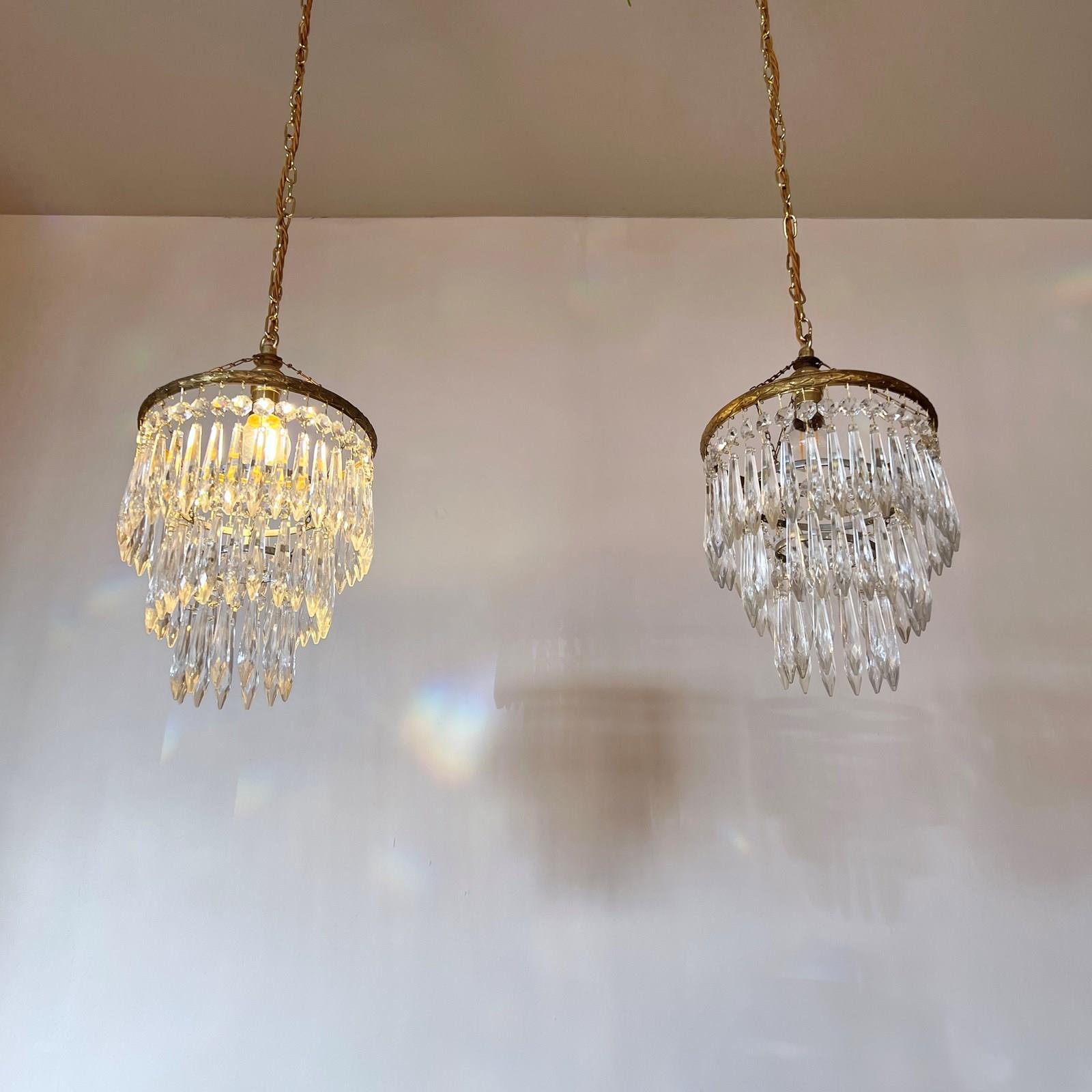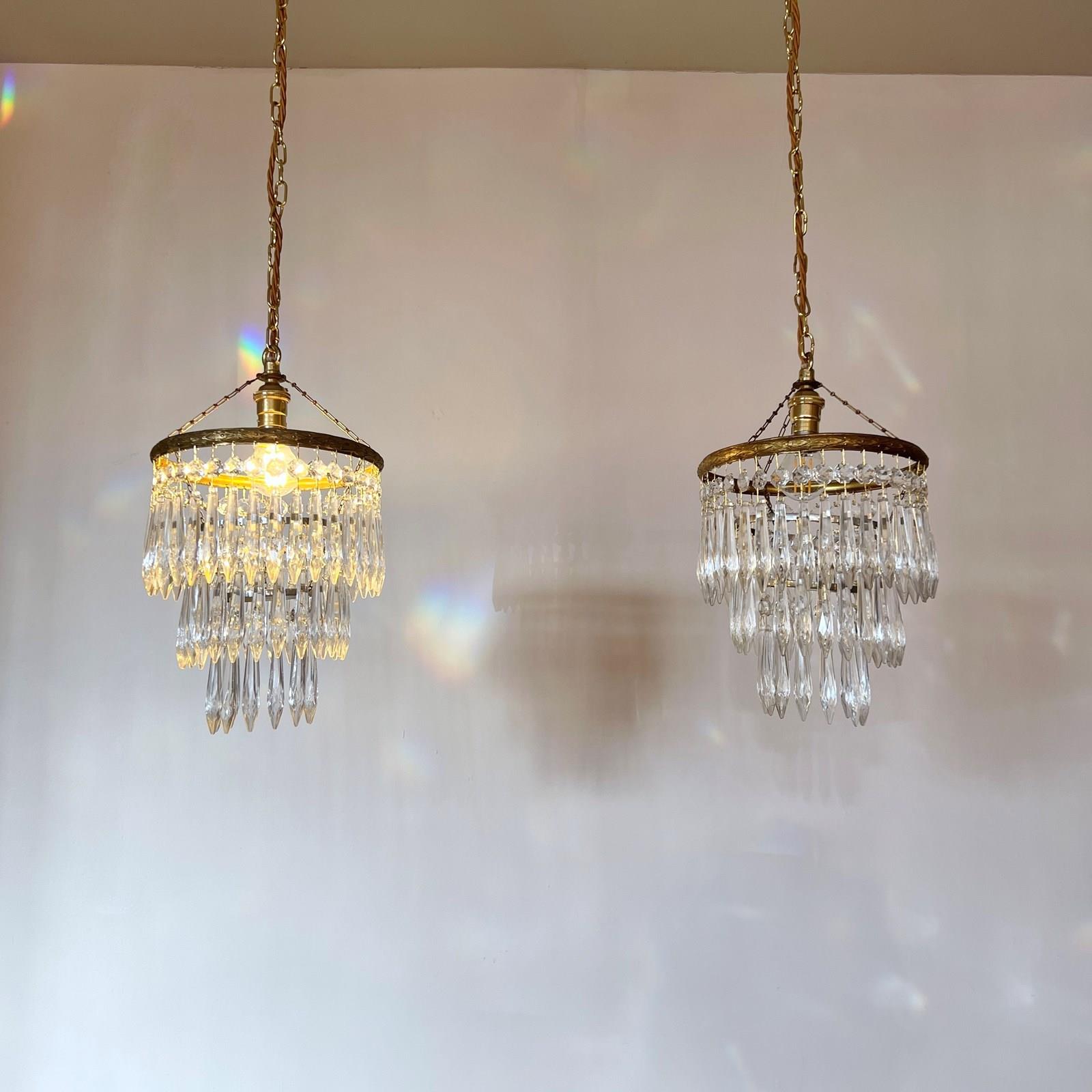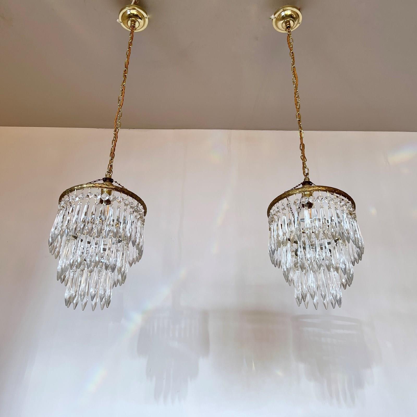Pair of brass and glass waterfall chandeliers. The three tiered chandeliers have an oxidised brass outer frame. The tiers are held together with delicate chain. The quality icicle droppers are each hanging from a glass button. Each chandelier is wired with a single B22 lamp holder. Supplied with brown braided flex, matching polished brass ceiling rose.
