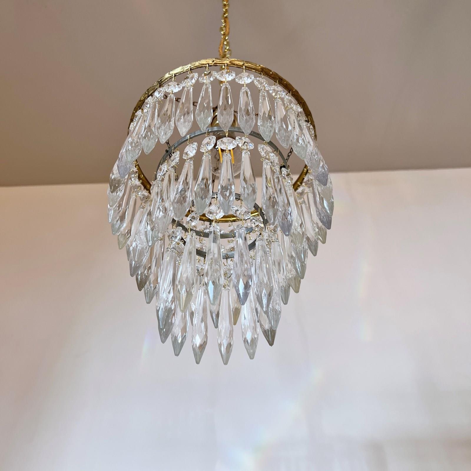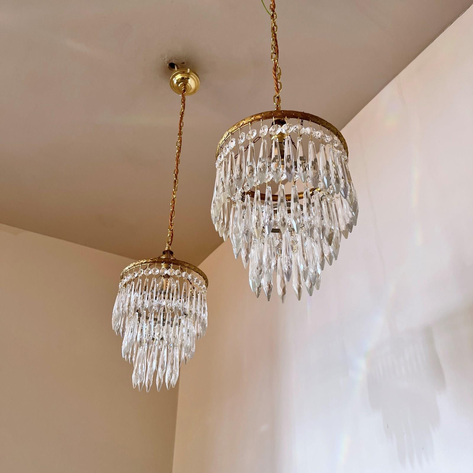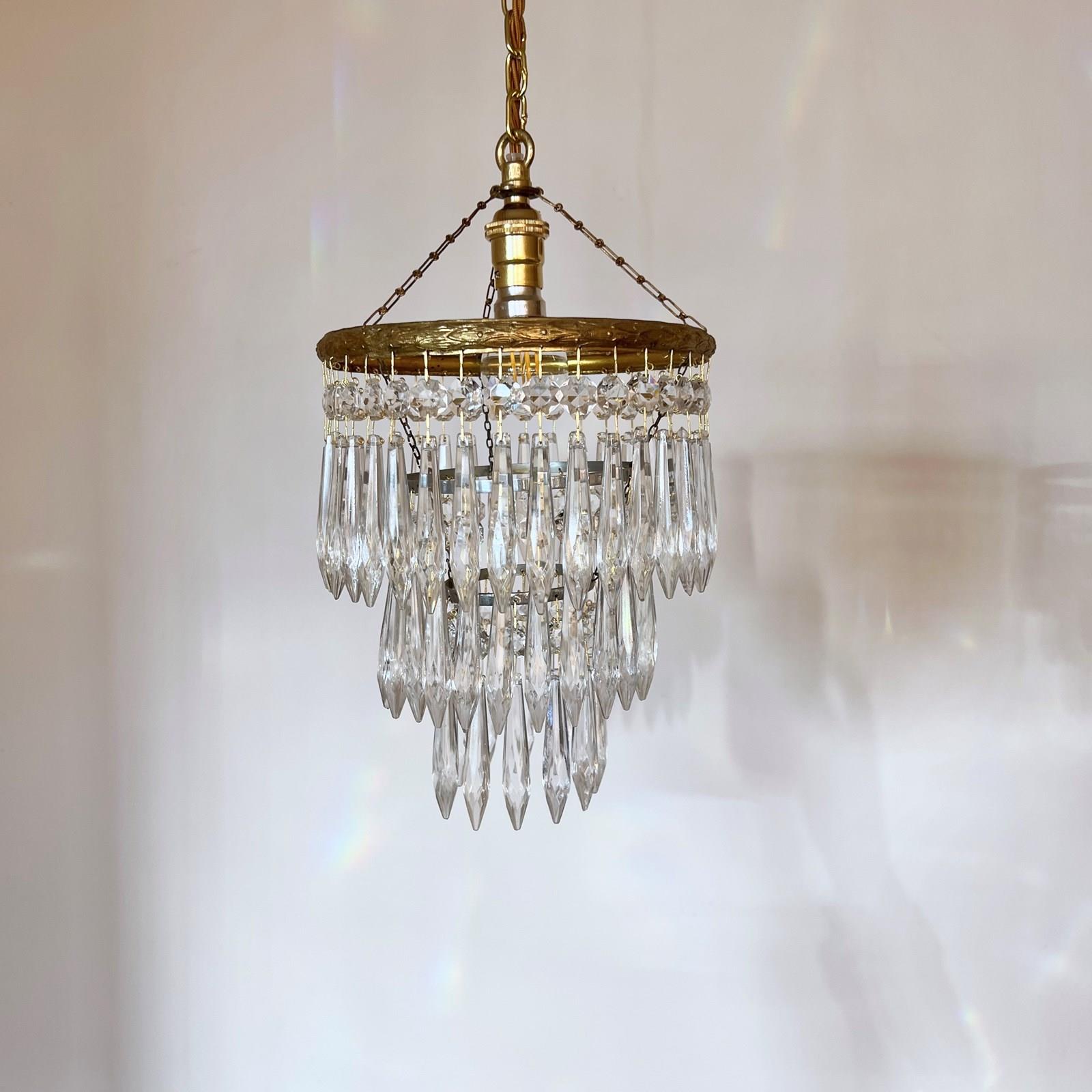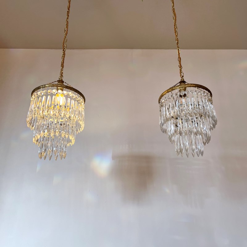 Pair of brass and glass waterfall chandeliers. The three tiered chandeliers have an oxidised brass outer frame. The tiers are held together with delicate chain. The quality icicle droppers are each hanging from a glass button. Each chandelier is wired with a single B22 lamp holder. Supplied with brown braided flex, matching polished brass ceiling rose.