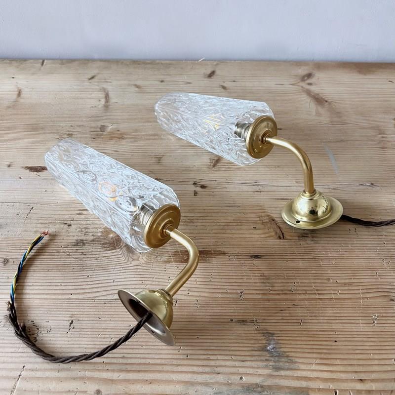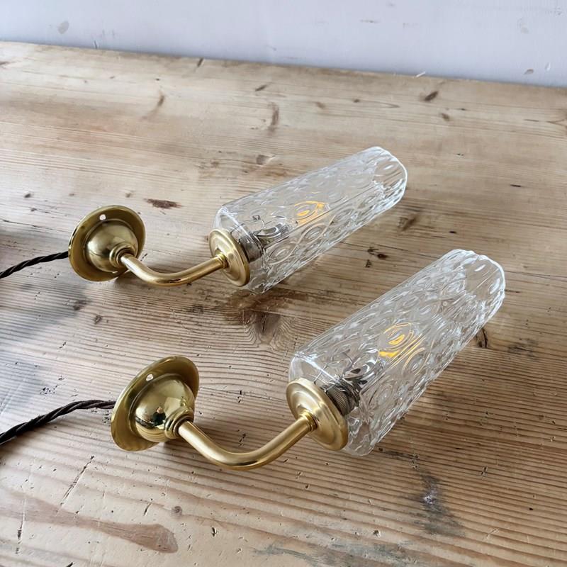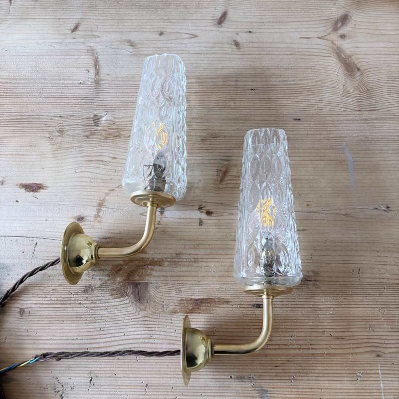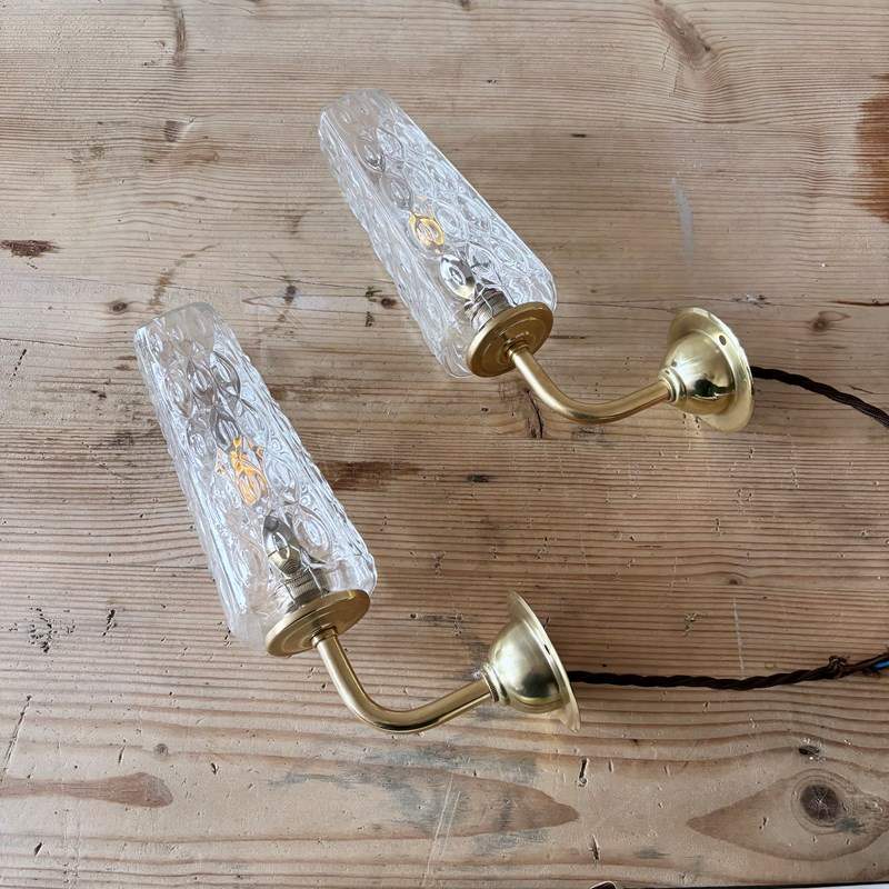 These bespoke wall lights have been made using new brass parts each with a single lamp. We have a pair available. These pieces are shown in polished brass finish. Each light features a clear mid-century moulded shade with an oval pattern.