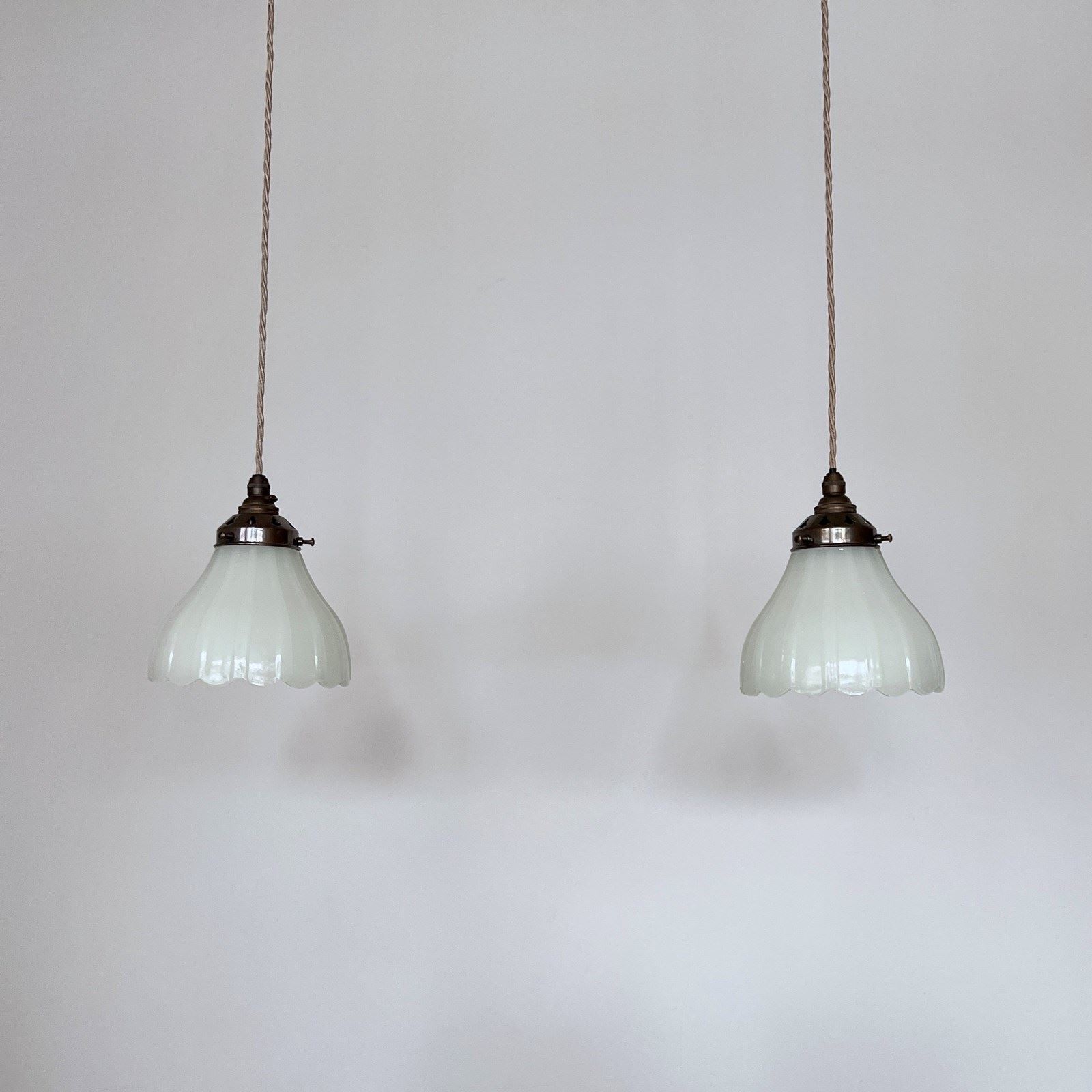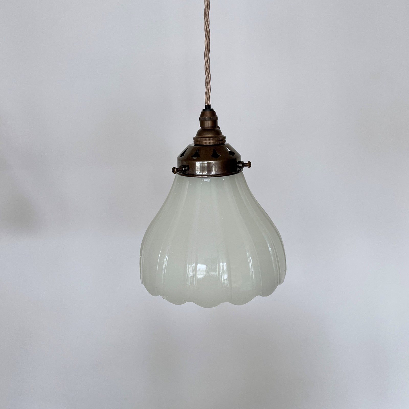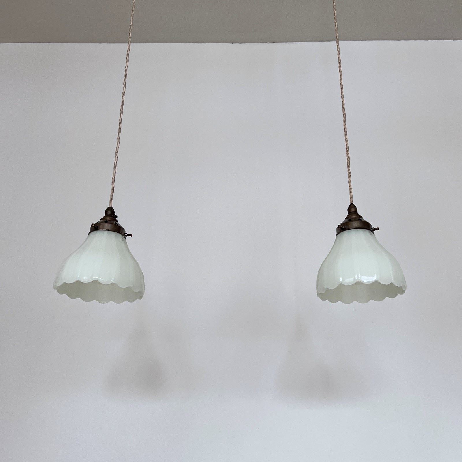 Pair of Moonstone Jefferson glass shades. Each rewired with an antique brass finish fitting and pigeon braided flex. Each shade requires one B22 lamp, these are not included but can be supplied. The coloured flex can be changed to your preference and a matching ceiling fitting is supplied.