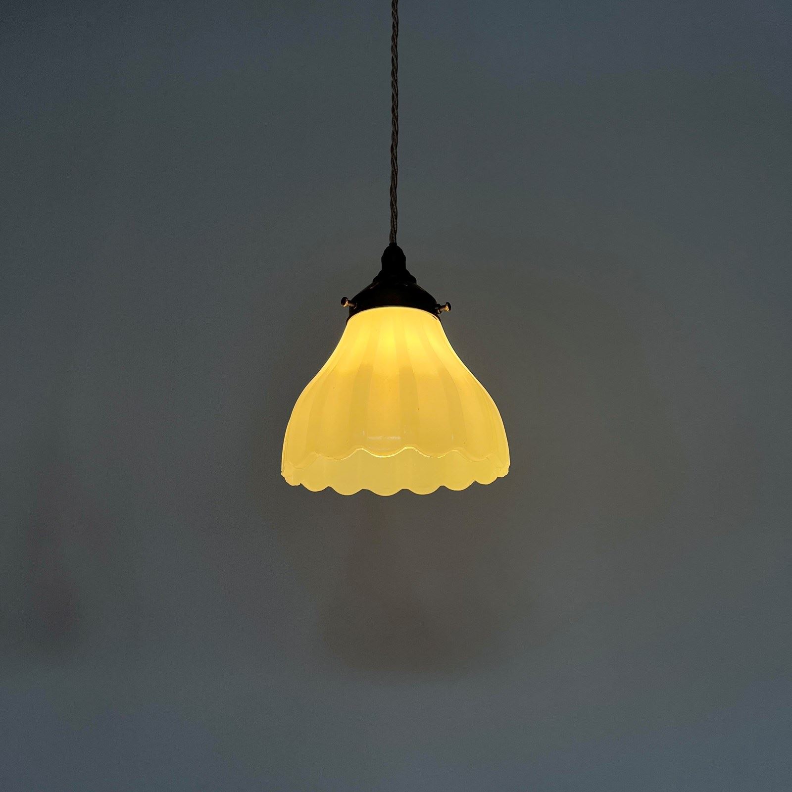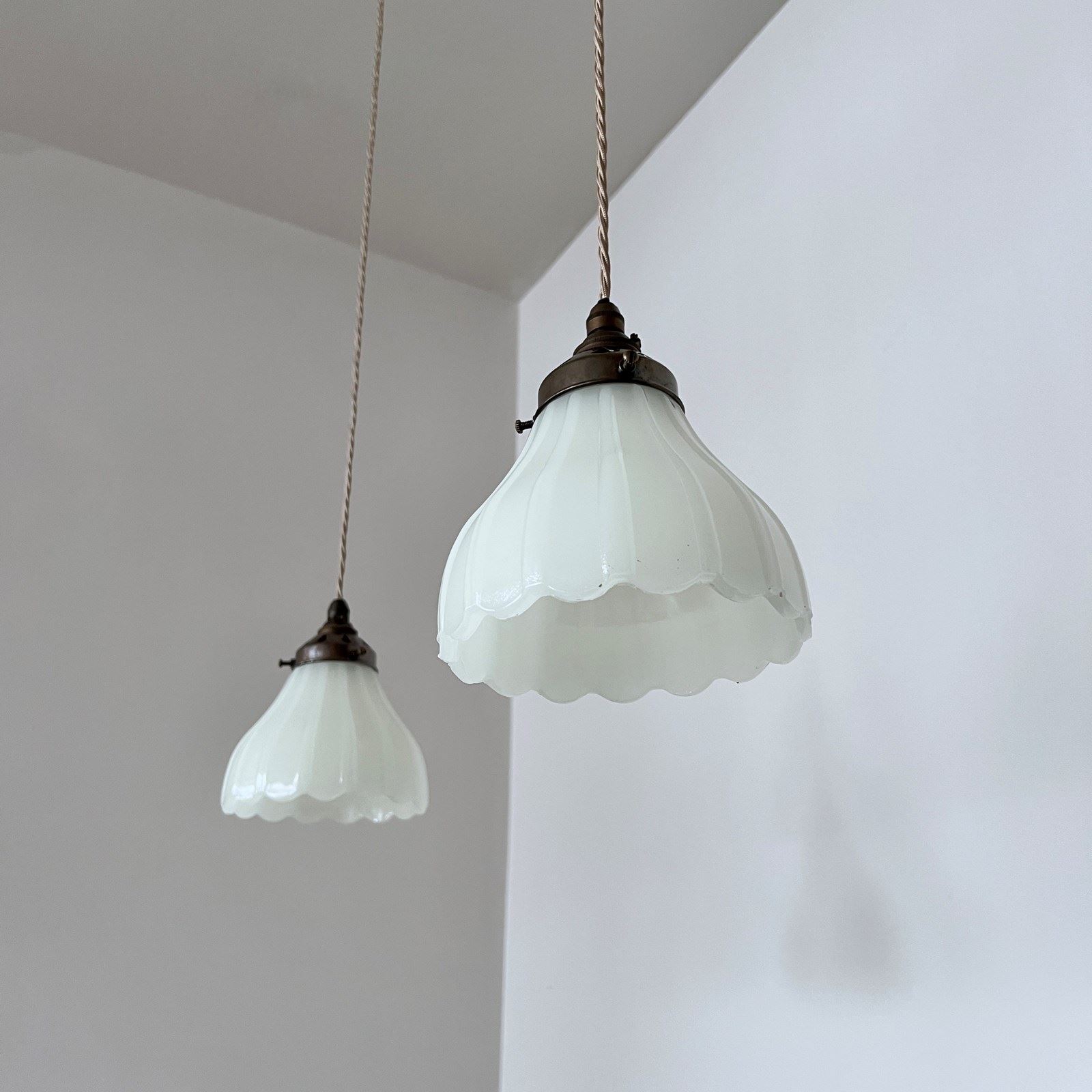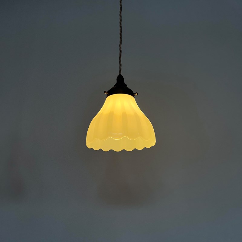 Pair of Moonstone Jefferson glass shades. Each rewired with an antique brass finish fitting and pigeon braided flex. Each shade requires one B22 lamp, these are not included but can be supplied. The coloured flex can be changed to your preference and a matching ceiling fitting is supplied.