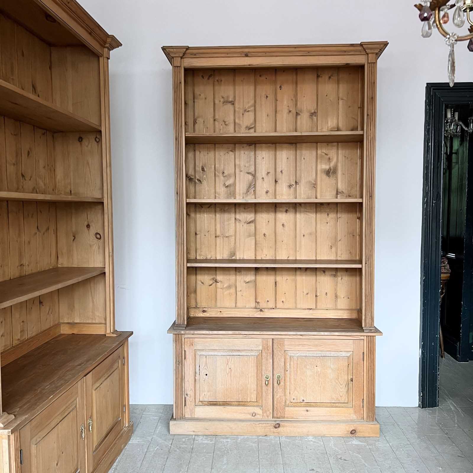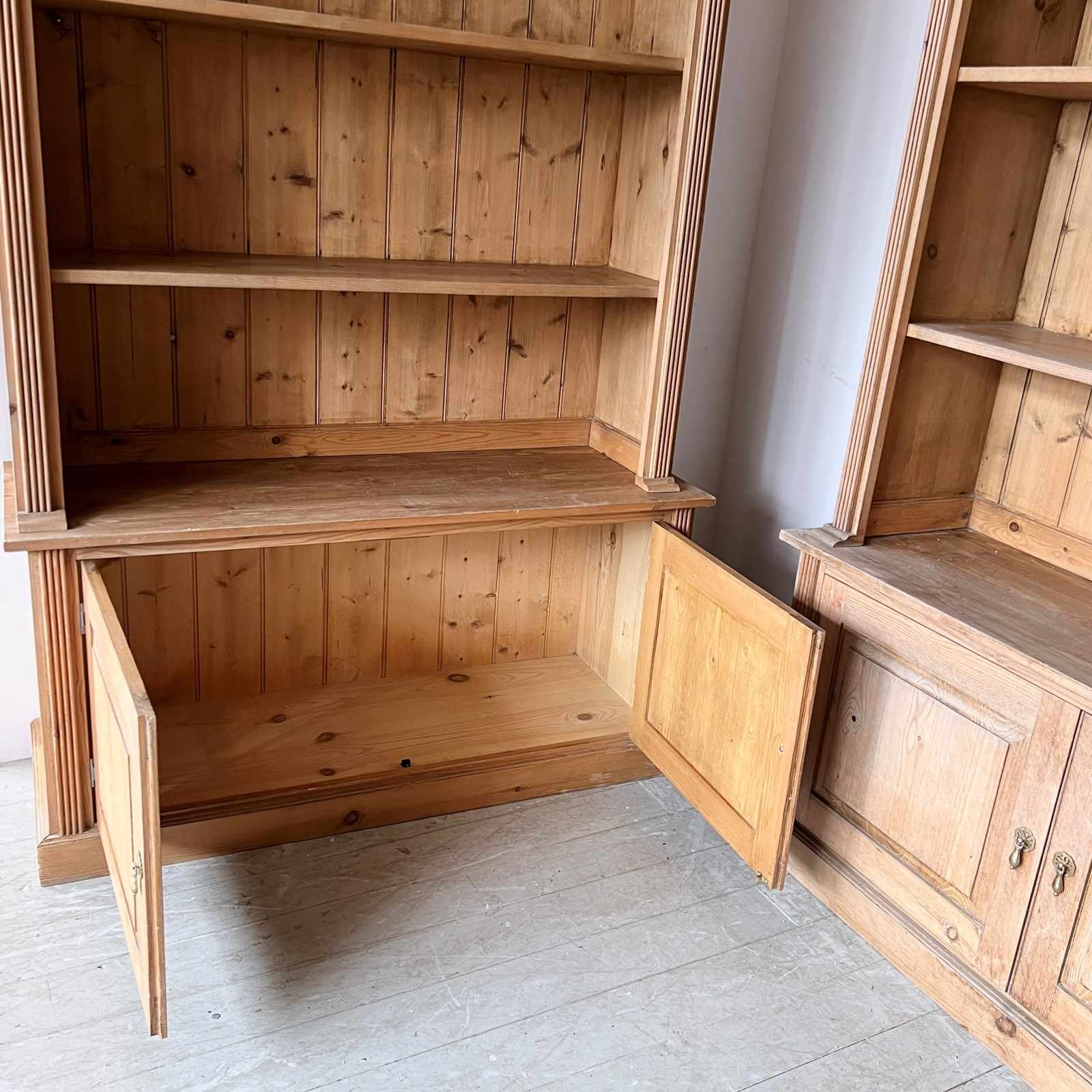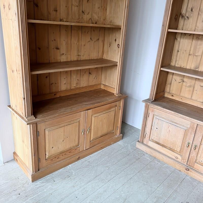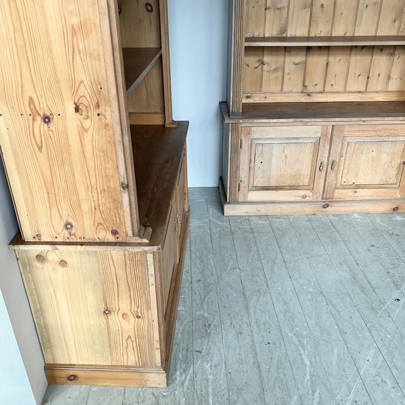 Large pine dressers. Could be painted or rewaxed. Painting will be an additonal cost. The dressers can be purchased together or separately. Three shelves in each with pot cupboard base.