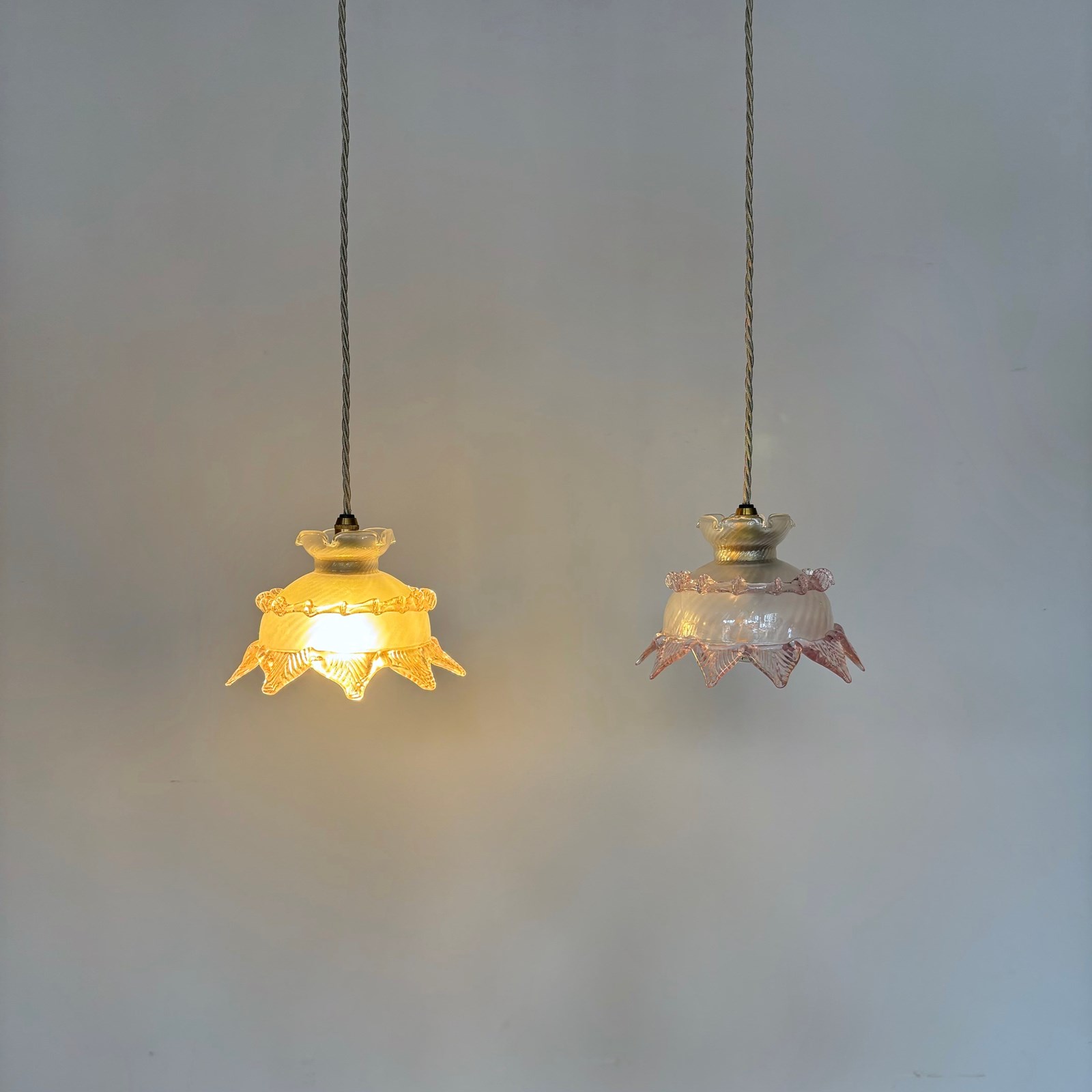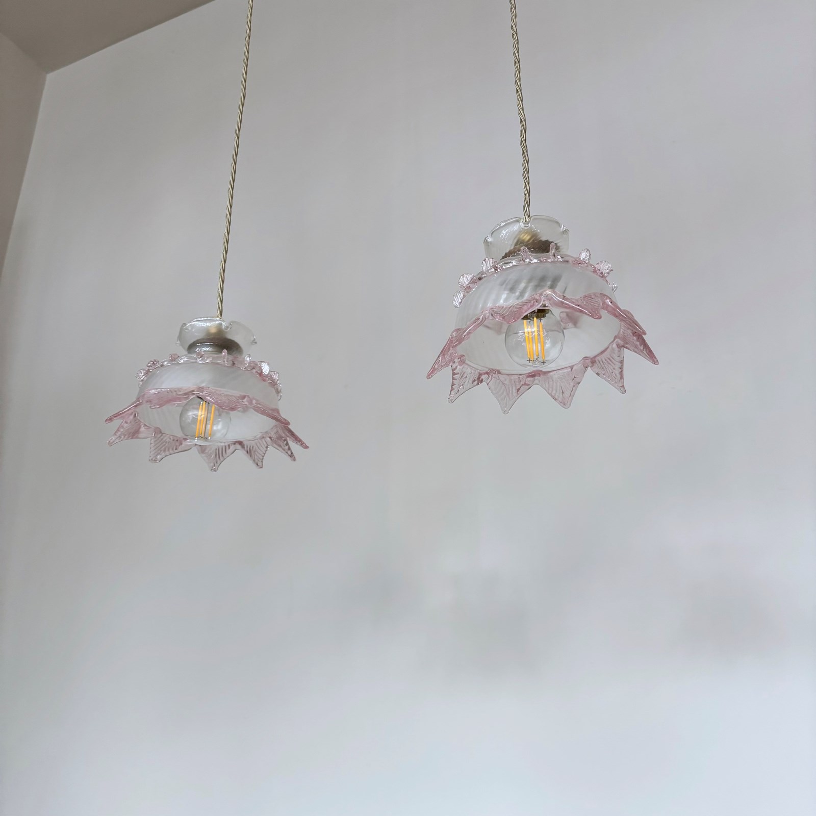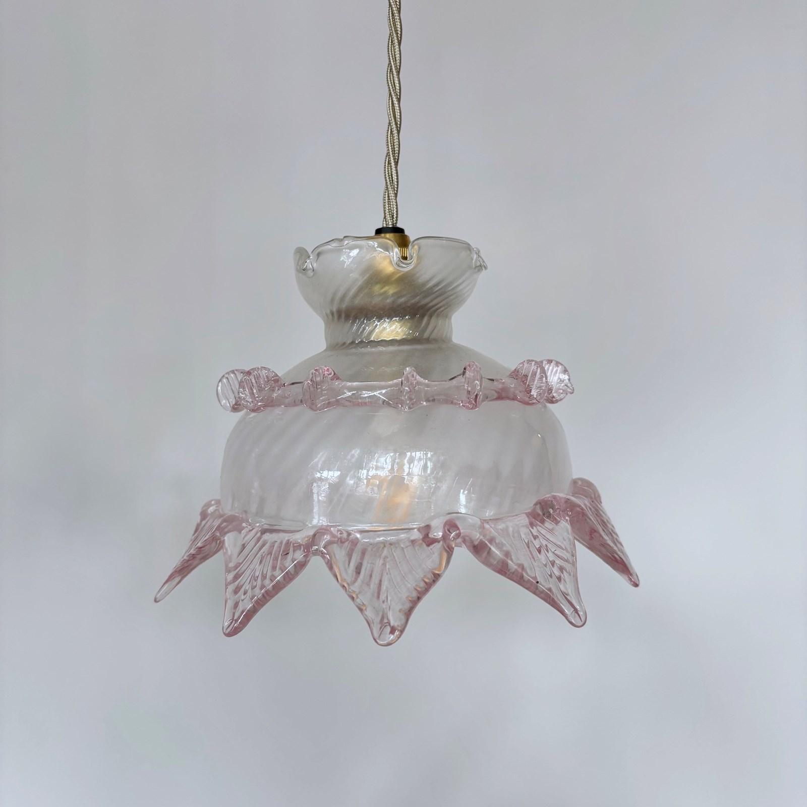 Mid Century Murano glass shades. Pretty shades made with frosted and pink frilled glass. Rewired with polished brass finish fitting and beige braided flex. Each shade requires one b22 lamp. These are not included. The coloured flex can be changed to your preference and a matching ceiling fitting is supplied.