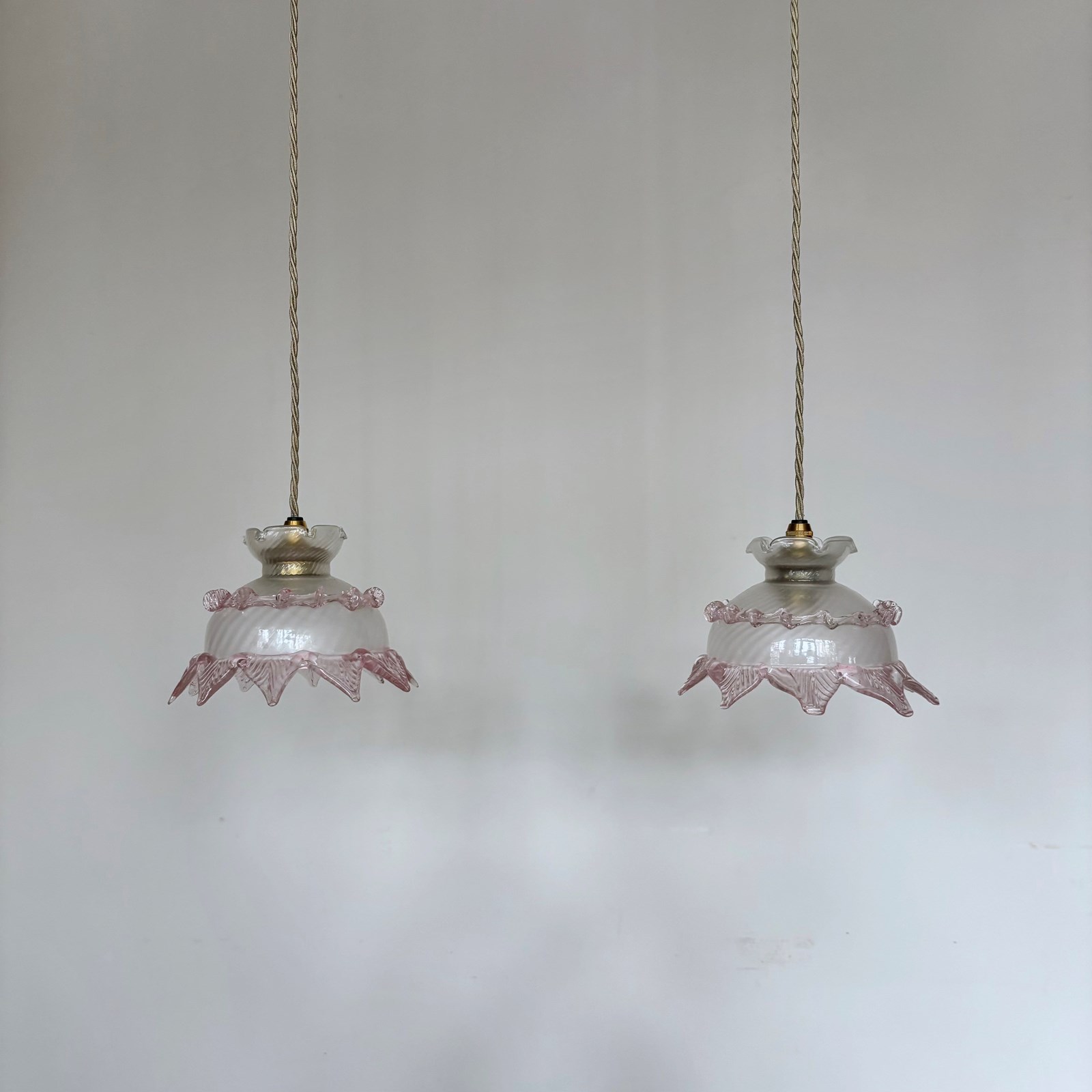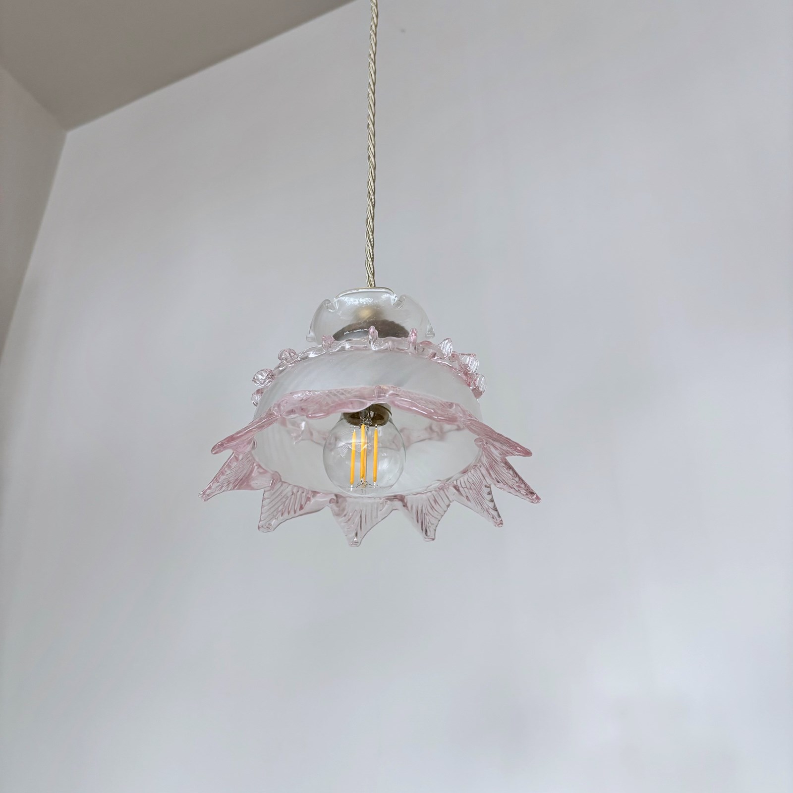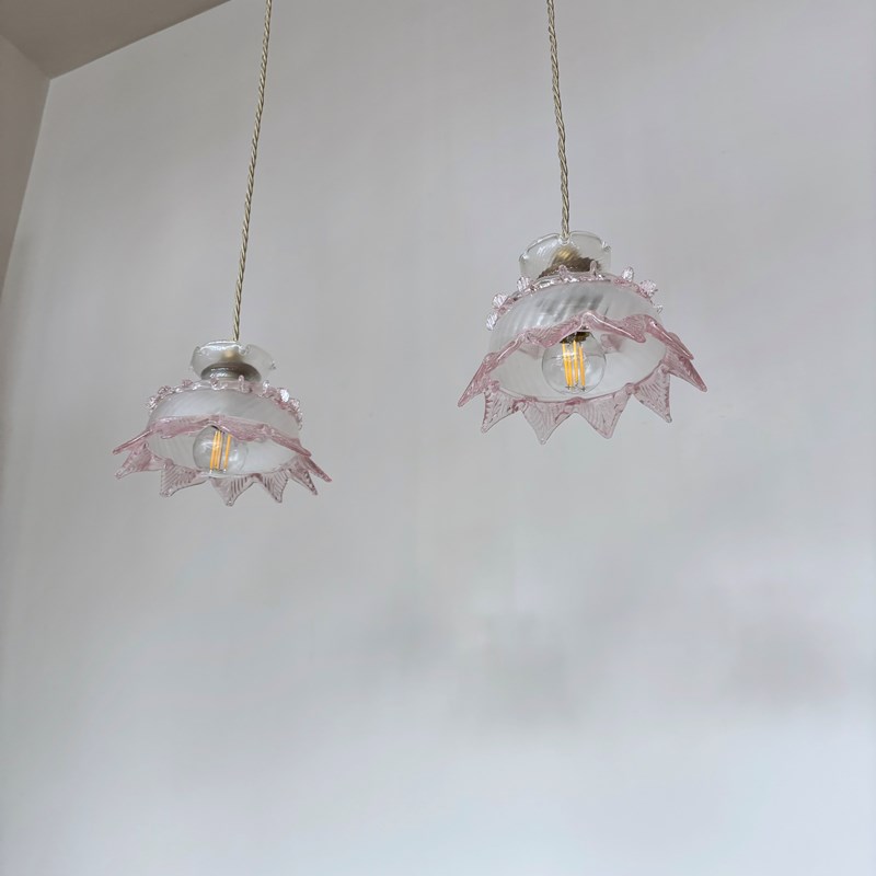 Mid Century Murano glass shades. Pretty shades made with frosted and pink frilled glass. Rewired with polished brass finish fitting and beige braided flex. Each shade requires one b22 lamp. These are not included. The coloured flex can be changed to your preference and a matching ceiling fitting is supplied.
