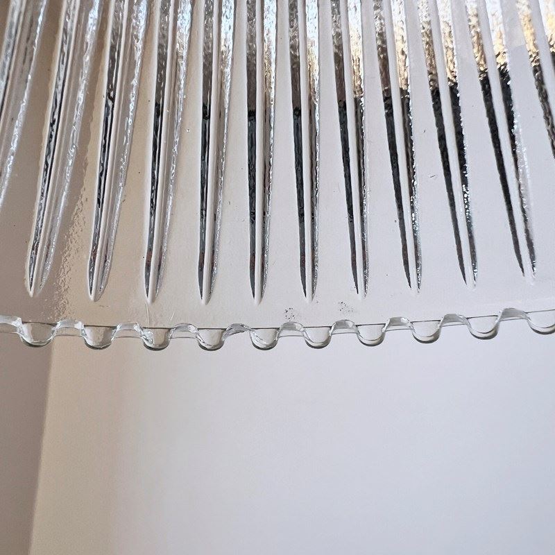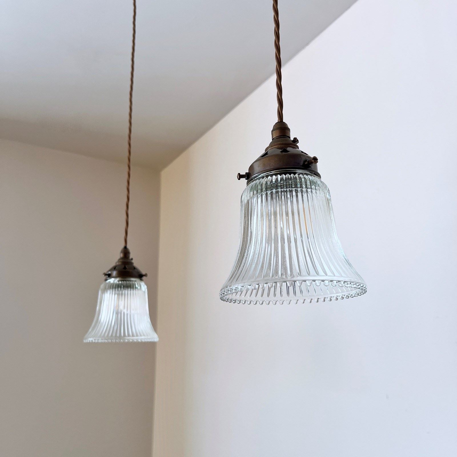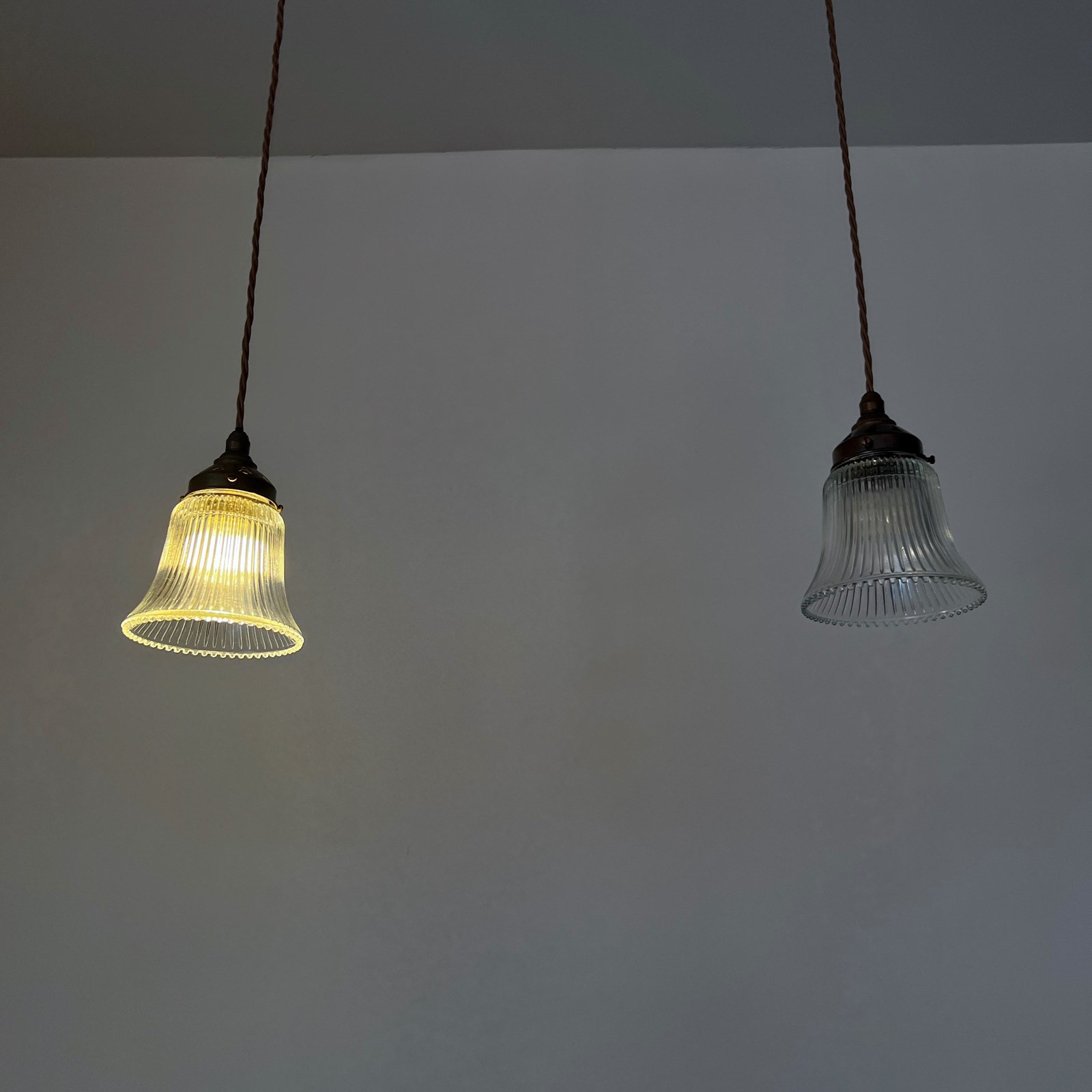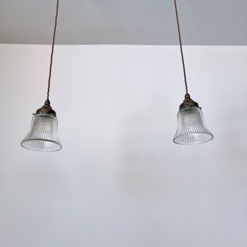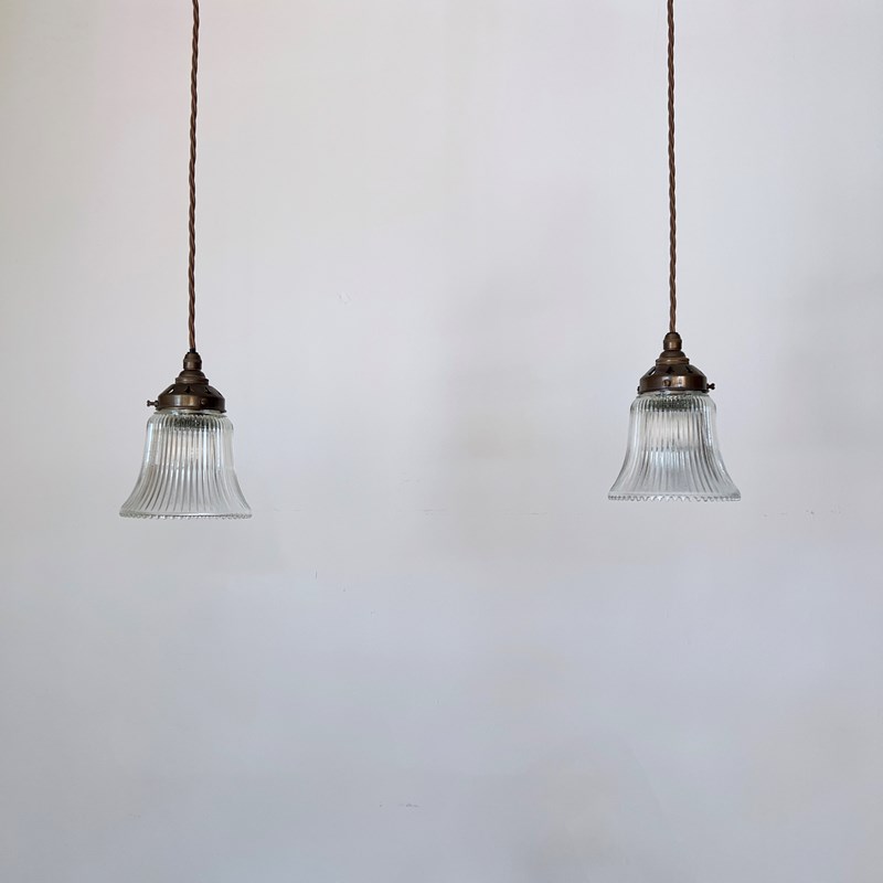 Pair of clear ribbed Holophane glass shades. One of the shades has some very small chips in the rim please see photos. Each rewired with an antique brass fitting and light brown braided flex. Each shade requires one b22 lamp. These are not included but can be supplied. The braided flex can be changed to your preference and a matching ceiling fitting is supplied.