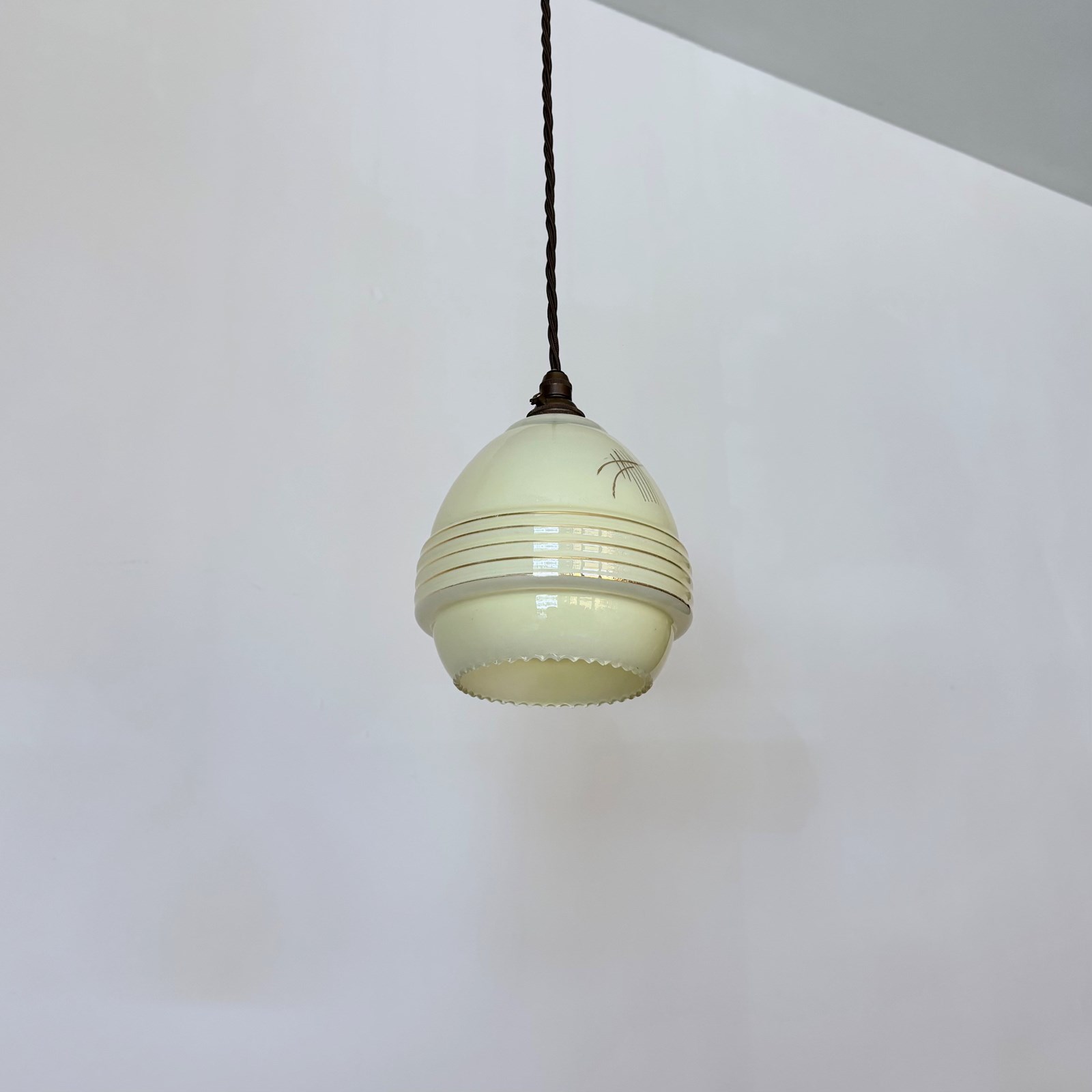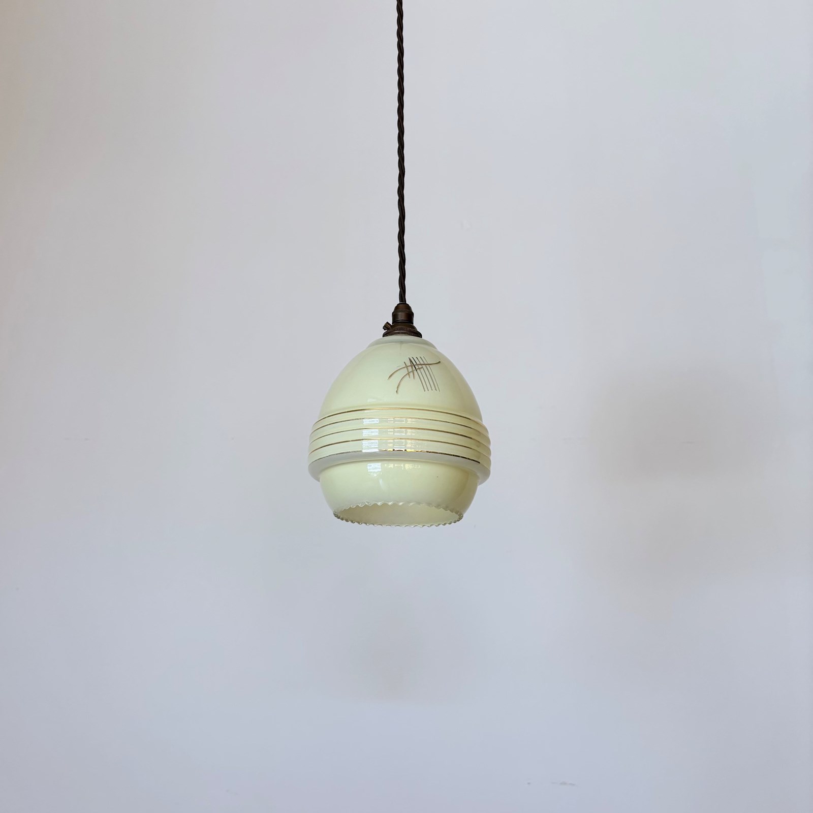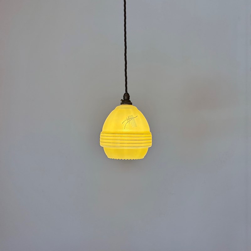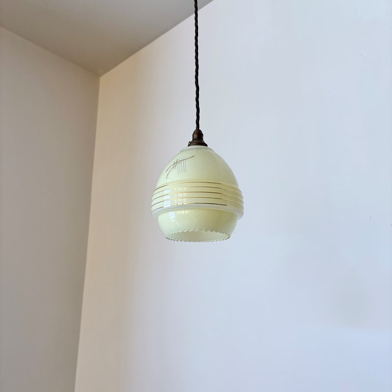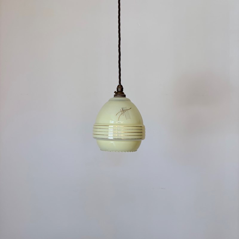 Pale yellow shade with gold bands. Rewired with an antique brass finish fitting and dark brown braided flex. This shade requires one B22 lamp this is not included but can be supplied. The coloured flex can be changed to your preference and a matching ceiling fitting is supplied.