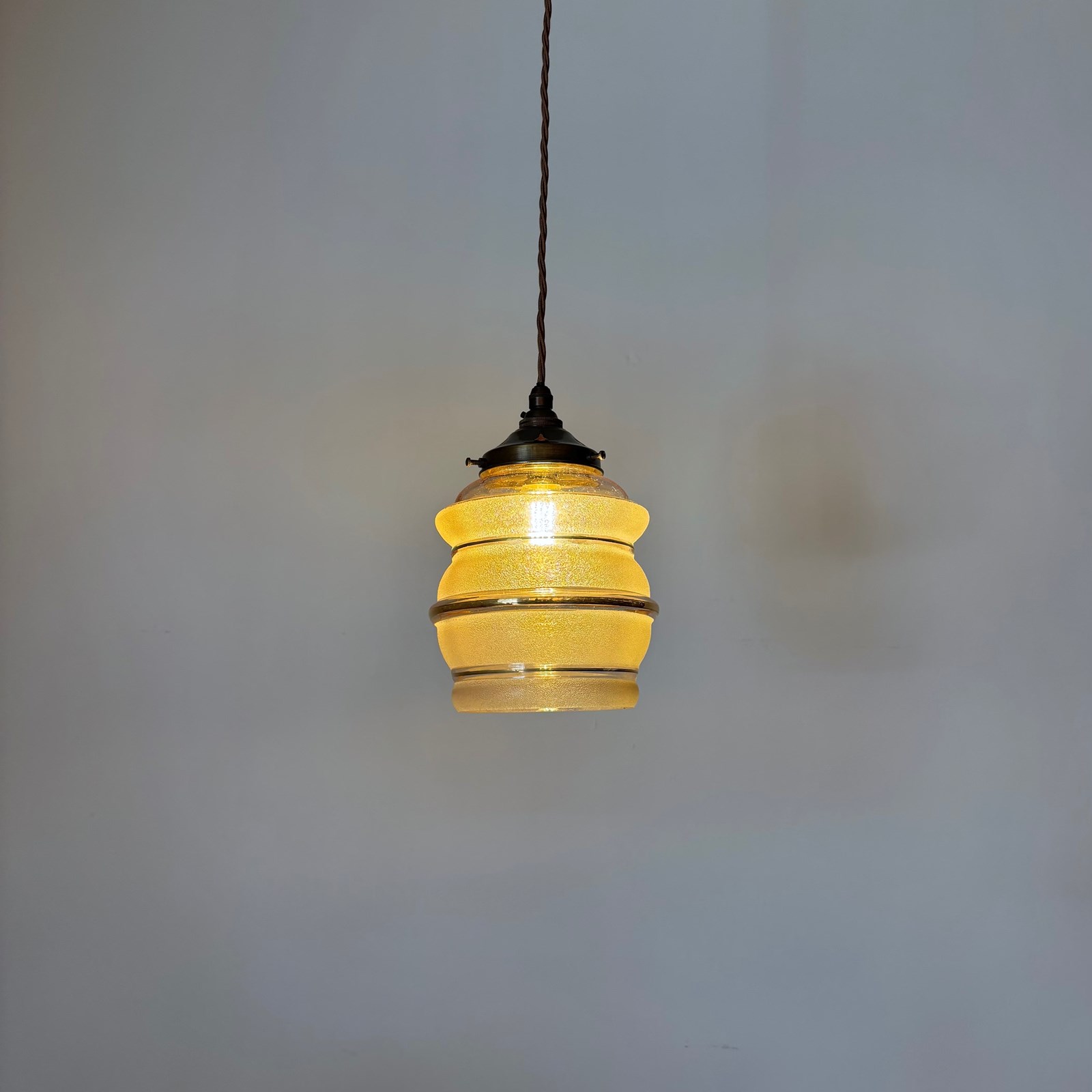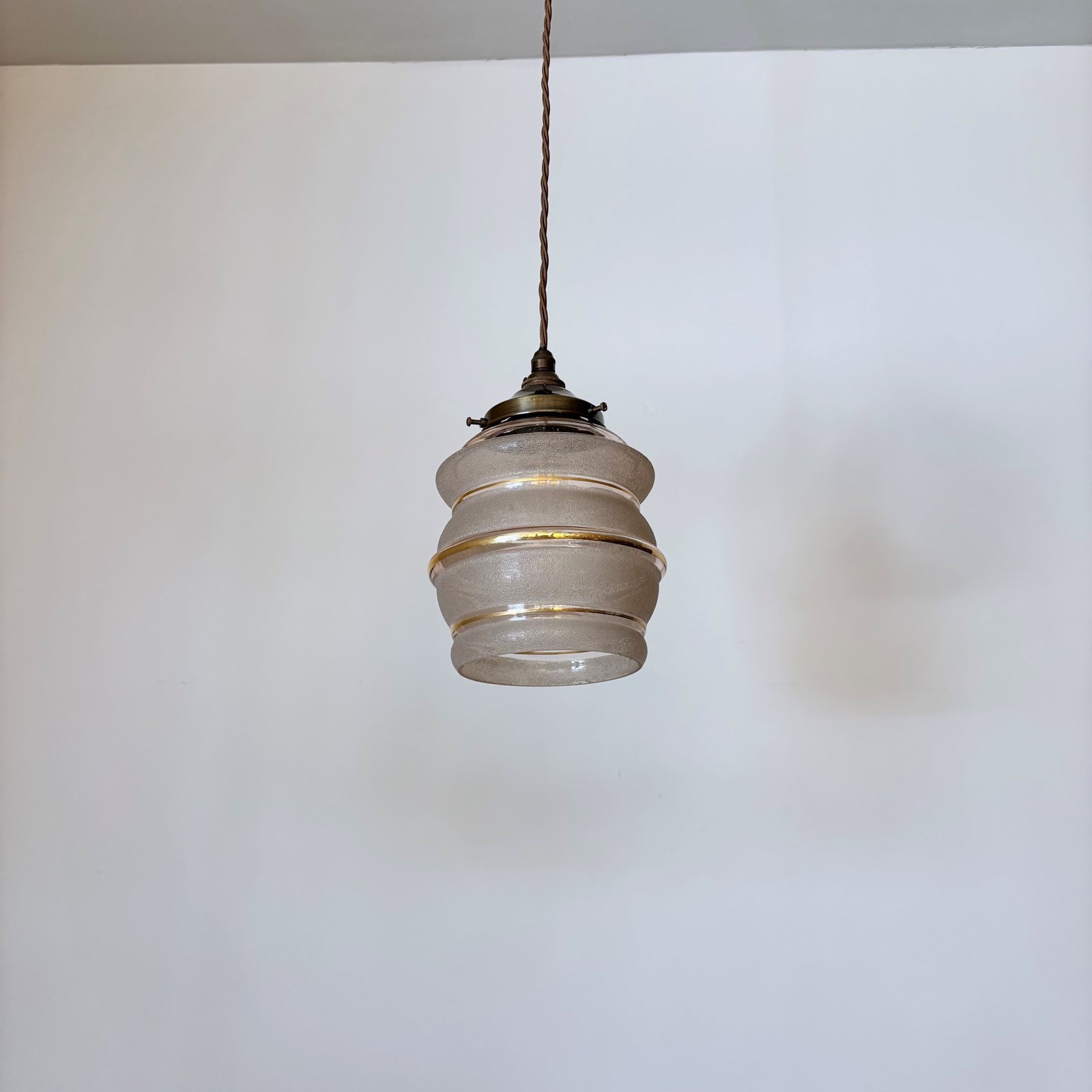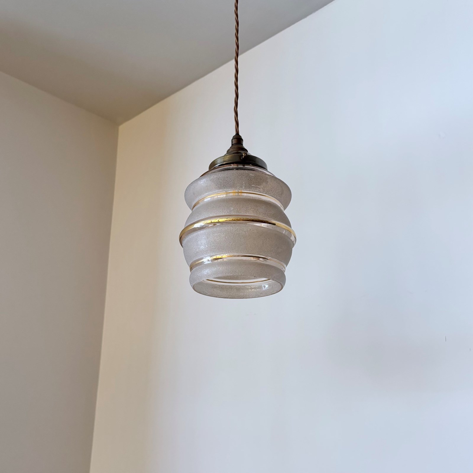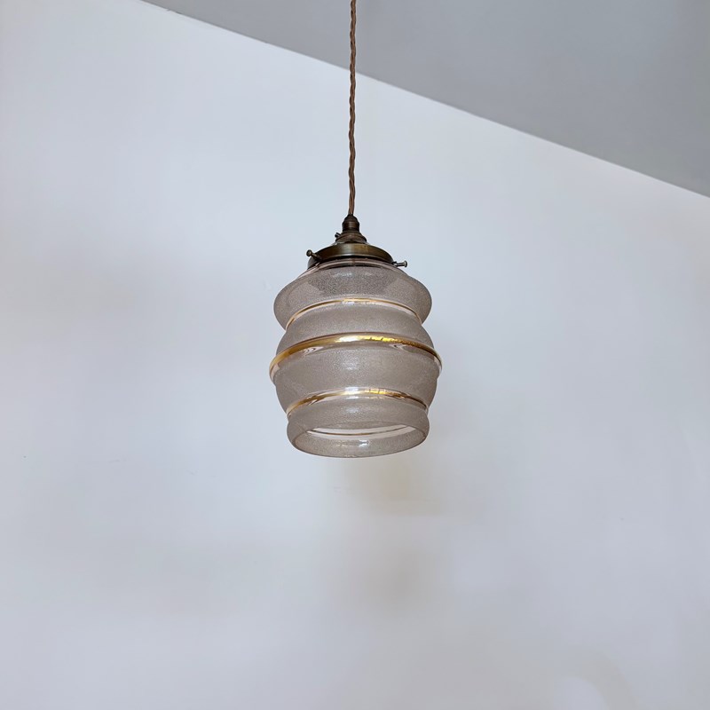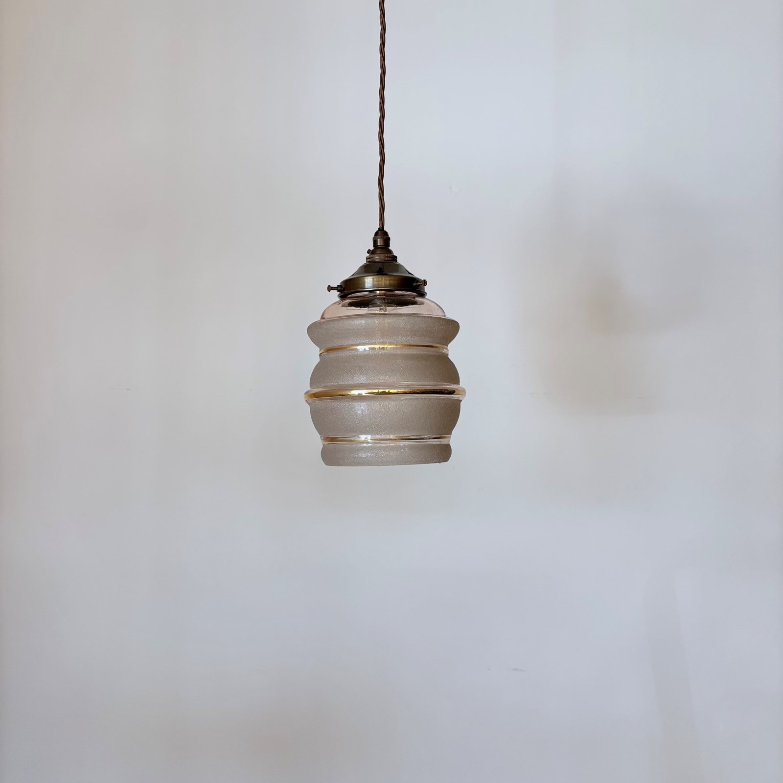 Pink textured glass shade with gold band details. Rewired with an antique brass fitting and light brown braided flex. This shade requires one B22 lamp this is not included but can be supplied. The coloured flex can be changed to your preference and a matching ceiling fitting is included.
