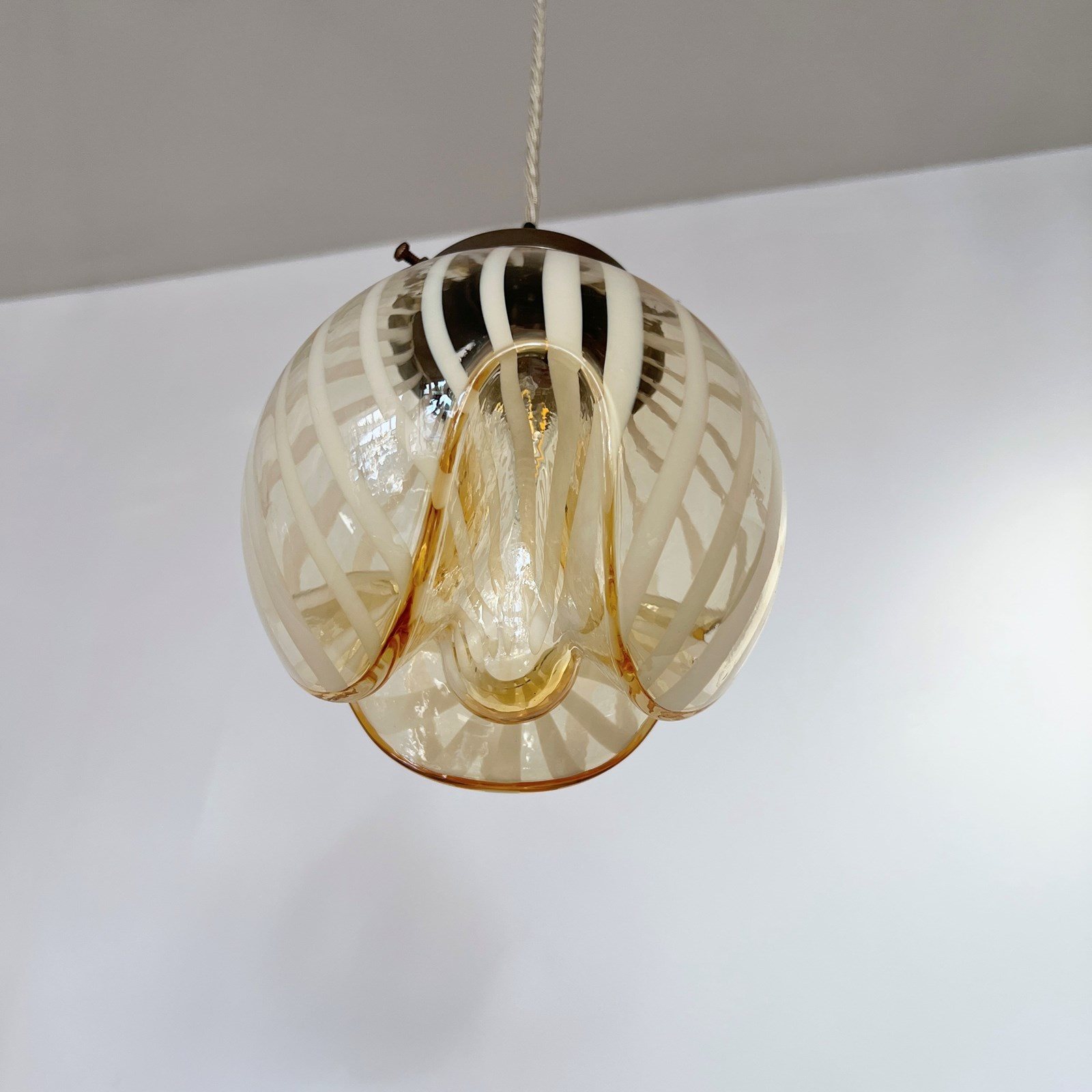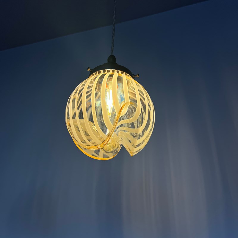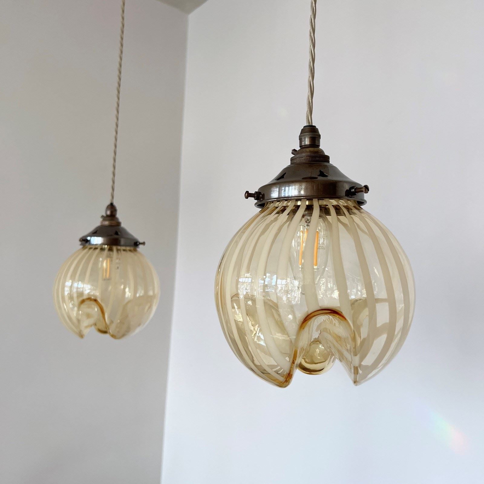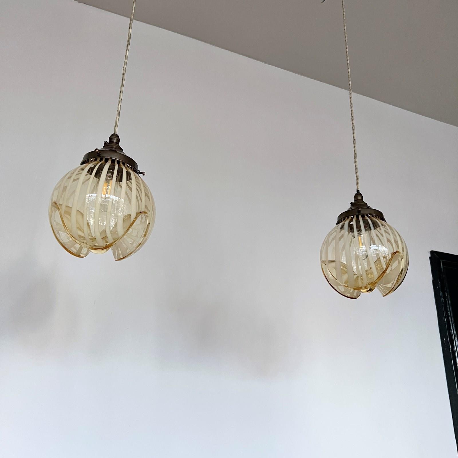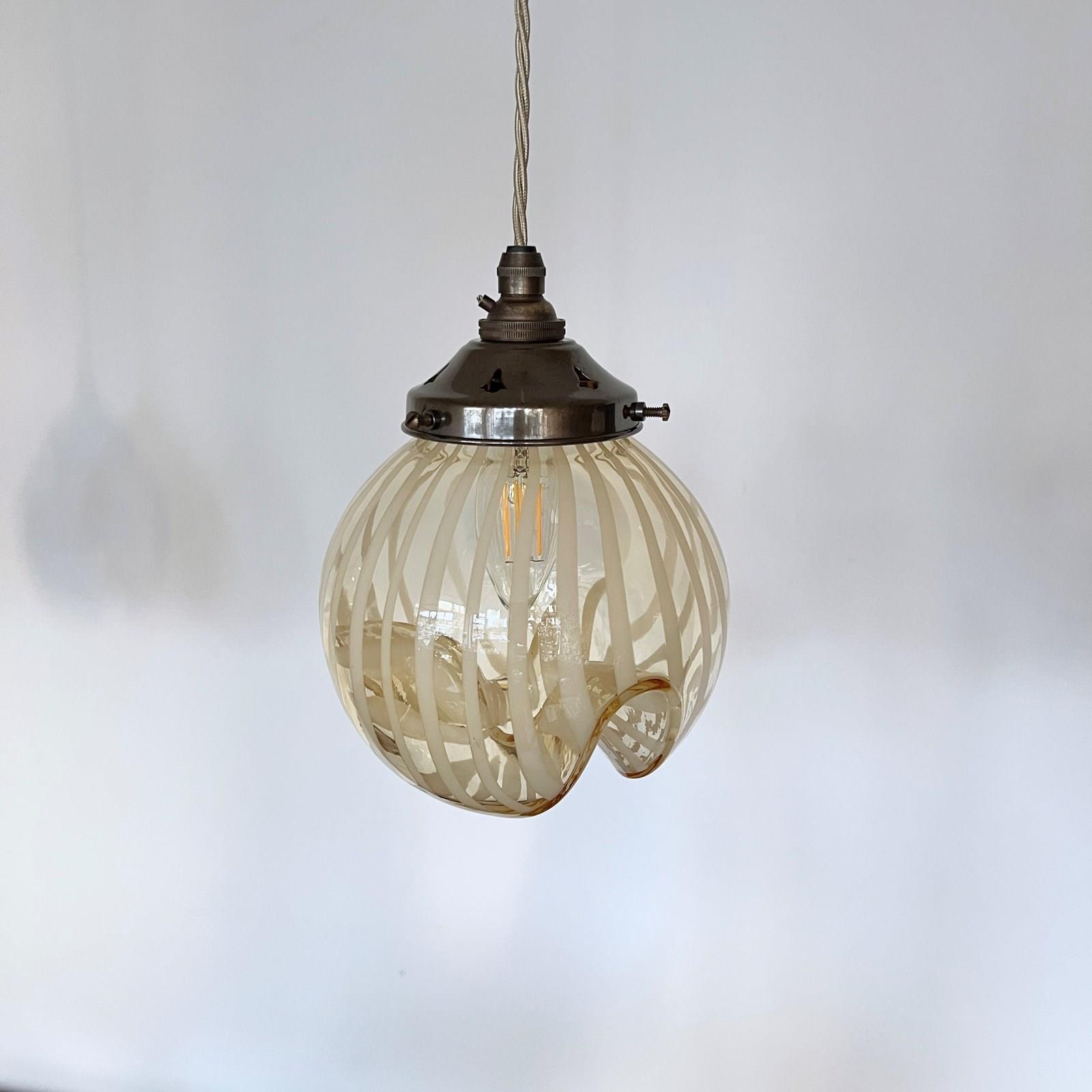 Beautiful Murano enclosed glass shades with striped amber glass detail. Each rewired with an antique brass fitting and beige braided cable. Each shade requires one B22 lamp. The coloured braided flex can be changed to your preference and a matching ceiling fitting is supplied.